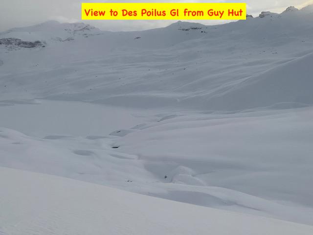 Visibility was poor until late afternoon on March 3 when the skies briefly cleared, We quickly skied down to Des Poilus Glacier in the setting sun while we could see! As we returned to the hut in the twilight, moderate to strong Northerly winds were transporting the 25cm’s of low-density snow in plumes along the ridges. We observed numerous dry loose and some shallow slabs avalanches, triggered by rapid wind loading. By morning the wind had eased off, it was clear, calm and cold the next 3 days!. The snow remained surprisingly undisturbed on most slopes.