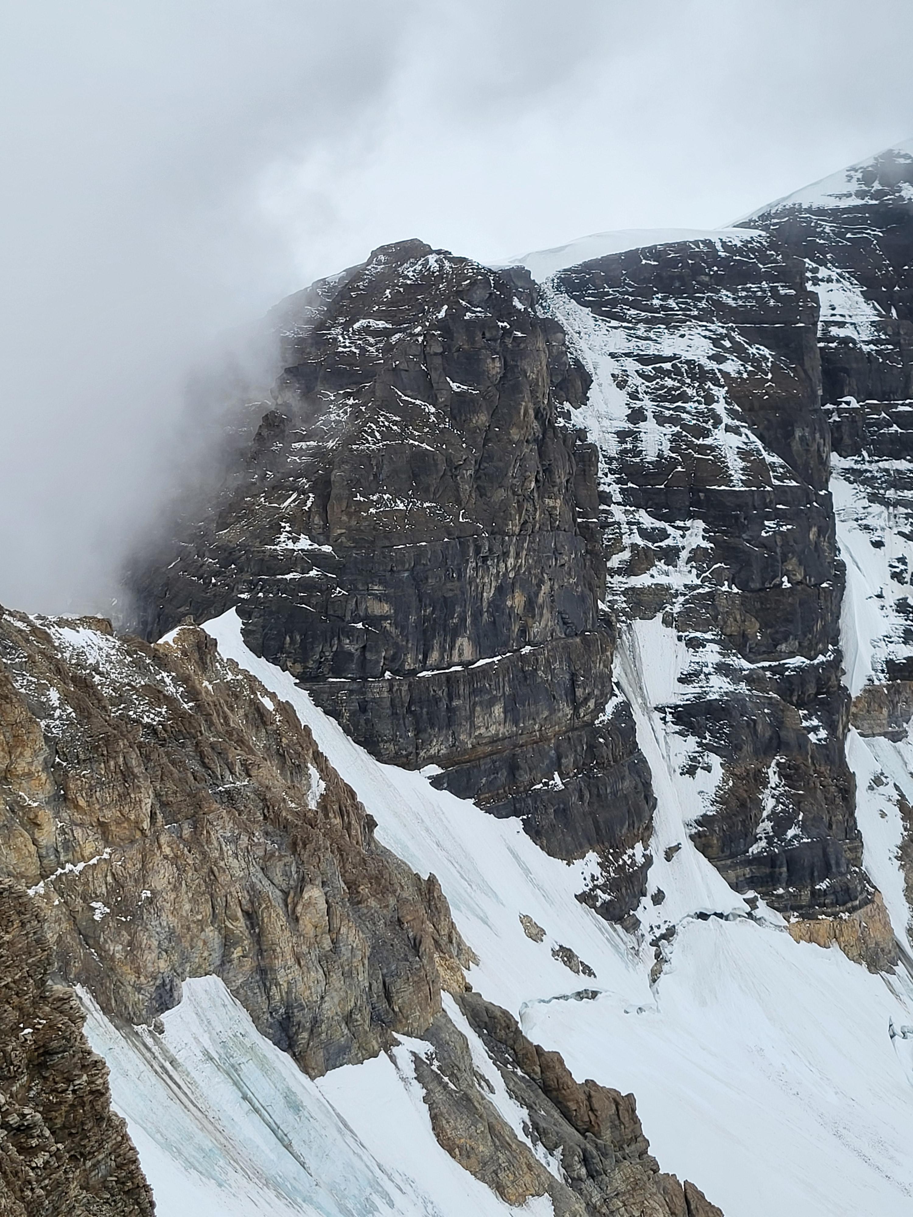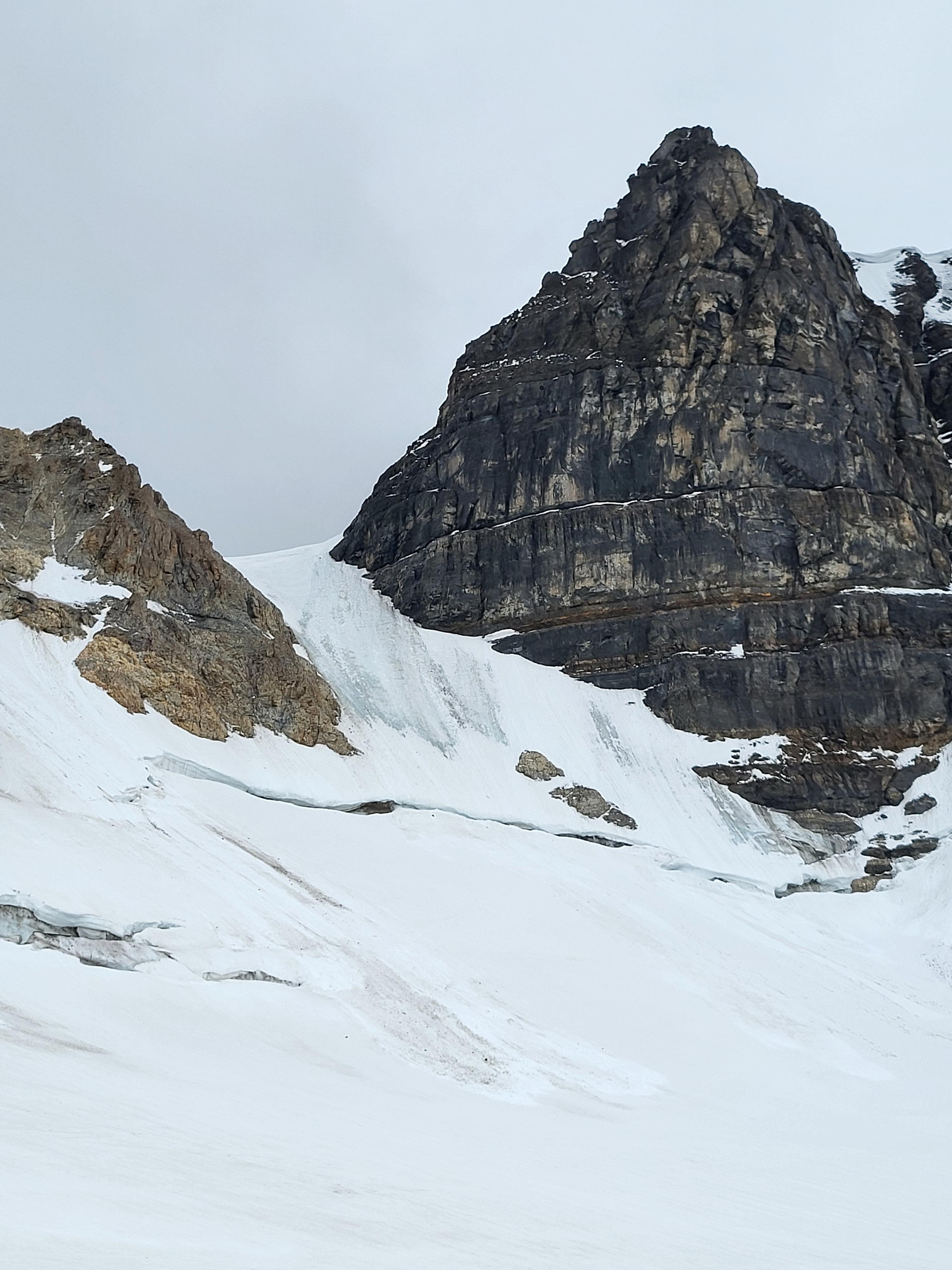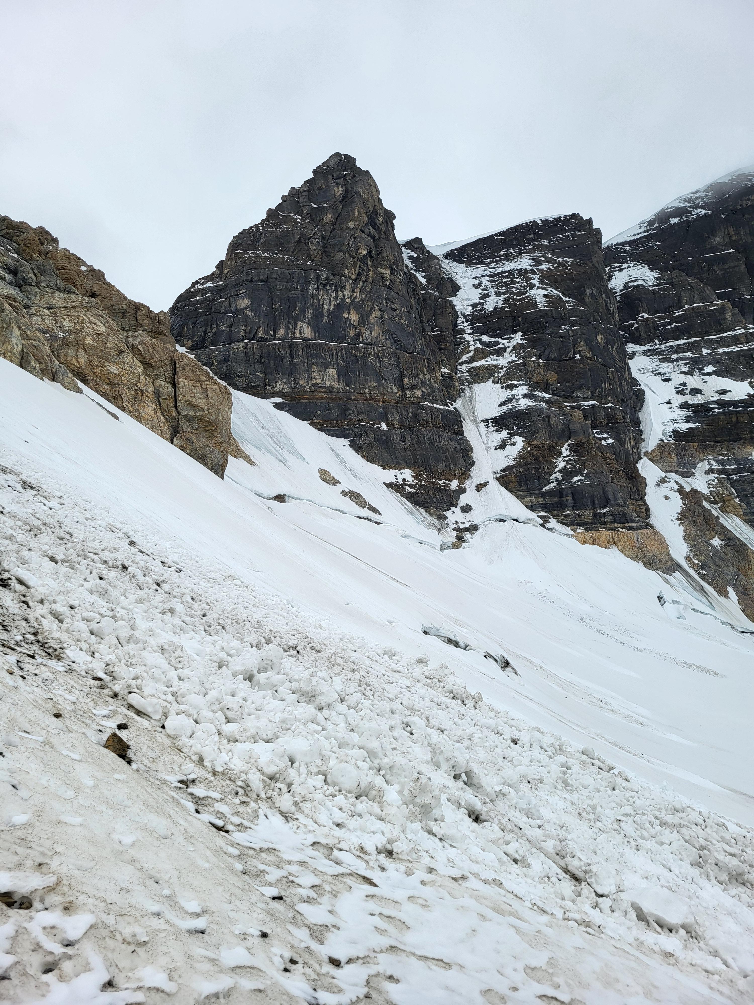 The Athabasca side had some good, continous snow ramps all the way up, that had avalanched up to size 2 the previous 1-2 days. Unfortunately there had been no overnight freeze, heavy rain to ridgetop that morning, and it wasn't clear what snow remained above, so we took the scree bash going up and left that was all dry.