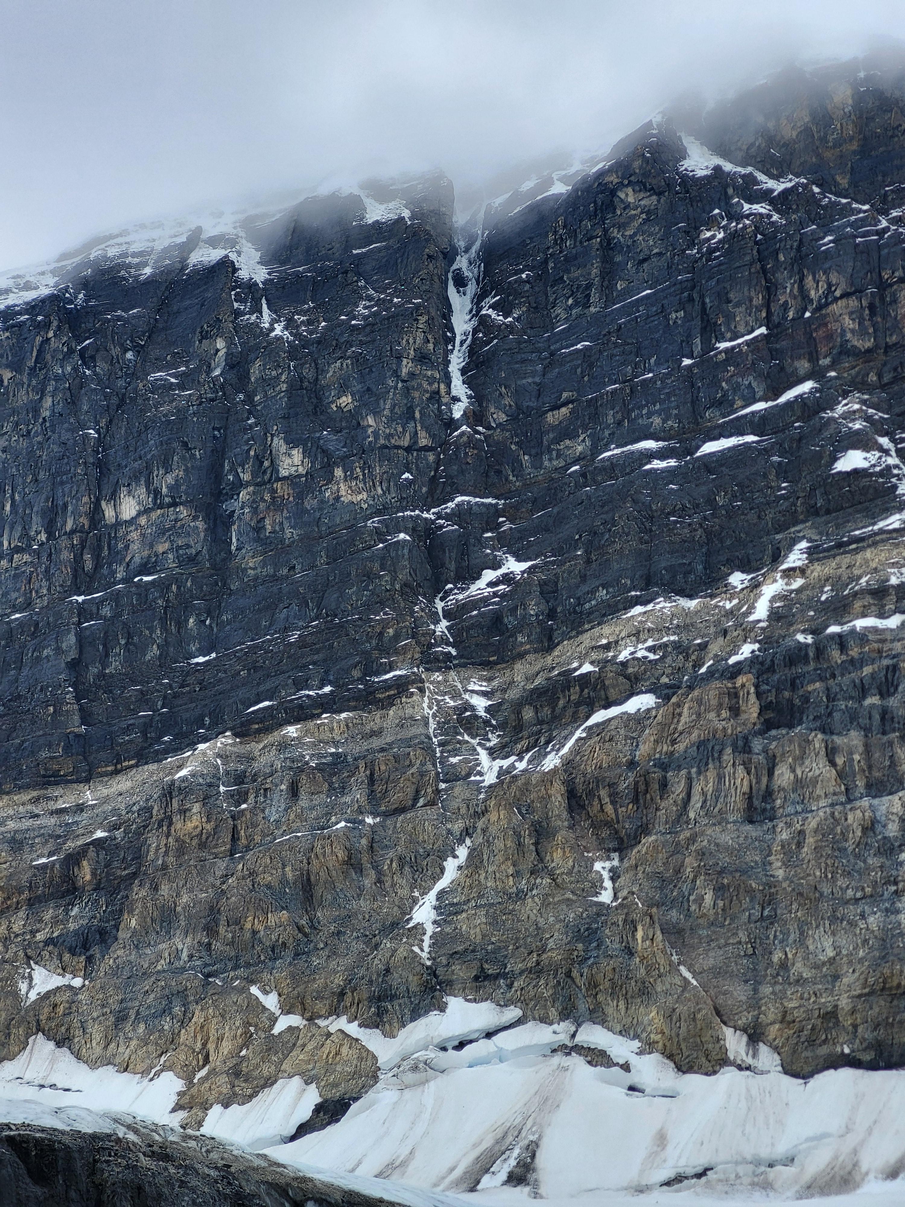 On return, we noticed the trail skirts the edge of the steep morraine very closely while approaching the ice coach road. One steep morraine feature that was yellow, overhanging below the trail, and shedding rocks continously, high up above the coach road, seemed to be ready for take-off. On the flat morraine above, many new sagging cracks suggest the feature is peeling off. We gave it a wide berth by staying far back from the edge.