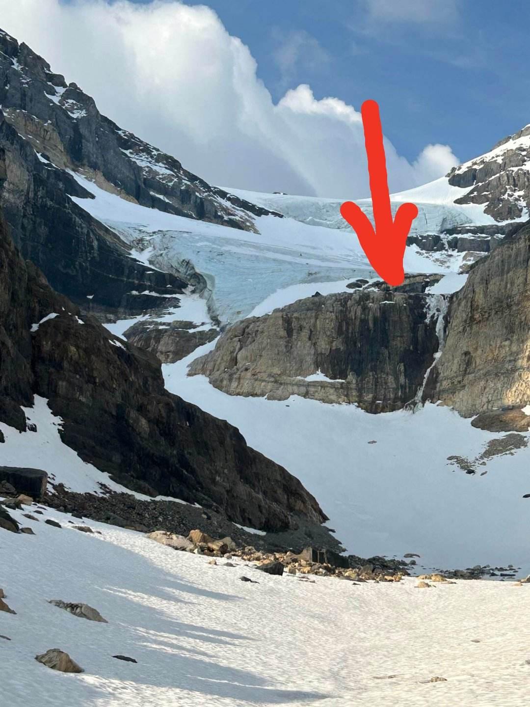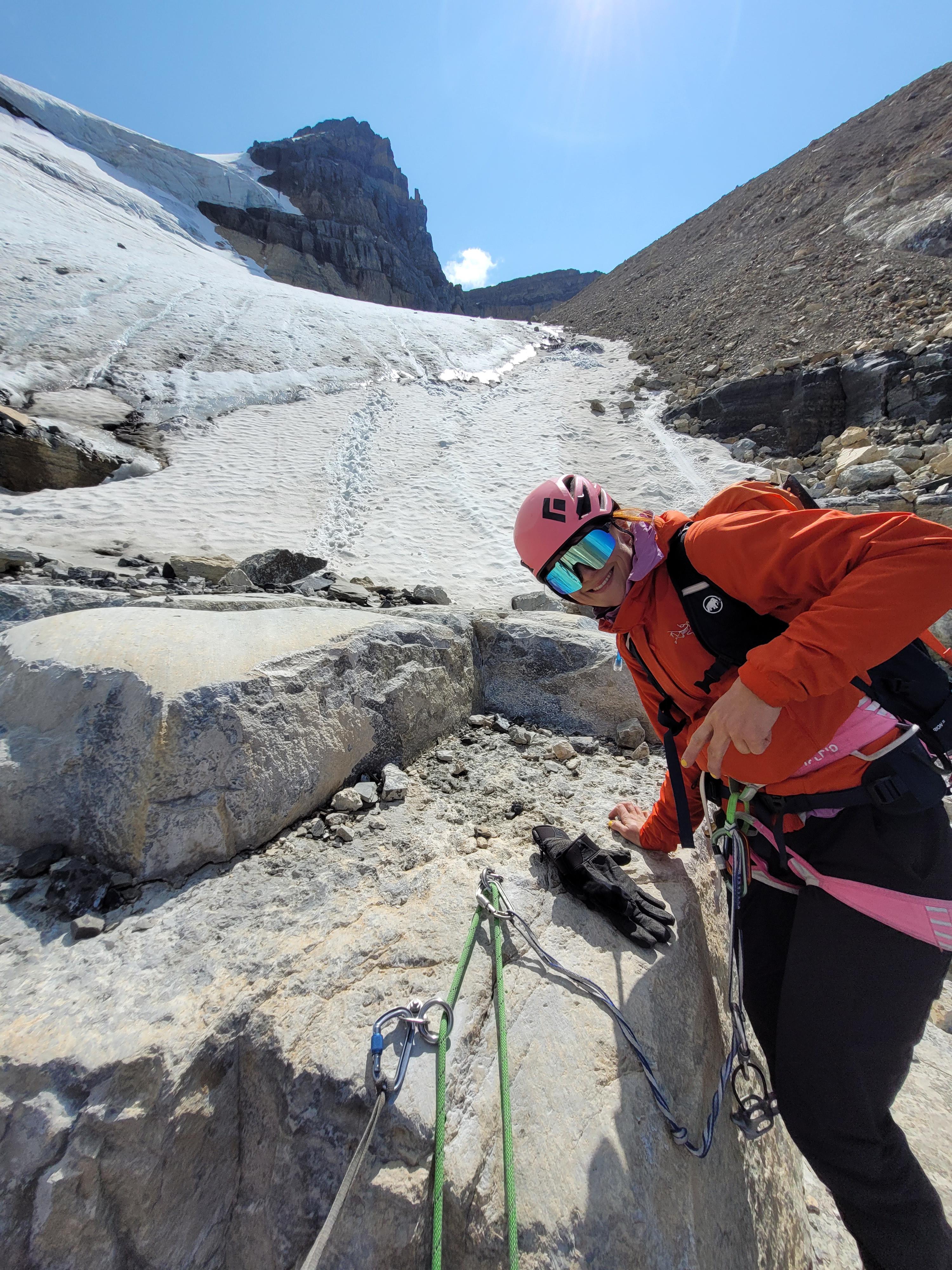 First station (pic 1) is on the first bench when coming straight down the main glacier, about 10m right of the rock rib and creek/waterfall pouring off there. Once on the lower, larger bench, walk to the far side of the large black boulder (pic 2). From there, 3 raps take you to the morraine covered lower glacier tongue