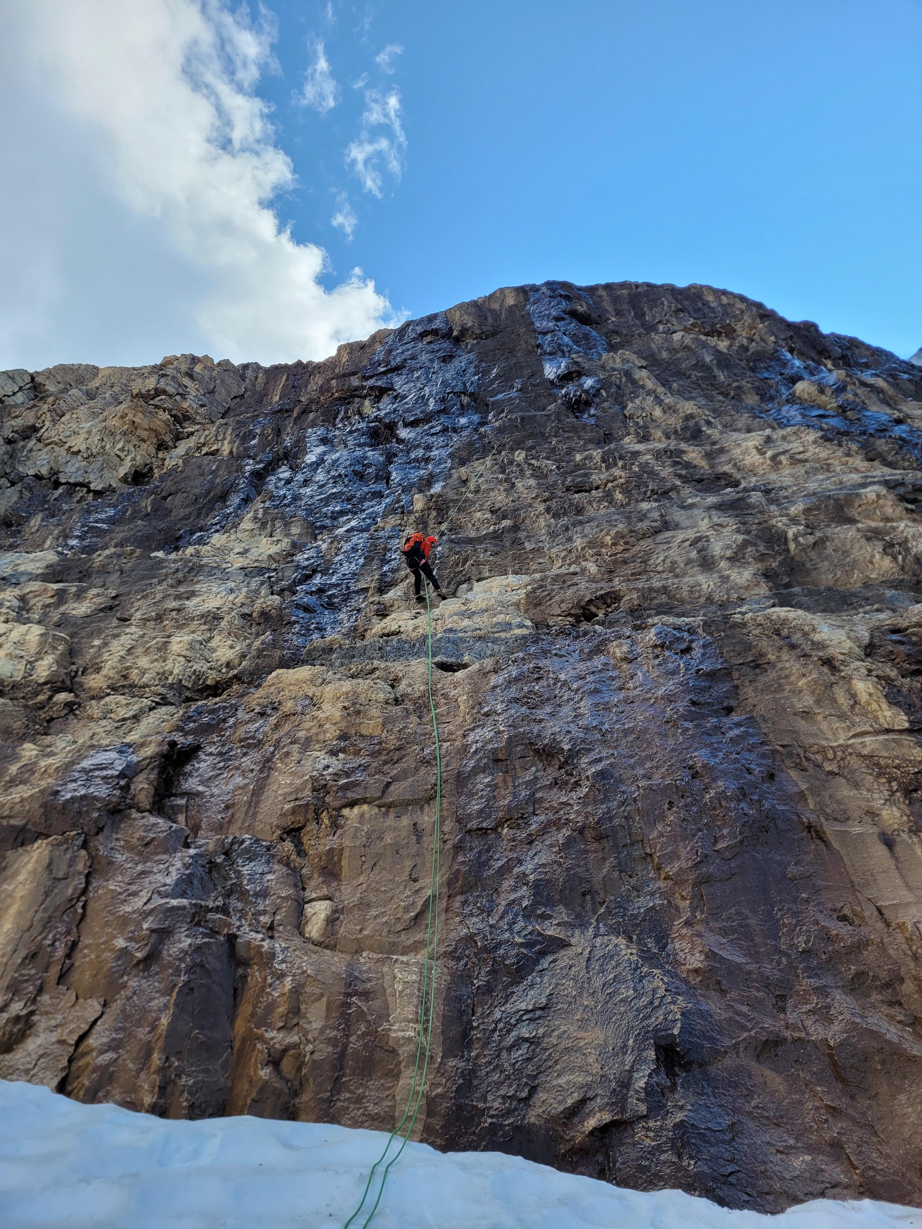 Aberdeen glacier was in surprisingly good condition while coming down pretty late at 13h30. The raps on ice anchors from the col were clean, we stayed about 10m right of the rock edge. On the last rap it is possible to swing right, avoid the loose blocks stacked on the edge, and get over the schrund without being exposed to them. The lower glacier is bare ice.