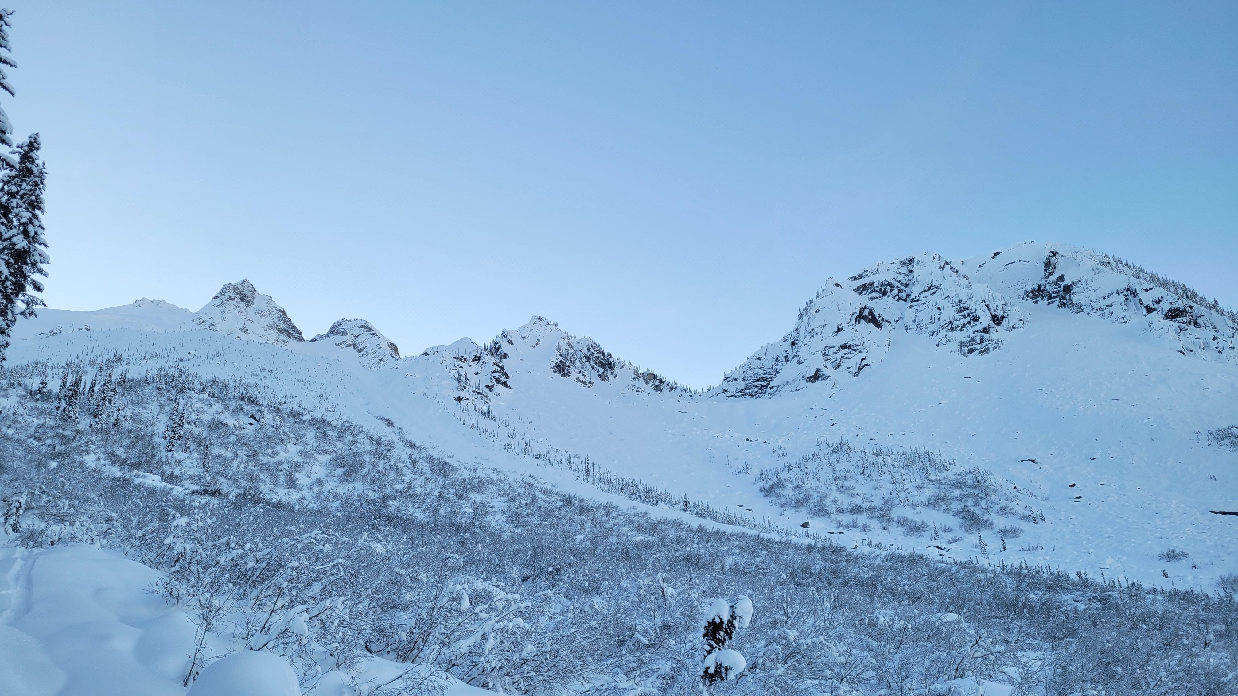 Other hazards included open creeks, rocks, and heinous alder. Small cornices are beginning to form.