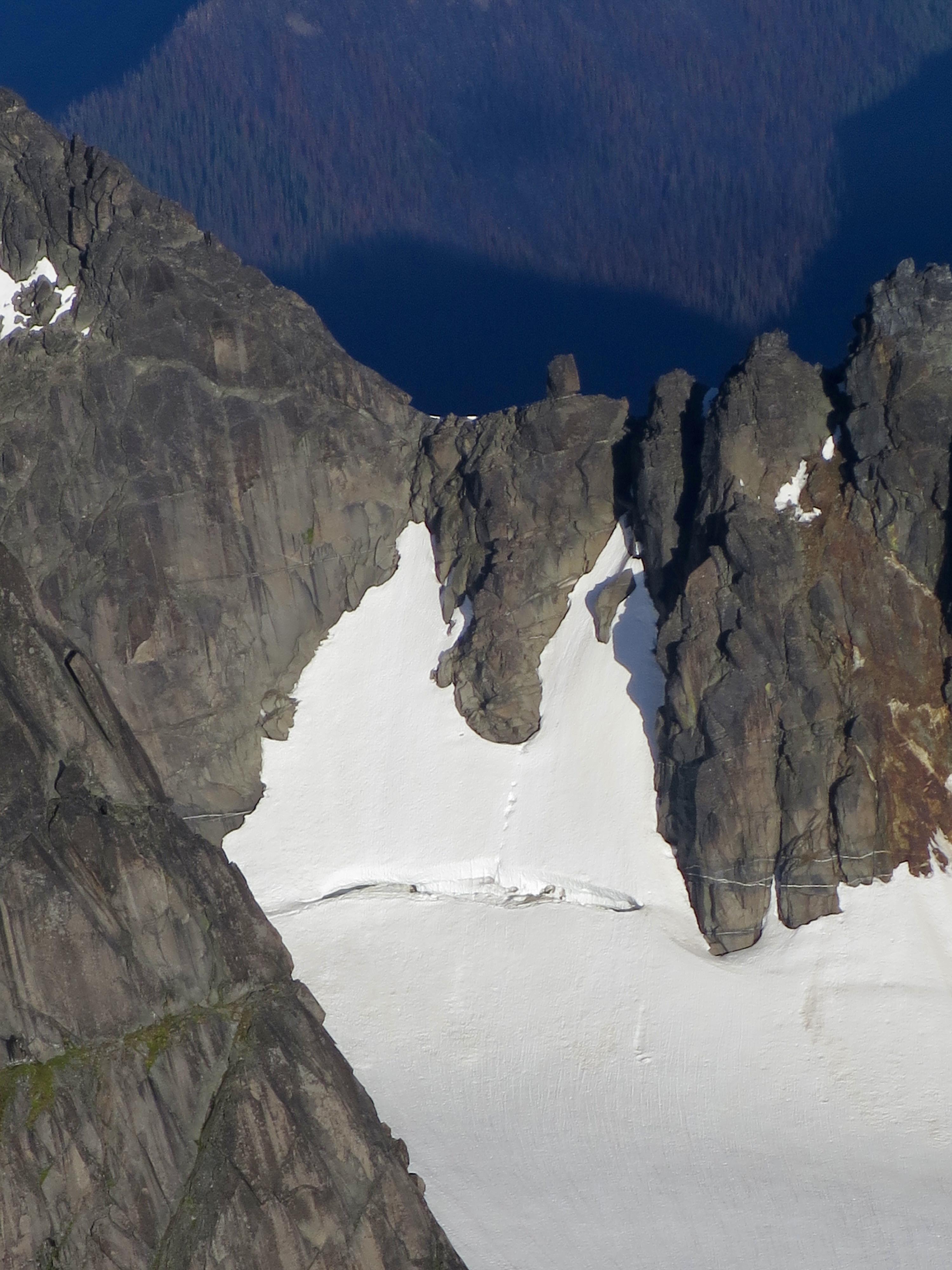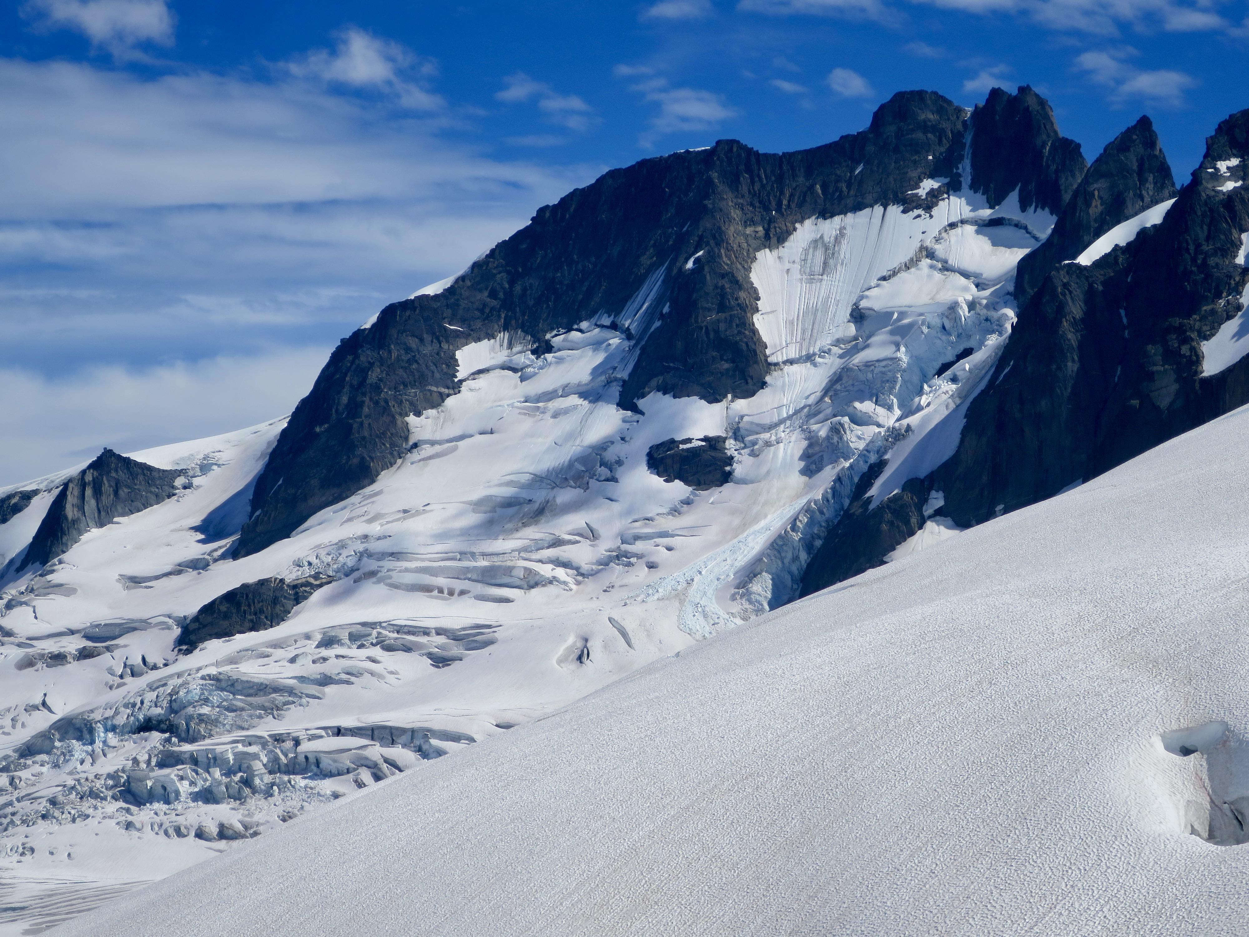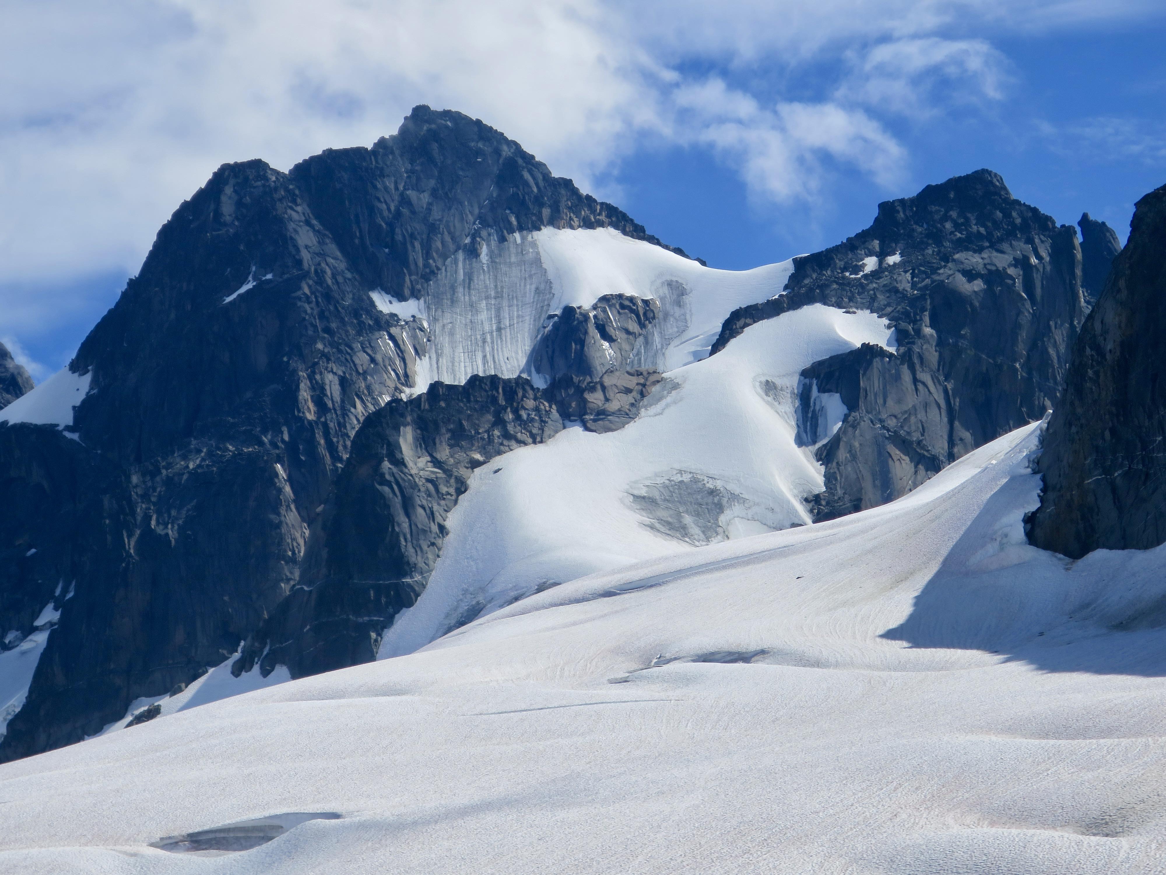 2. Old photo (July 22nd) of the Adamant-Blackfriar Col taken from The Ironman. Glacial recession has resulted in this being very steep and loose for the first few 5-7 meters. I tried 4 different routes and bailed on each one due to either steep and wet rock, down-sloping jenga-blocks, precarious rope cutting flakes that were difficult to climb around, or scarcely protected slabs (I didn’t have rock shoes with me). I’m not saying it’s impossible, just be prepared for more than an easy scramble.