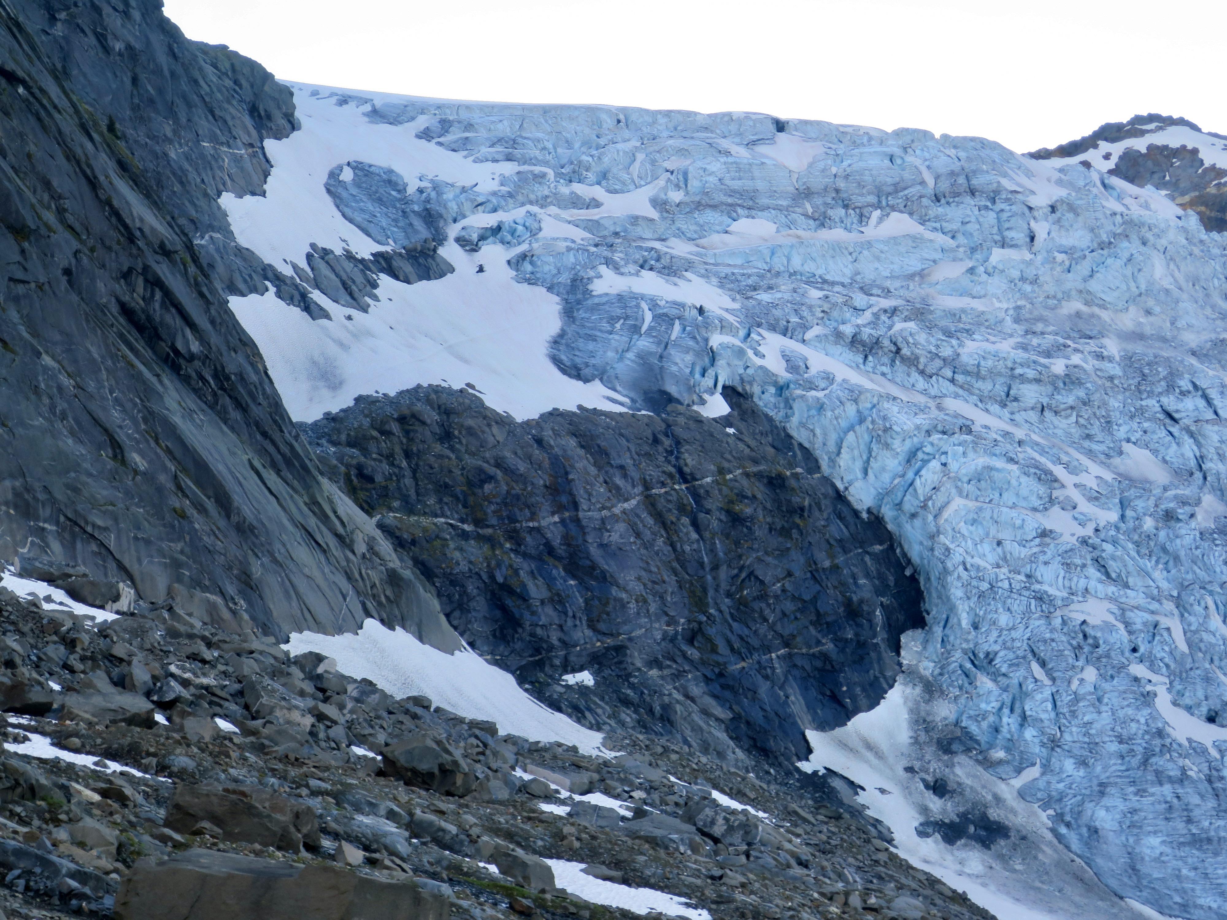 3. The toe of the Austerity Glacier (photo taken yesterday) flowing into Austerity Creek has become significantly more difficult and dangerous in the past week. Earlier in the summer it was a relatively safe and easy walk up and down, but no-one wanted to walk up there in the past week due to overhead rockfall hazard (from a gully hidden in the photo). The descent taken yesterday required 4-6 rappels/lowers to avoid most of the overhead rockfall hazard on the climbers left. The upper rappels were from ice anchors, but the lower rappels over the rock-slabs (4 x 30m) marked with cairns remain set up.