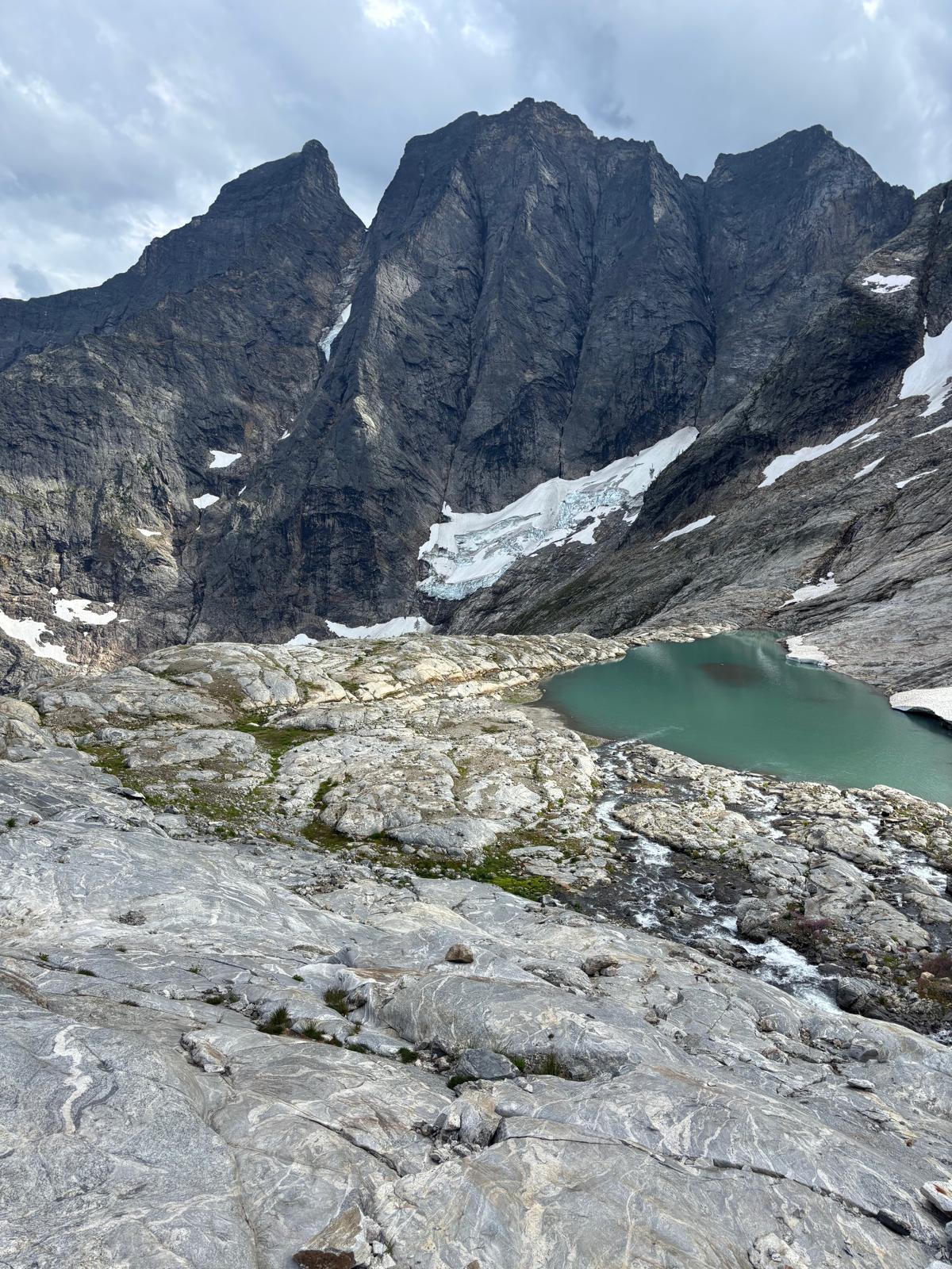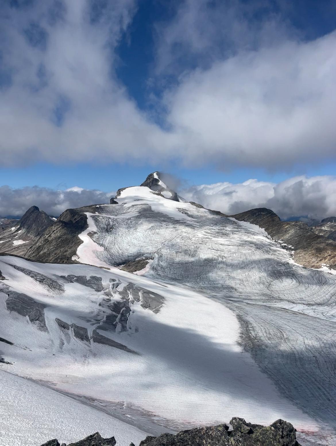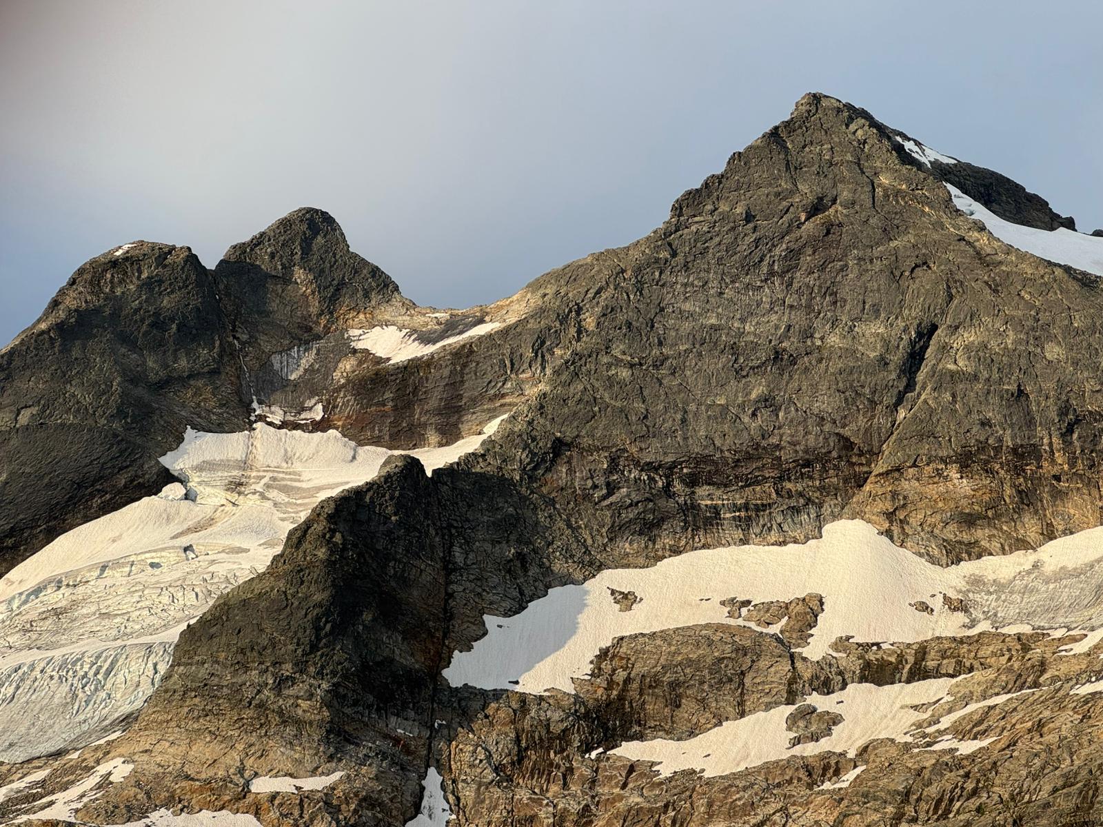 Glaciers in the area are holding snow on north aspects above 2600m, but are otherwise dry. The bergschrund on the north face of Hugin is currently still passable. Ridges are in reasonably good shape with expected amounts of loose rock on otherwise good blocky gneiss. We fixed up rappel anchors to descend Hugin and Munin. We would recommend the NE Ridge of Hugin and the E Ridge of Mjolnir to future parties in this area.