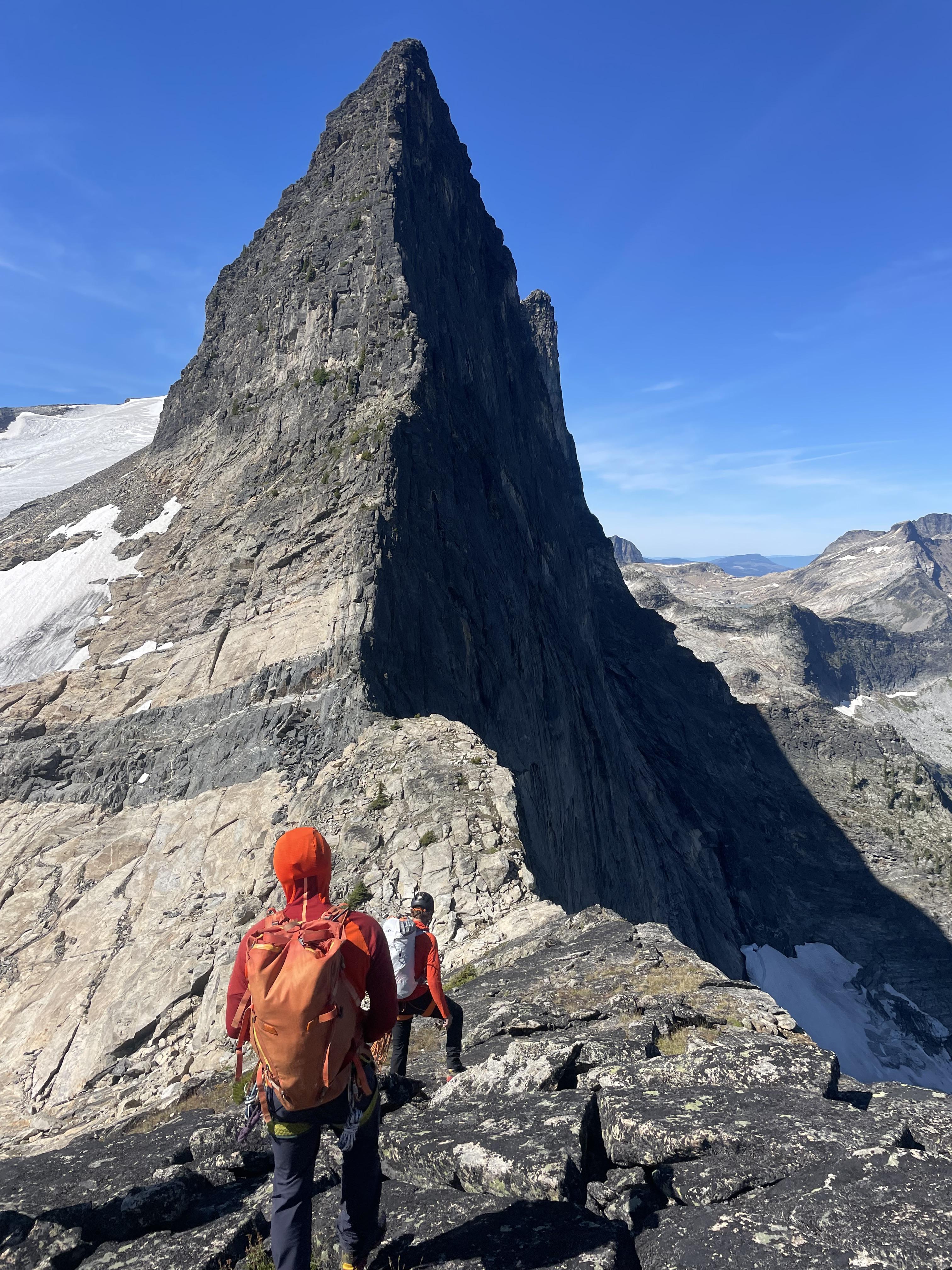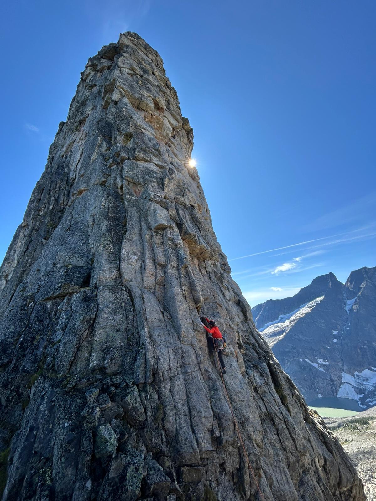 Gold Range: We flew into the Frigg Cirque of the Gold Range on August 19, and climbed routes on August 20-21 before hiking out in the evening of the 21st. Groups climbed Mt Munin via the Goldilocks Traverse and N Ridge, Mt Hugin via the NE Ridge and N Face, Mt Odin and Mt Mjolnir each via their E Ridges, and attempted the W Face (Friggsaw Puzzle) on the main Frigg Tower. Beta for these routes can be found on Alex Geary’s website at https://gearysguiding.com/frigg-cirque/. We established camp on slabs near Moonshadow Lake around 2200m (50.5493°N, -118.0834°E).