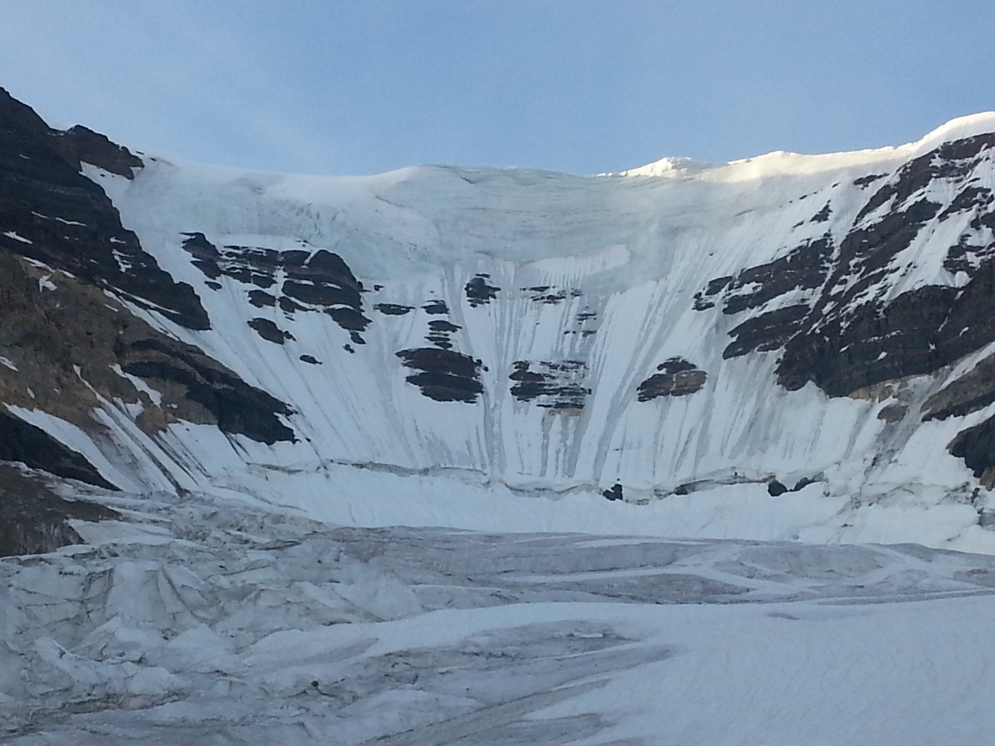 Yesterday we climbed the North Bowl on Mt. Andromeda with Yamnuska Mountain Adventures. The approach to the climb provided complex glacier travel from the moment you step onto the ice. We experienced good firm snow on the northerly aspects all day but solar aspects were a different story with mid-thigh foot penetration to mountain top on south aspects by 11am . Rockfall was also noted as soon as the sun came onto the big slopes. This turned back at least one party from the AA col route on Athabasca yesterday by 0930am.