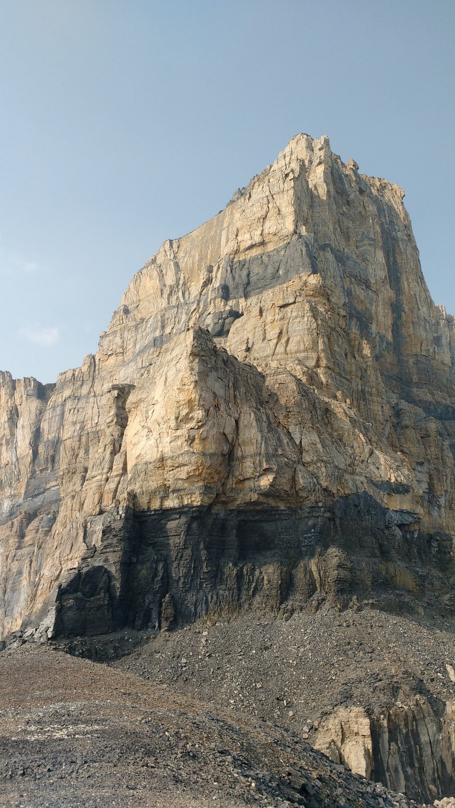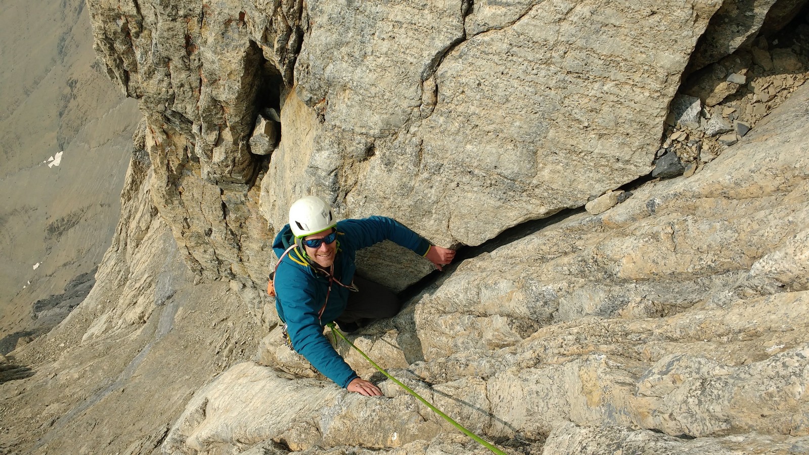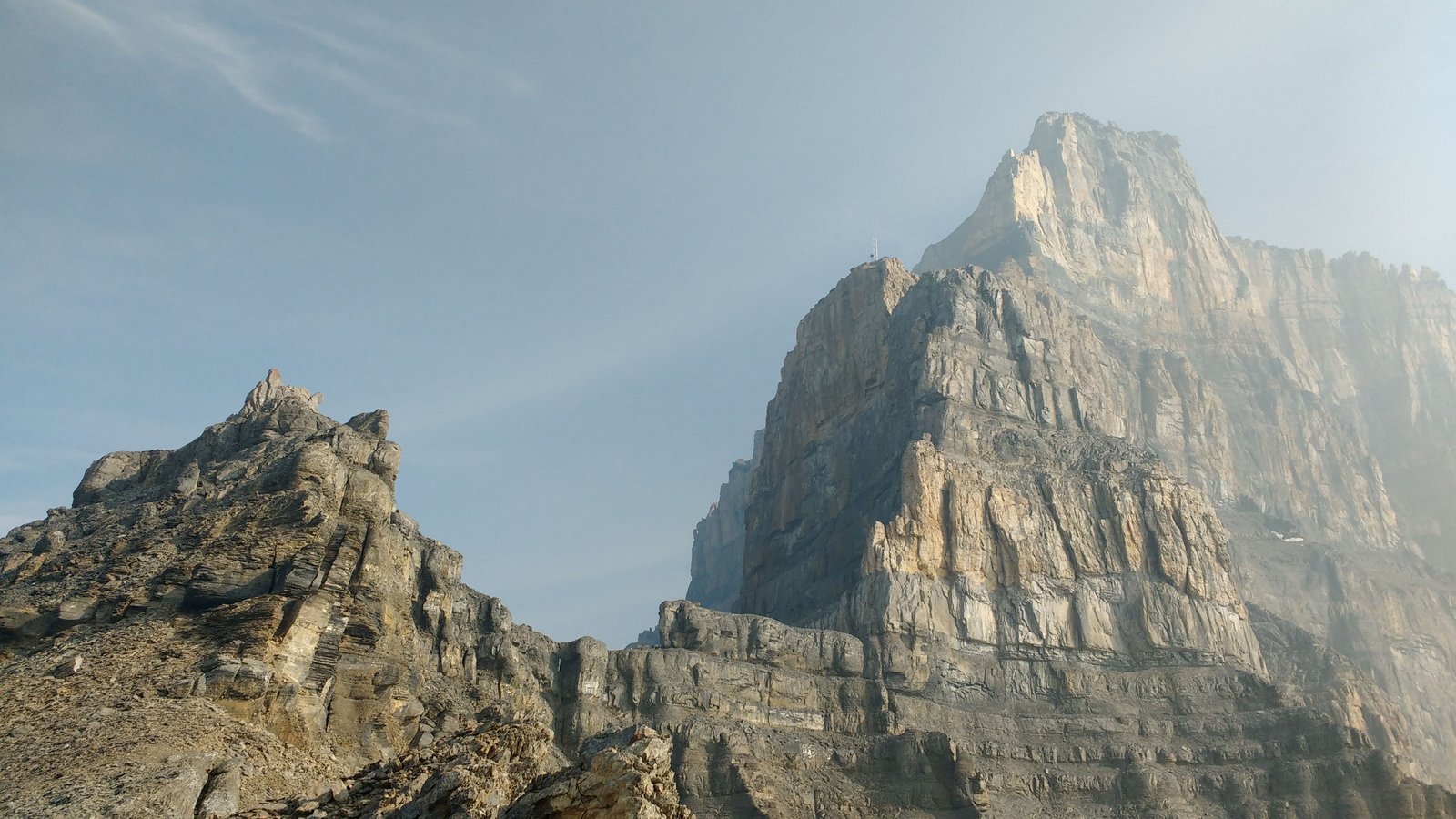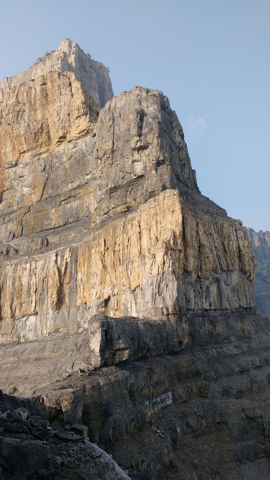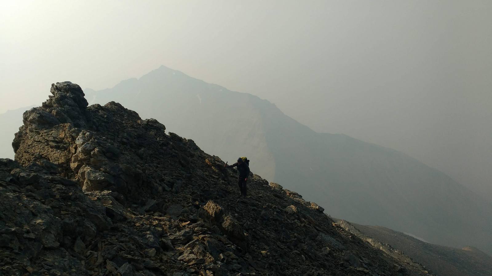 Had a long, smoky but enjoyable day climbing Apollo on the S Ridge of Mt Hector Wednesday with Stan. This is an excellent alpine rock route that offers challenging climbing at its grade. Good gear placement skills and the ability to deal with loose rock are required, but several three star pitches on the route make it very worthwhile.