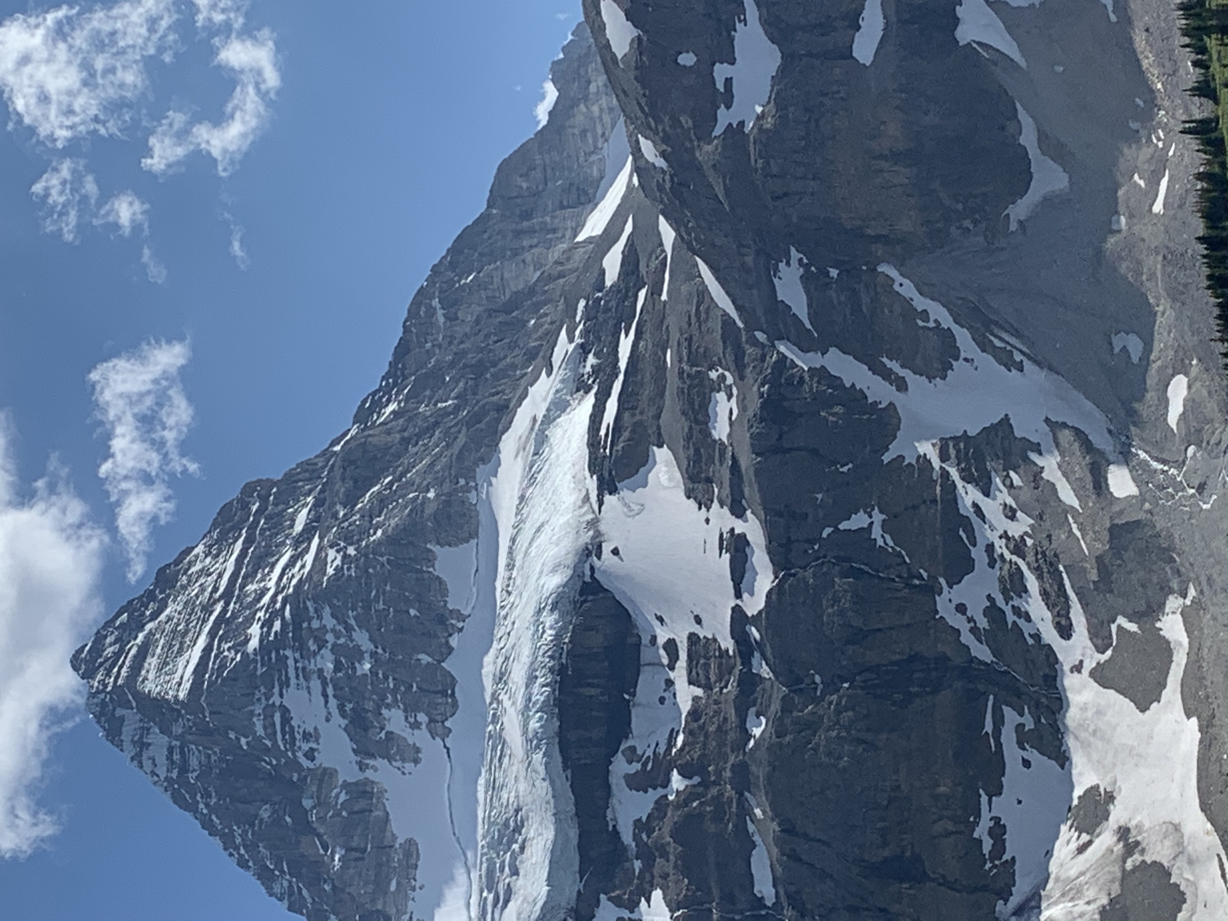Lastly, even though the Hind Hut is closed, if you are thinking about heading for the summit of Mount Assiniboine this summer, I have attached a photo that was taken around dinner time on the 29th. There seemed to still be a lot of snow above the red band on the north face, and certainly on the east face. We observed a very large cornice failure off the east face summit ridge while eating lunch on the 28th and heard audible evidence of similar activity on a few other occasions (without visually observing) during our stay up there. Full disclosure: I have never climbed any of the routes on Assiniboine, I am only providing the pics as observations of snow cover.