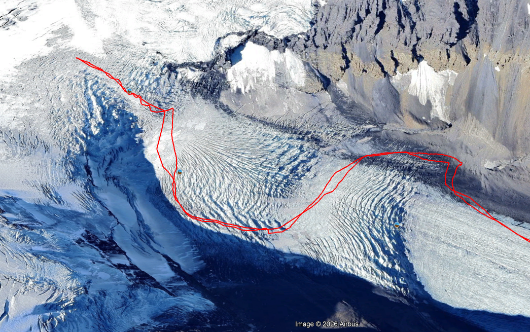 At this time, the route heading climber’s right around the first icefall, then left through the second before gaining the final ramp, is the recommended line of travel (see photos).