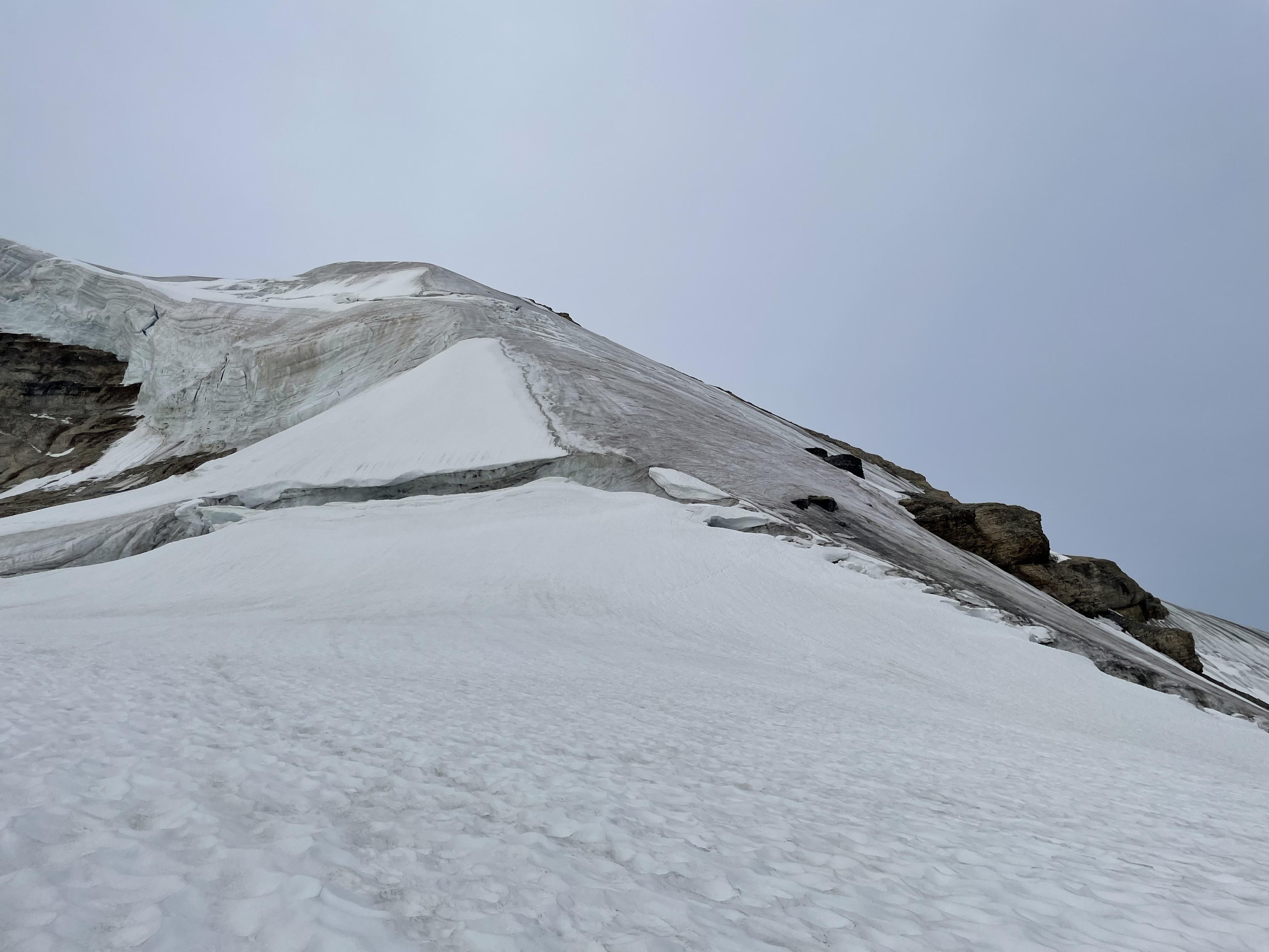The Bergschrund below the Silverhorn was impassible with no usable snow bridges. Access was possible via the ice climbers right of the nunatak.