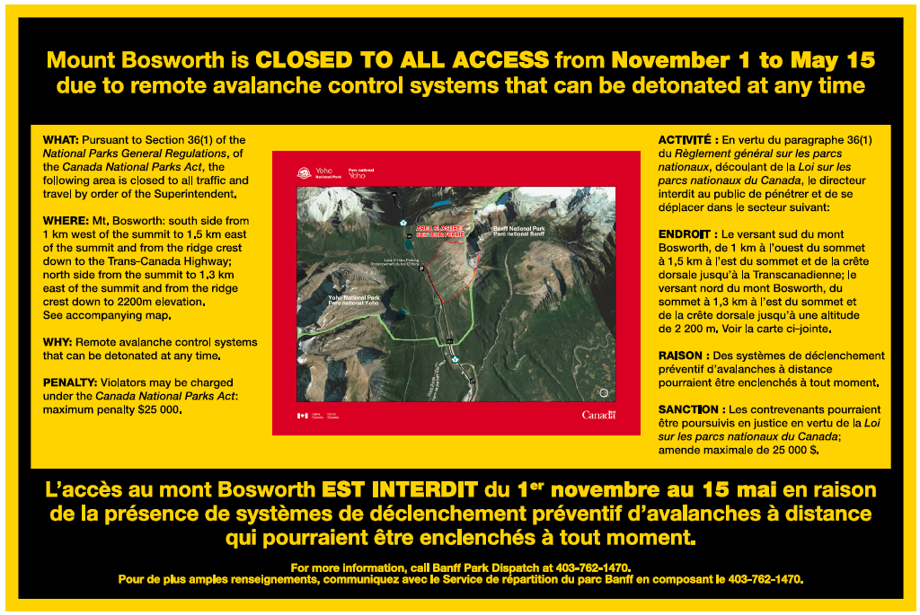 Parks Canada installed remote avalanche control systems on Mt. Bosworth this summer so avalanche control may be conducted at anytime without notice during this time period.
