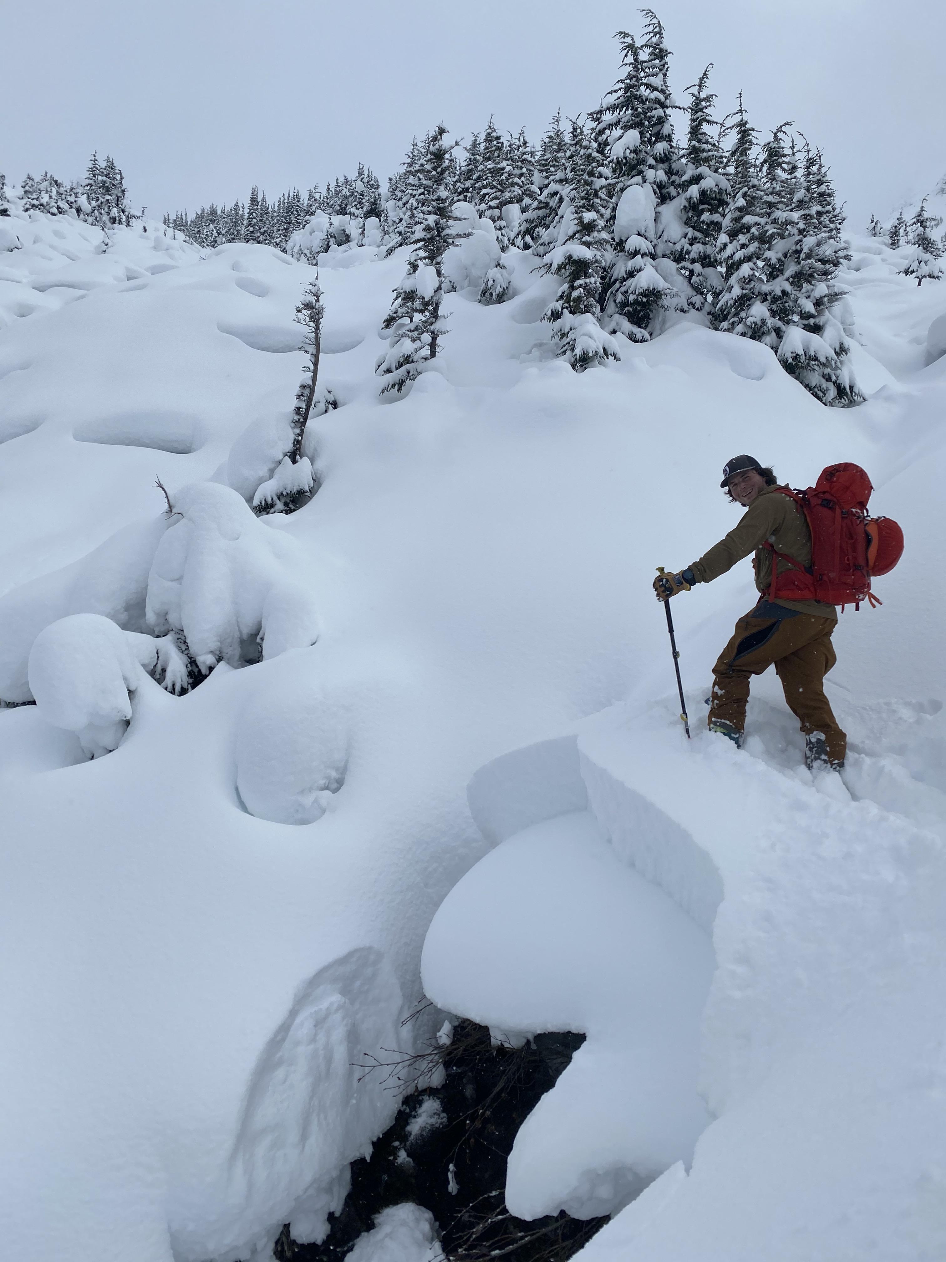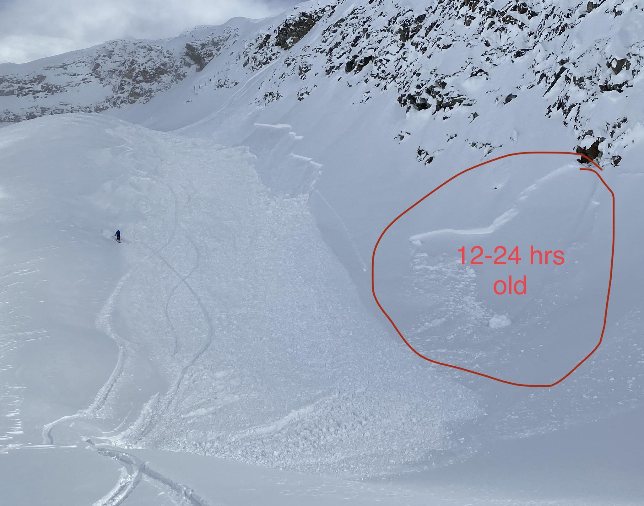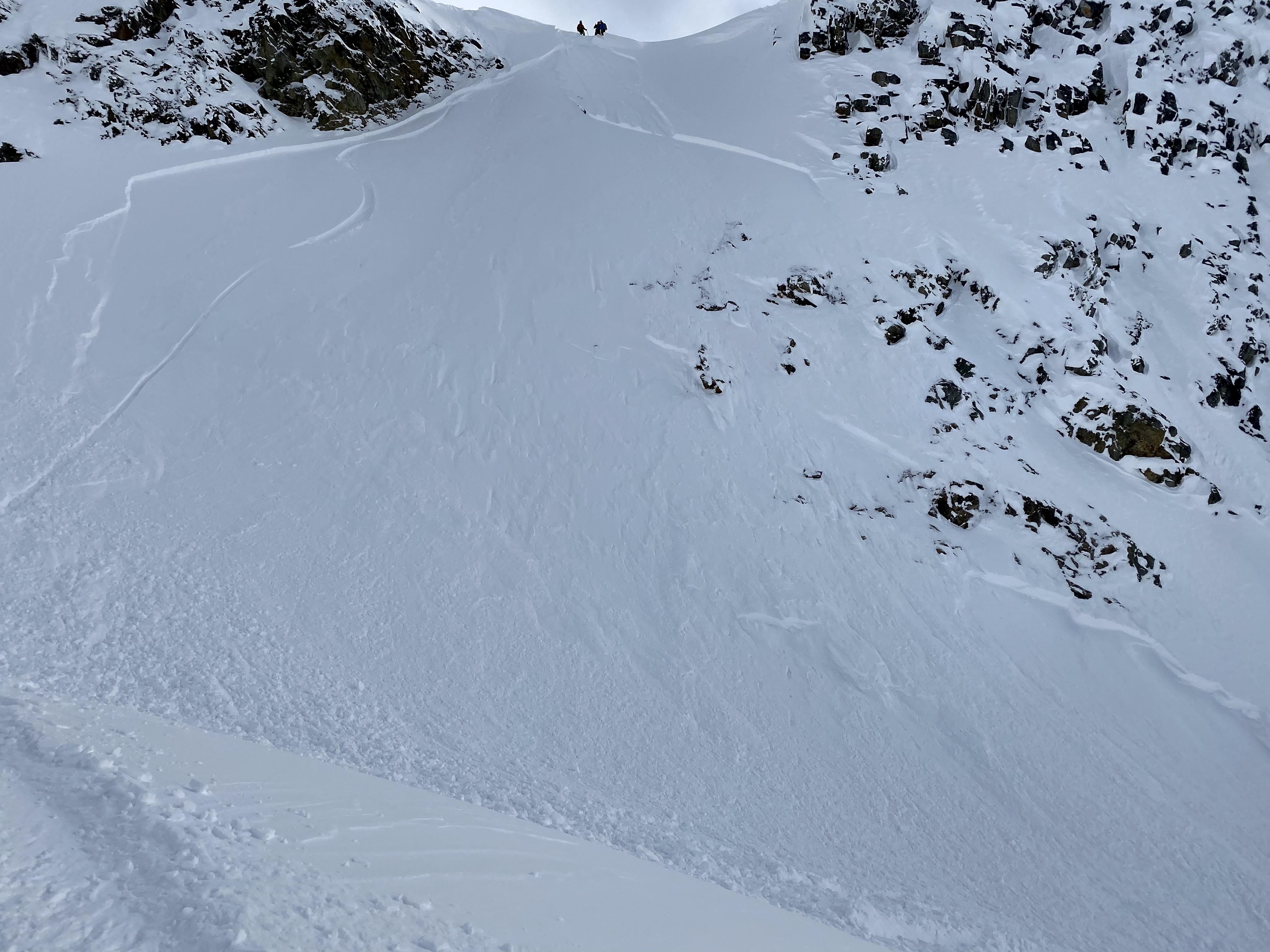 While breaking trail from the practice slopes to the Overlook Entrance we observed cracking and failing on small unsupported rolls. This weakness was down around 40 cms on small surface Hoar. Once above 1800m this problem seemed to improve, but we were cautious with our track exiting that area. In the basin under Sir Donald the snow became slightly wind affect creating a soft slab. It was not reactive where we toured but could be on bigger slopes. We cut a small cornice into the entrance to Overlook basin triggering a size 2 that was ~30-40cm deep and ran 125m (approx). It triggered a couple size 1’s after it turned the corner. We suspect that area received some downflow winds overnight, tightening up the slab. Once below 2000m the skiing was good with no wind affect. However it was starting to become moist it the sun. A thin crust had developed on southerly tilted features coming down off Avalanche crest by 230pm. If you played the aspect it was still quite good.