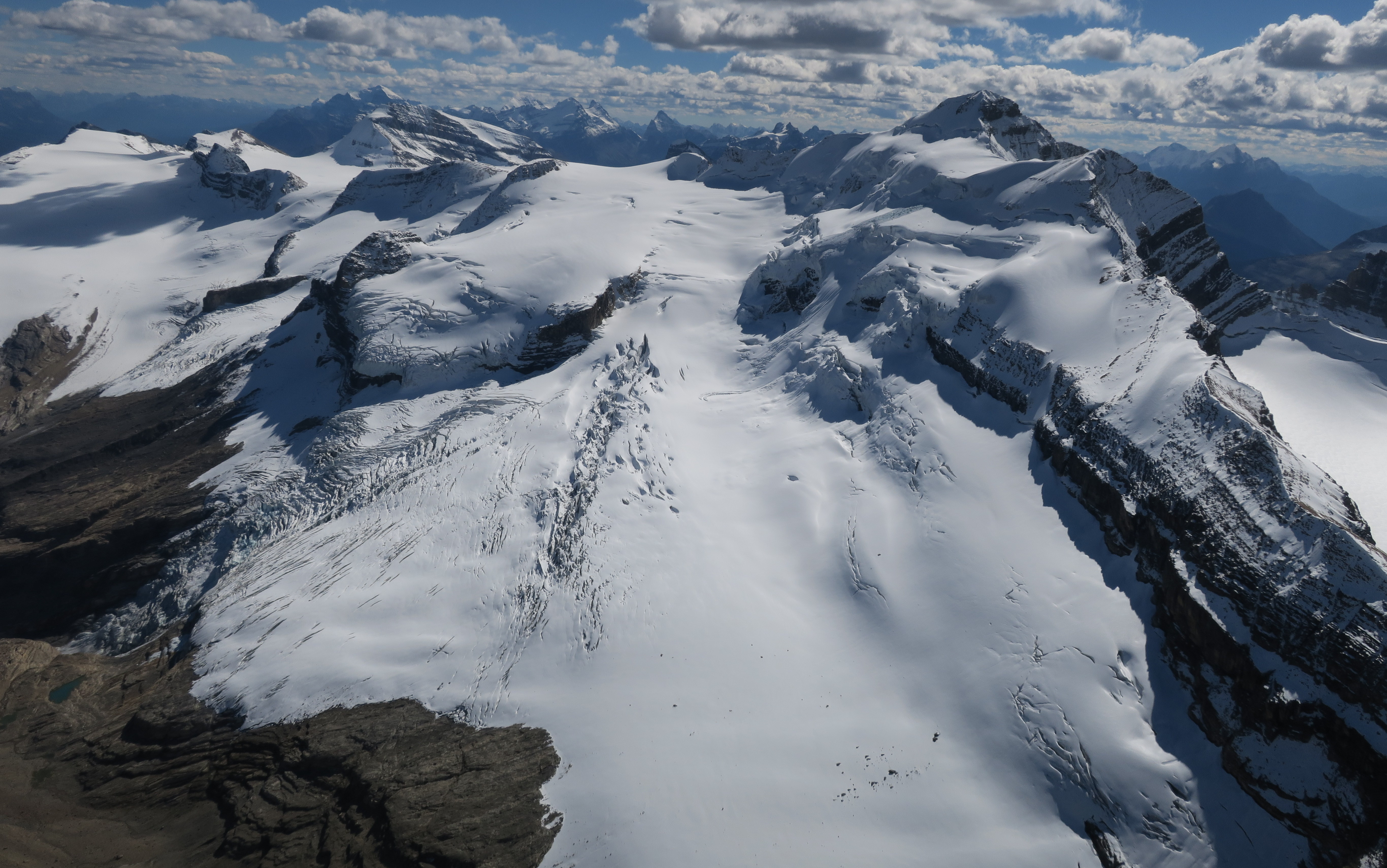 We took a bunch of photos of current alpine conditions, and glacier photos that might be useful while ski touring this winter, during a flight to the Wapta Icefields today.