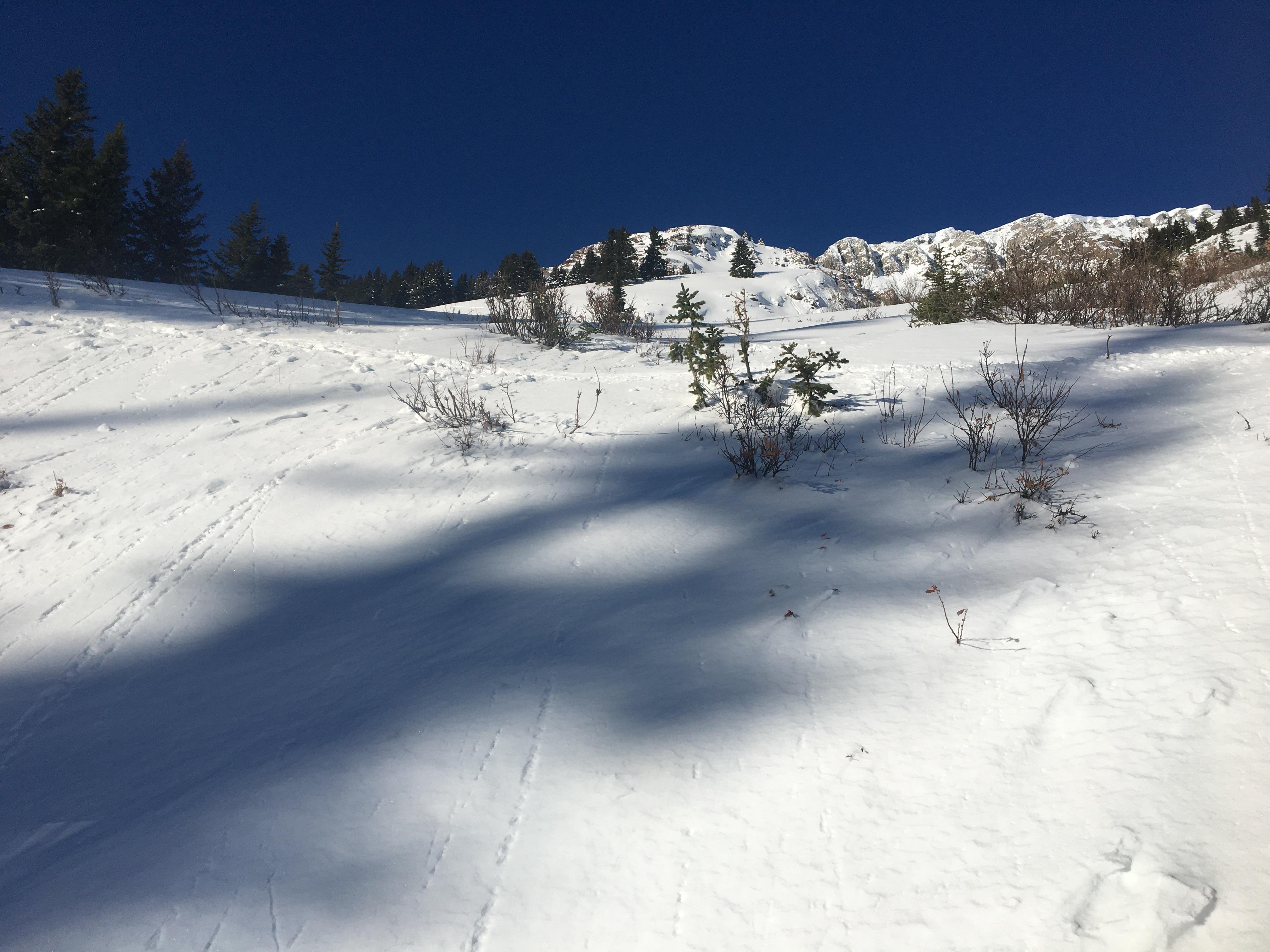 Walked up above the top belay to have a look at the upper bowl (see photos). Both the steeper areas below the climb as well as the chute above the climb had relatively consolidated, but unreactive windslab resting on a thick layer of facets. Definitely something to keep in mind as the week warms up!
