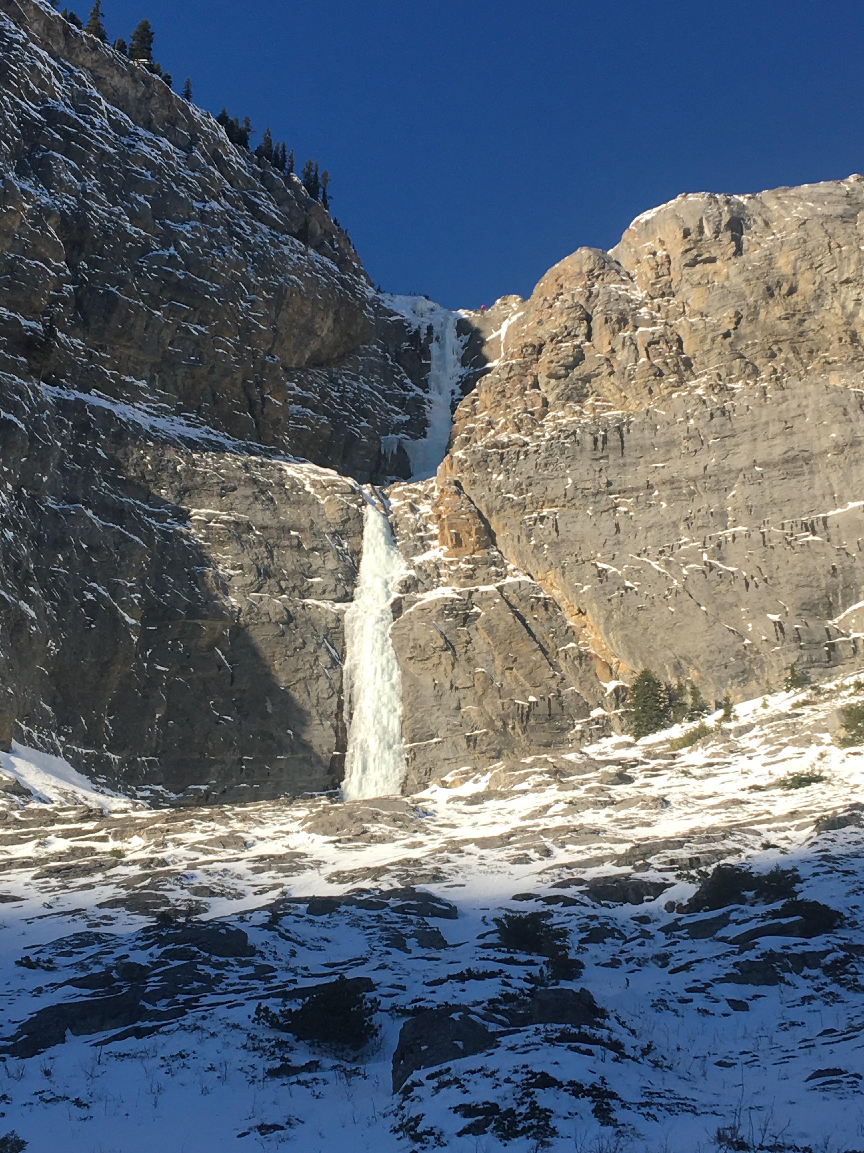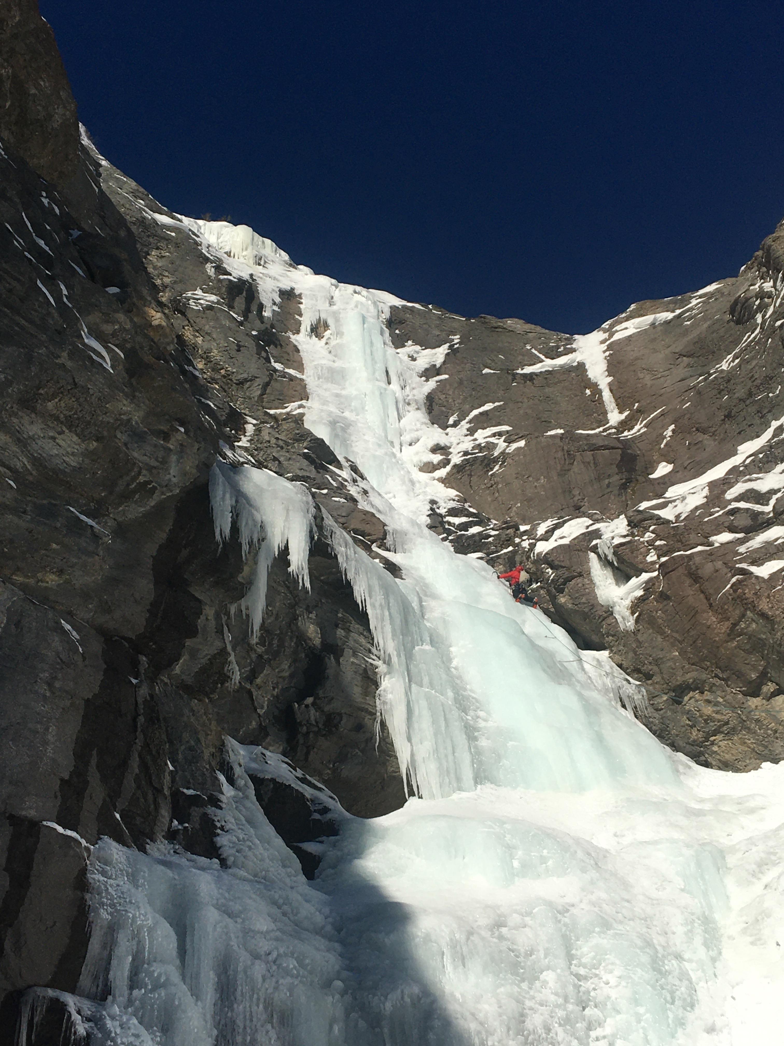 Climbed Bourgeau Left today - first party of two total on the route. The climb is in generally good conditions, with the lower pitches relatively fat. The upper pitches above the halfway ledge are quite sn'icy and challenging to protect in places, and with the sunny day we had today the WI3 was wet and slushy.