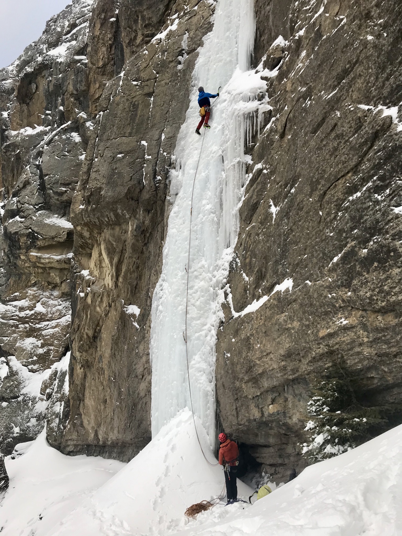 The approach pitches were very thin and didn’t look very appealing, so we opted to scramble around them with the occasional snow covered rock slab making it a bit tedious. Once at the base of the first steep longer pitch of ice we found it fat and good condition to the top of the route.