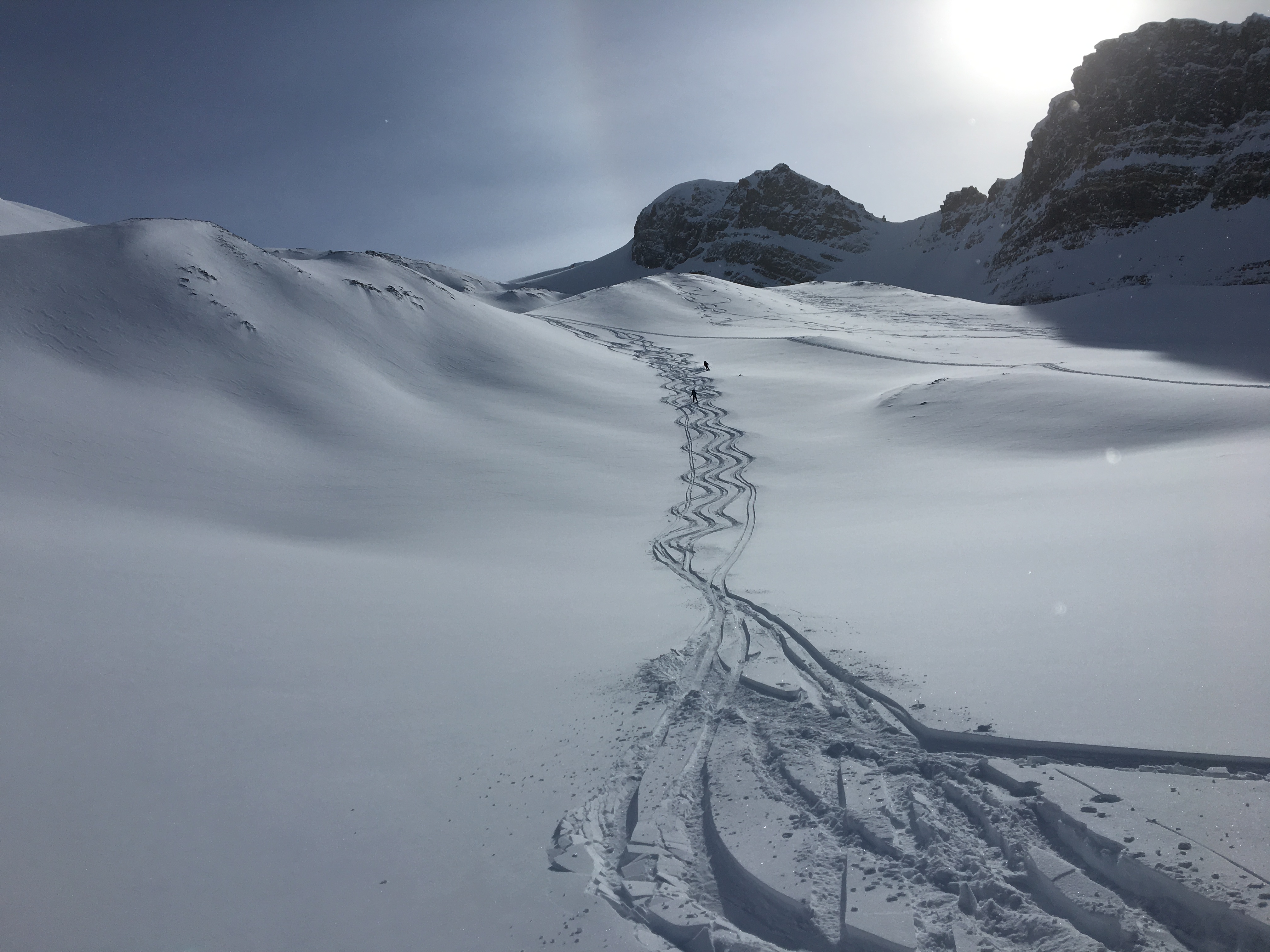 On Sunday (Feb 26) we skied over to the Little Crowfoot moraines before heading down. We had some cracking and whumpfing on our way up and stuck to conservative terrain of 30 degrees or less. We set out with a conservative mindset and didn't challenge any steeper terrain or convex rolls as the 40cm slab over weak facets was still pretty evident here. Plus... there was lots of local evidence of old slab avalanches failing on the persistent weak layer of facets and depth hoar in the immediate vicinity.