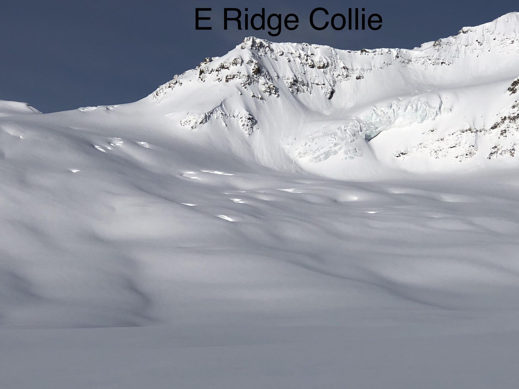 Good coverage on the glaciers with 3m HS in most locations. Heading around the East Ridge on Collie we probed as little as 70cm.
