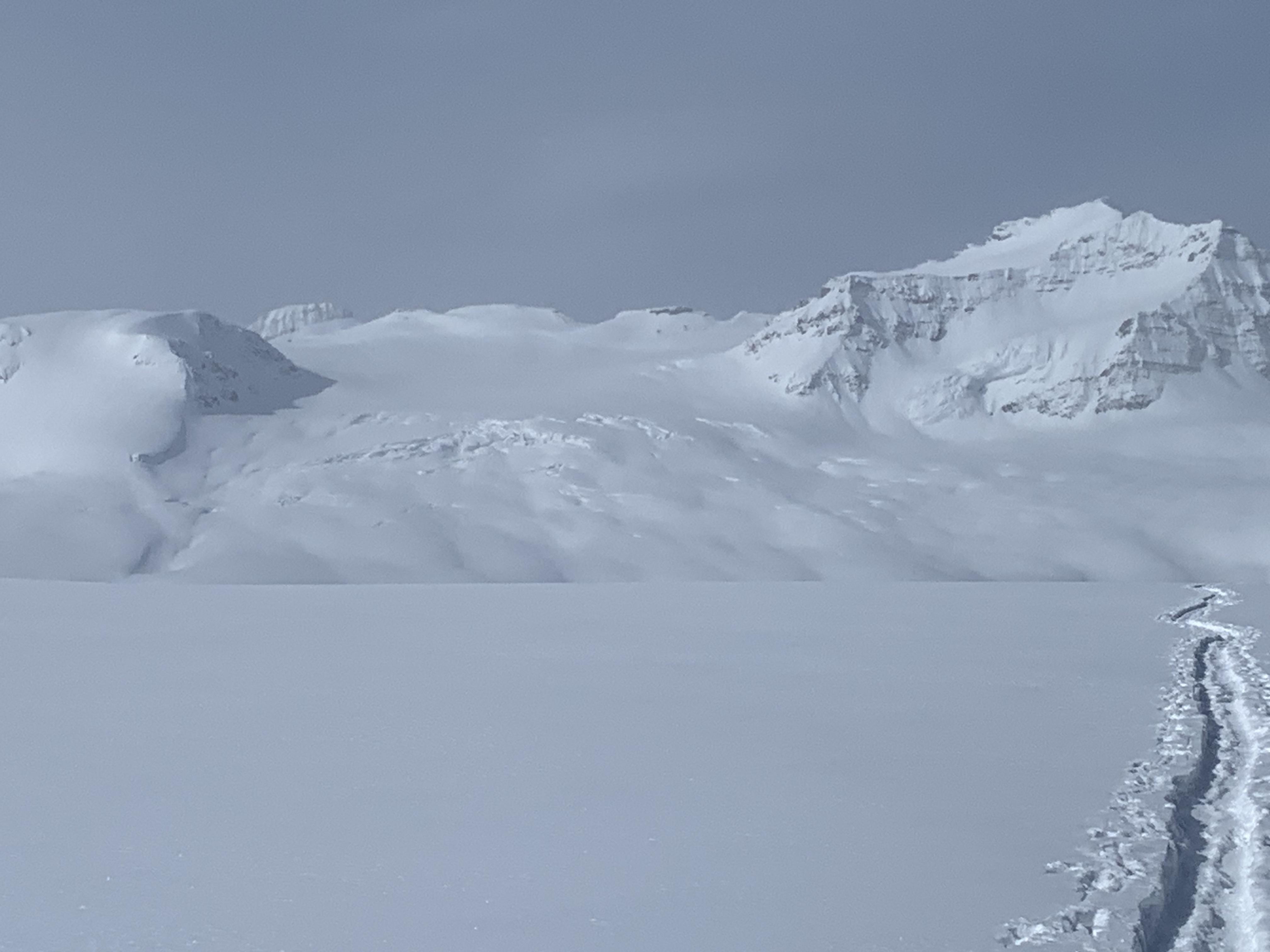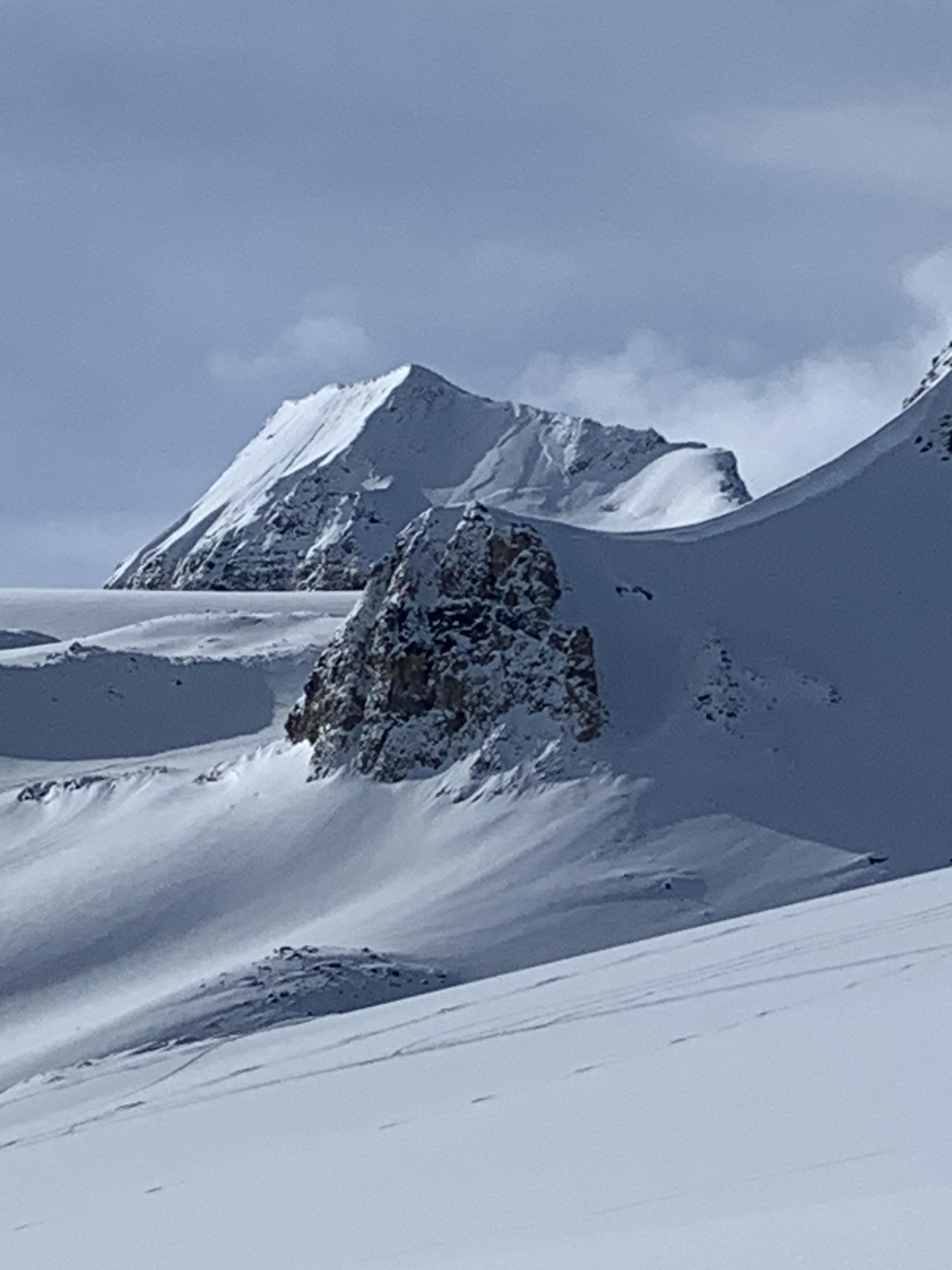 On the 4th we woke up to evidence of a deep slab release off the NE face of Olive Peak (2nd photo), and crossed the Collie Icefall on the lookers right hand side (3rd photo). Temps were still cold (-8 to -5) with clear skies and very little wind, even up high. The summit ridge on Collie looks less corniced and complicated than usual from below.