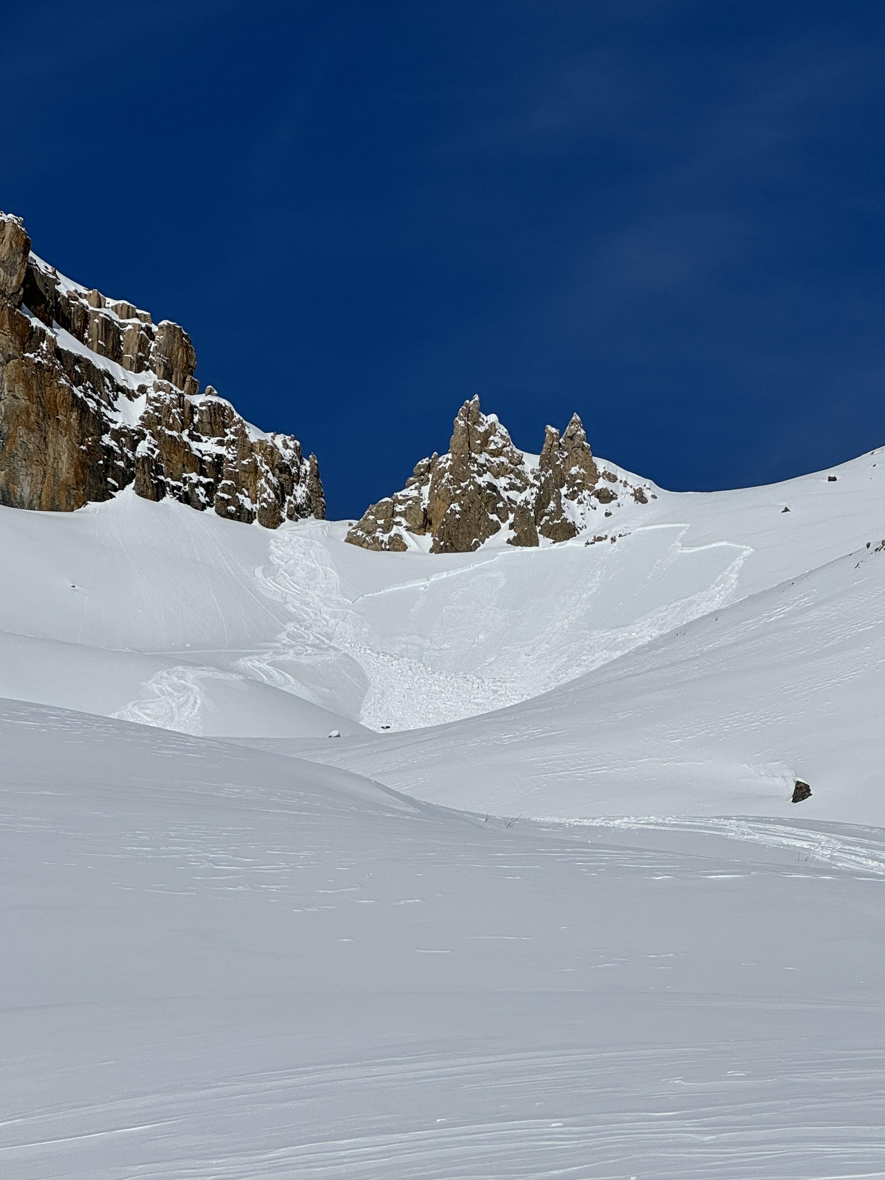 On our descent, we did remote trigger an avalanche. The 4th skier, while stacking tracks towards the slope that slid, triggered the adjacent slope. Not realizing that she had started the avalanche, she made a few additional turns, before shouting alerted her to traverse right, away from any potential involvement. The avalanche ran ~80 m before stopping. A couple turns from the skier slid in the slab, but otherwise the avalanche ran adjacent to the ski run and did not overrun tracks on the ski line. The avalanche was a size 2, ~40 m wide with a crown height ranging from 20-70 cm (wind-affected) and consisted solely from the recent snow. It was on a SW aspect, in full sun, and ran on a non-dated sun crust, not the Feb 3 crust/facet combo.