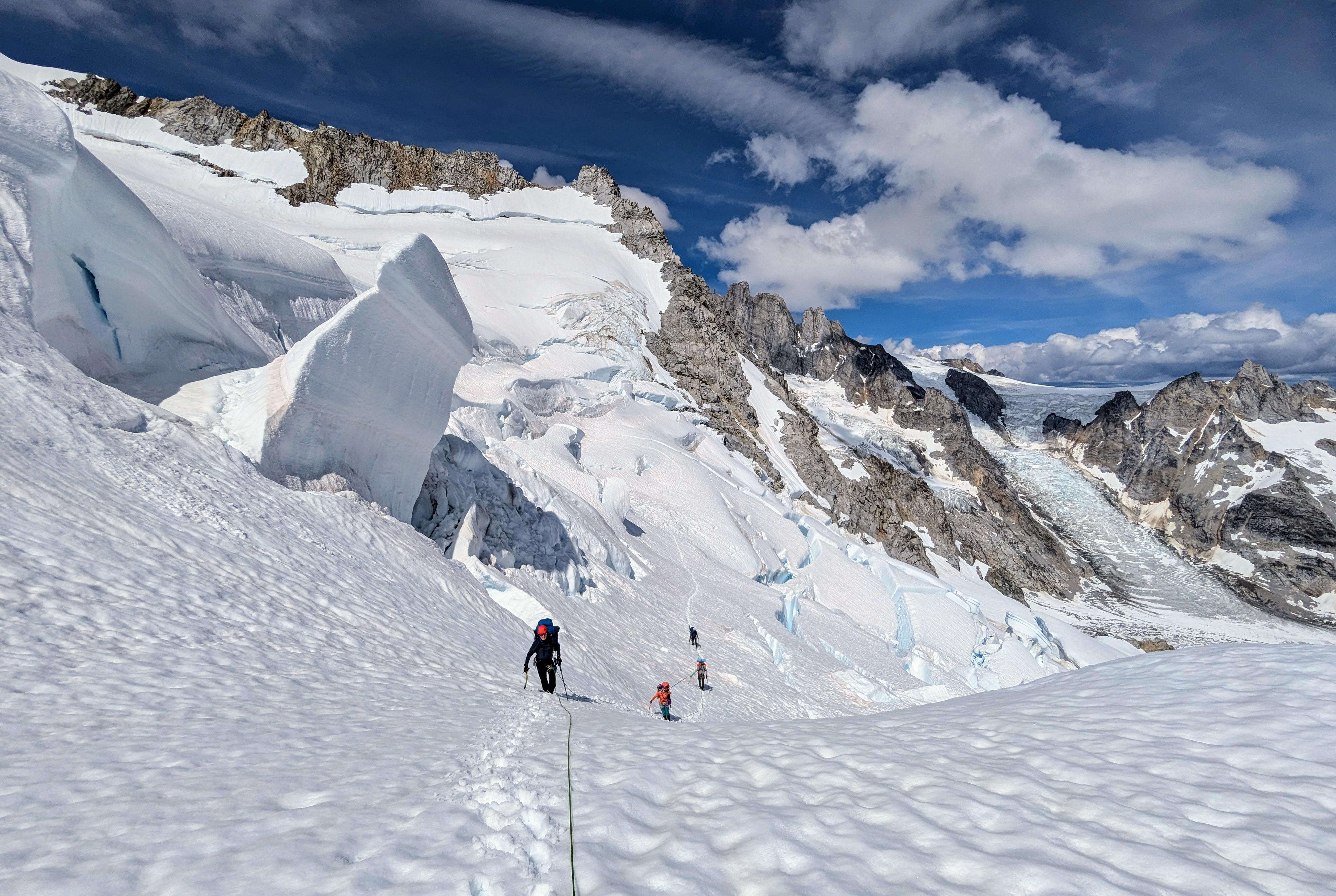 The overall conditions in the Waddington range were different than anticipated. Below 2800m glacier travel was challenging with open crevasses, minimal bridge options, and challenging bergshrund crossing. Much more reminiscent of mid summer conditions. Above 2800m there was much more remaining winter snow and conditions resembling to early summer with well covered snow bridge, passable bergshrunds, but also lingering avalanche problems and poor punchy walking snow surfaces. Perhaps this is due to a substantial snowstorm that swept the province in mid July. Perhaps this is also related to climate change affecting the lower mountain conditions more that the upper mountain. Either way, it makes planning an ascent of this nature more problematic. The final tower offered super interesting mix snow, ice, and rock climbing with good protection in the 5.8/M4/WI 3+ range. South facing alpine rock routes on Combatant, Tiedemann, and Asperity apear to be generally snow free from a distance.