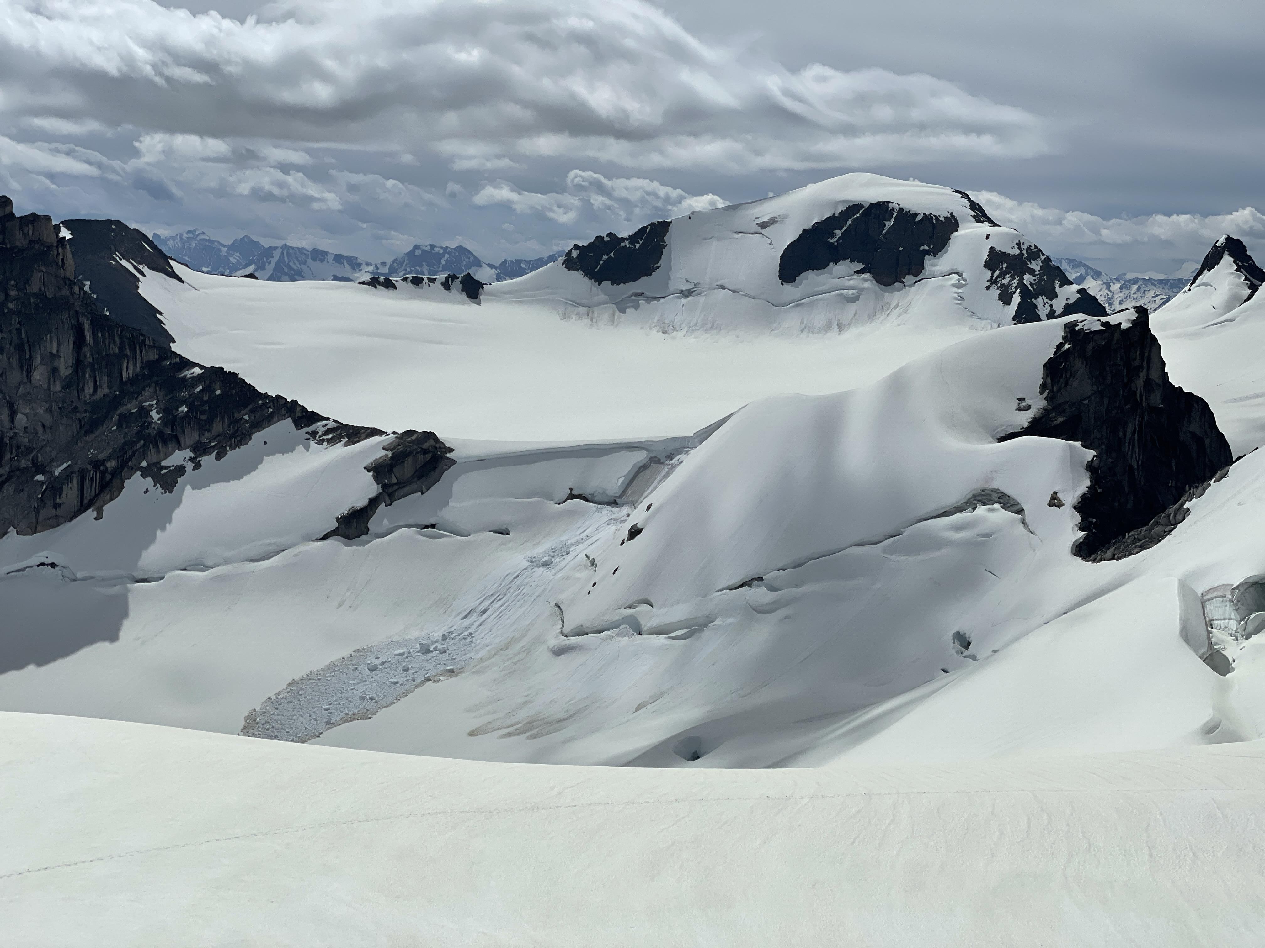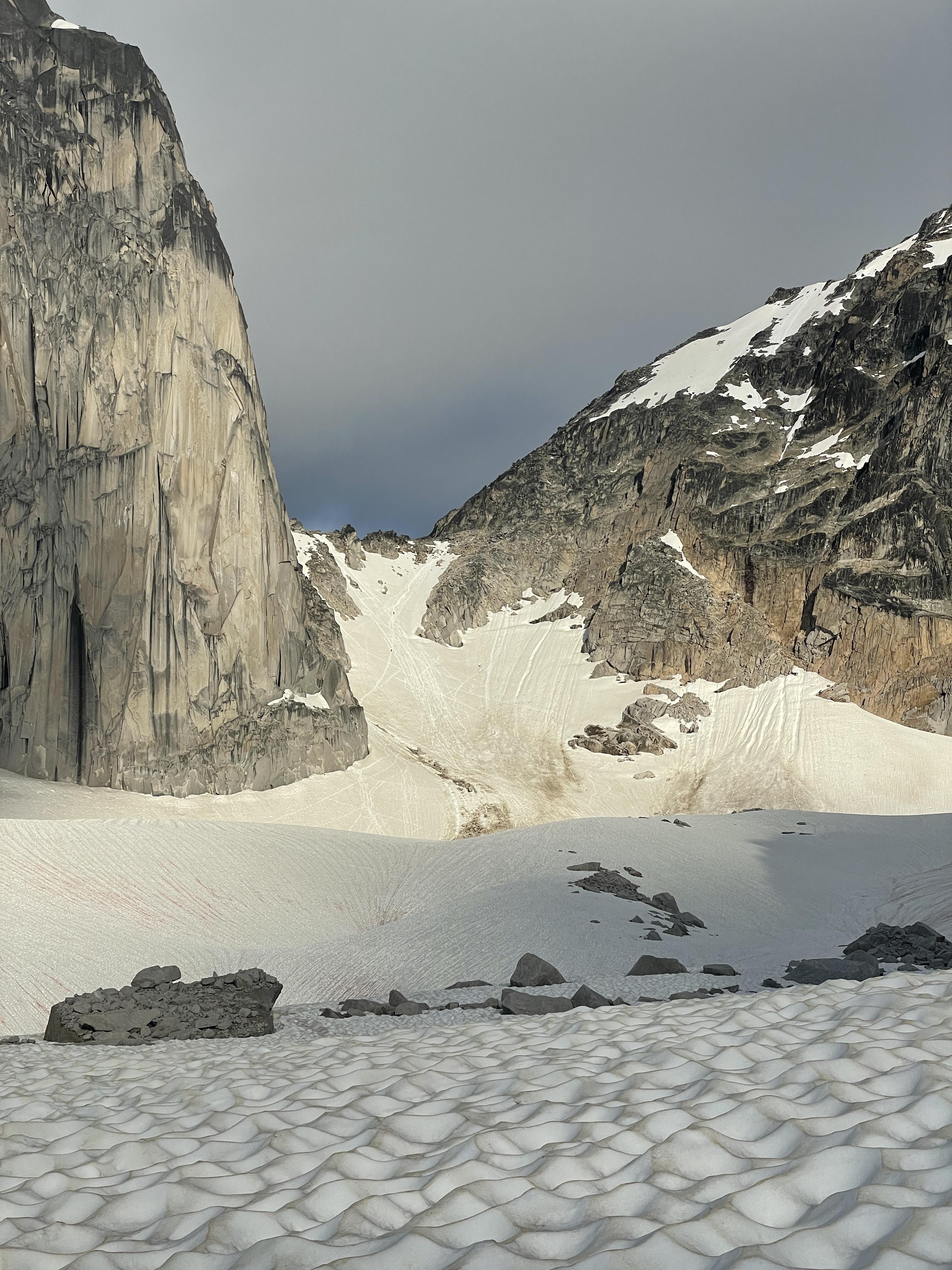 The BS Col was in excellent condition with deep secure steps (we wore crampons), good snow right to the col and no bergschrund issues. We didn’t wear crampons on the rest of our snow/glacier travel. The snow was soft, offering fast and easy travel, and snow coverage on the glaciers was excellent.