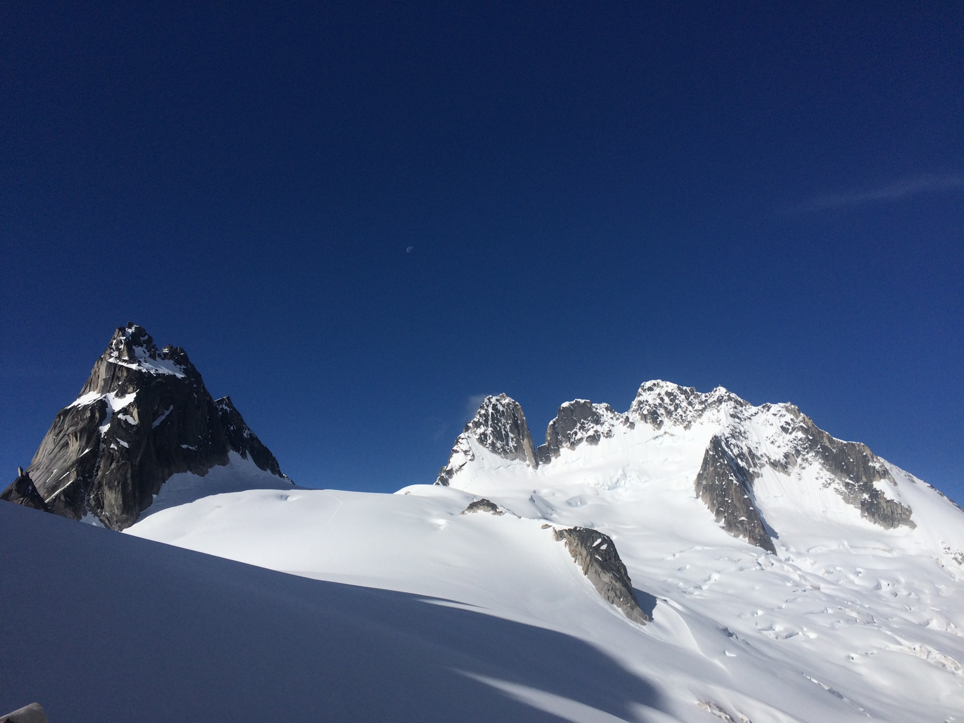 Snow depth on the glaciers varies but in many places still exceeds 2 meters. Rain during June 24th and 25th made an overnight freeze impossible and we experienced isothermal conditions. We had a good overnight freeze overnight on Saturday but that didn't last very long into the day. Steep slopes that receive sun (like the Bugaboo Snowpatch Col and Upper Bugaboo Glacier) were out for us early in the day. Generally crevasses are well bridged however sections of the bergshrund on the B-S Col are thinly bridged in sections.