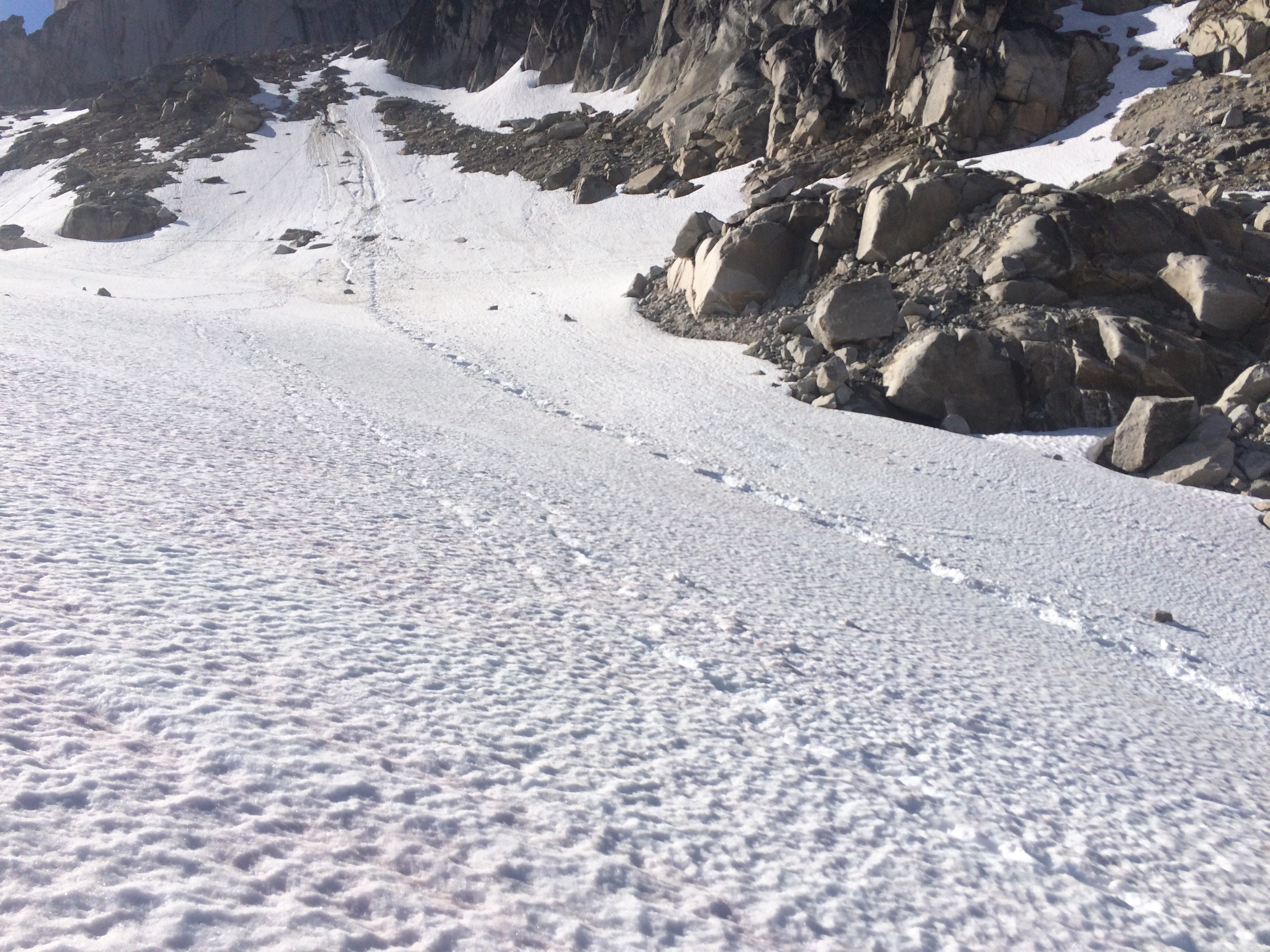 3. The toe of the Bugaboo Glacier saw a coffee table sized block run across the up track used by a number of parties. Given that this area has been the site of some serious rockfall incidents climbers may want to consider limiting their exposure in this area by crossing the creek and starting up closer to the centre of the glacier.
