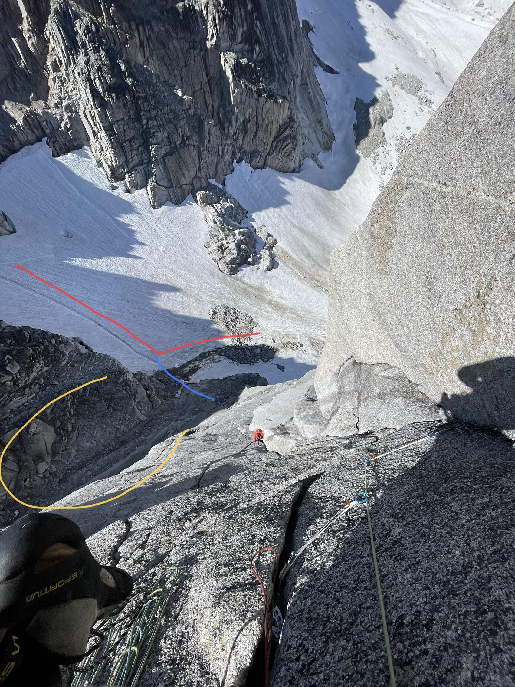 Snow/coverage is the best it has been in years, with easy travel still holding on up the Bugaboos Snowpatch col. This might not hold on for too much longer but only the last few meters are exposed rock/scree/dirt. However, the Sunshine Wall/Col gully is a certified mess and is the site of most of the natural rock fall in the area now. While climbing sunshine I watched multiple toaster to bar fridge style blocks tumble out of it and slide down the snow. Climbers, myself included, scrambled across this terrible slope to get to Sunshine but I am vowing not to do that again as it was way too much added risk. All the loose rock is sitting on melting snow/black ice and is short for the vertical world. See attached photo for a birds eye view of the zone. Yellow is the rockfall starting grounds, red is the track everyone is walking up to the col, and blue is the dance of death to get to the base of Sunshine, please consider the alternate approach and descent from the east face of snowpatch.