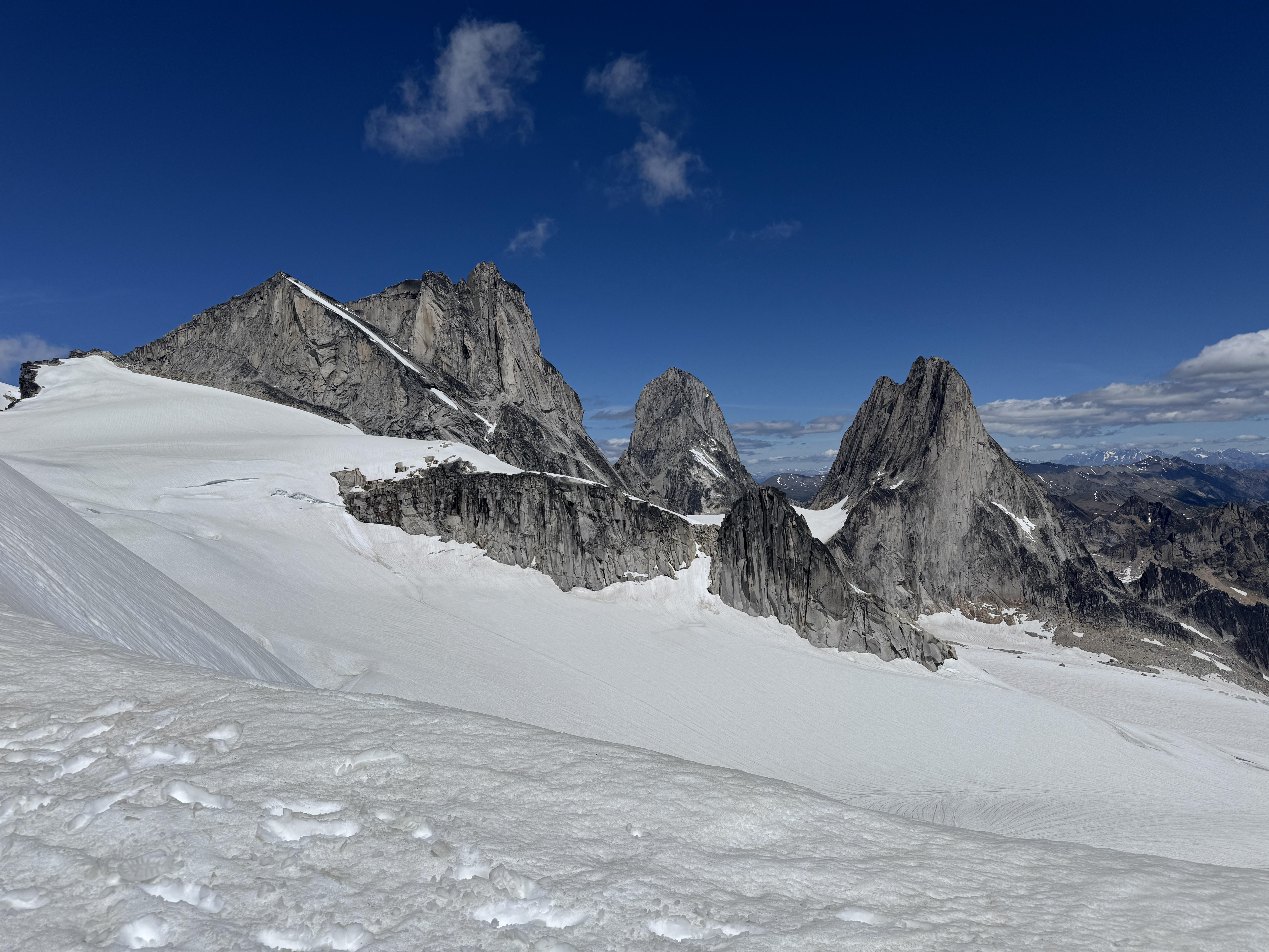 The week started with warm and sunny conditions, and light to moderate wind. Travel conditions were excellent on supportive snow and dry rock. The snow was melting quite quickly, snow bridges thinning and weakening, and crevasses and bergschrunds were opening up.