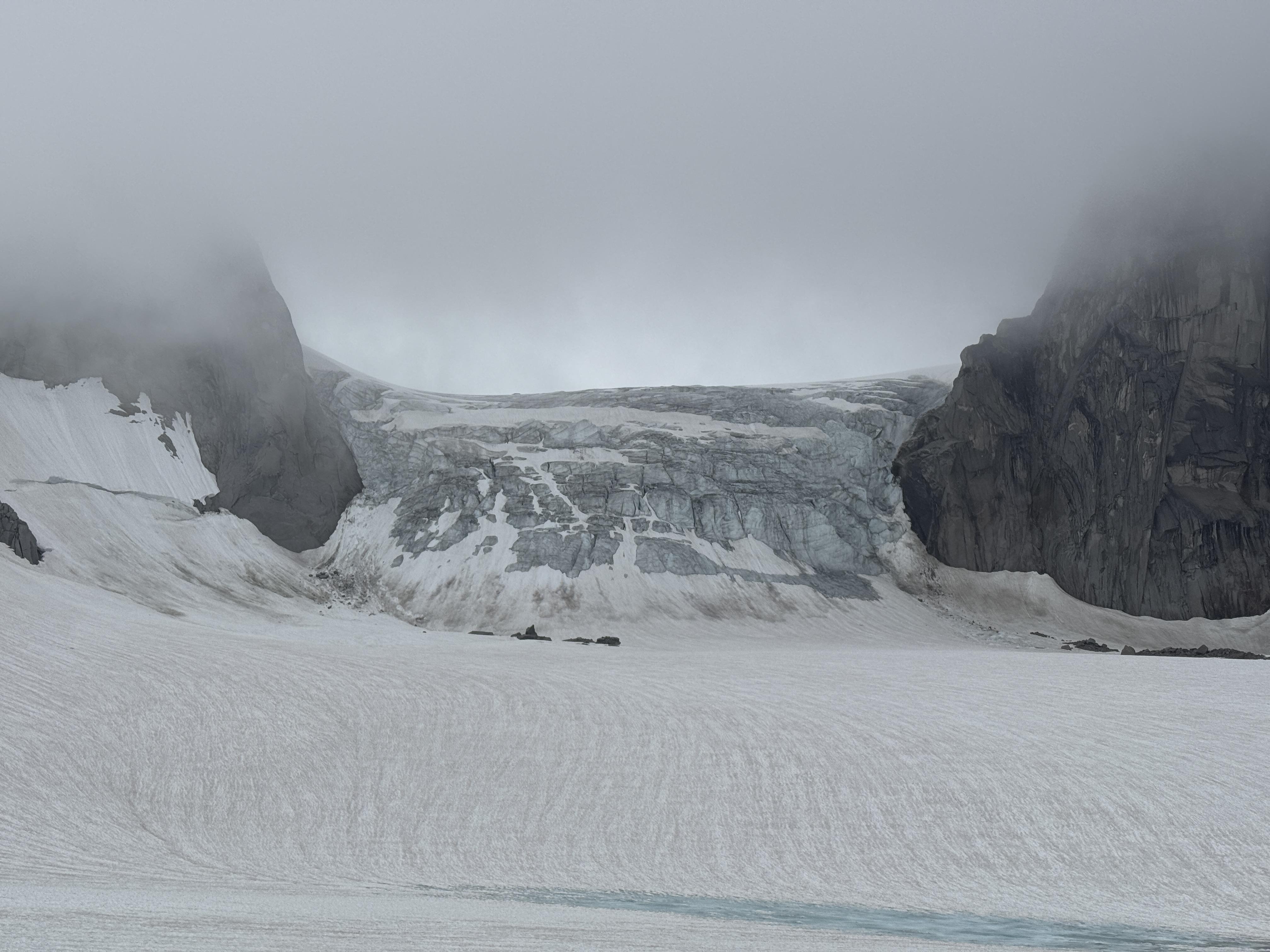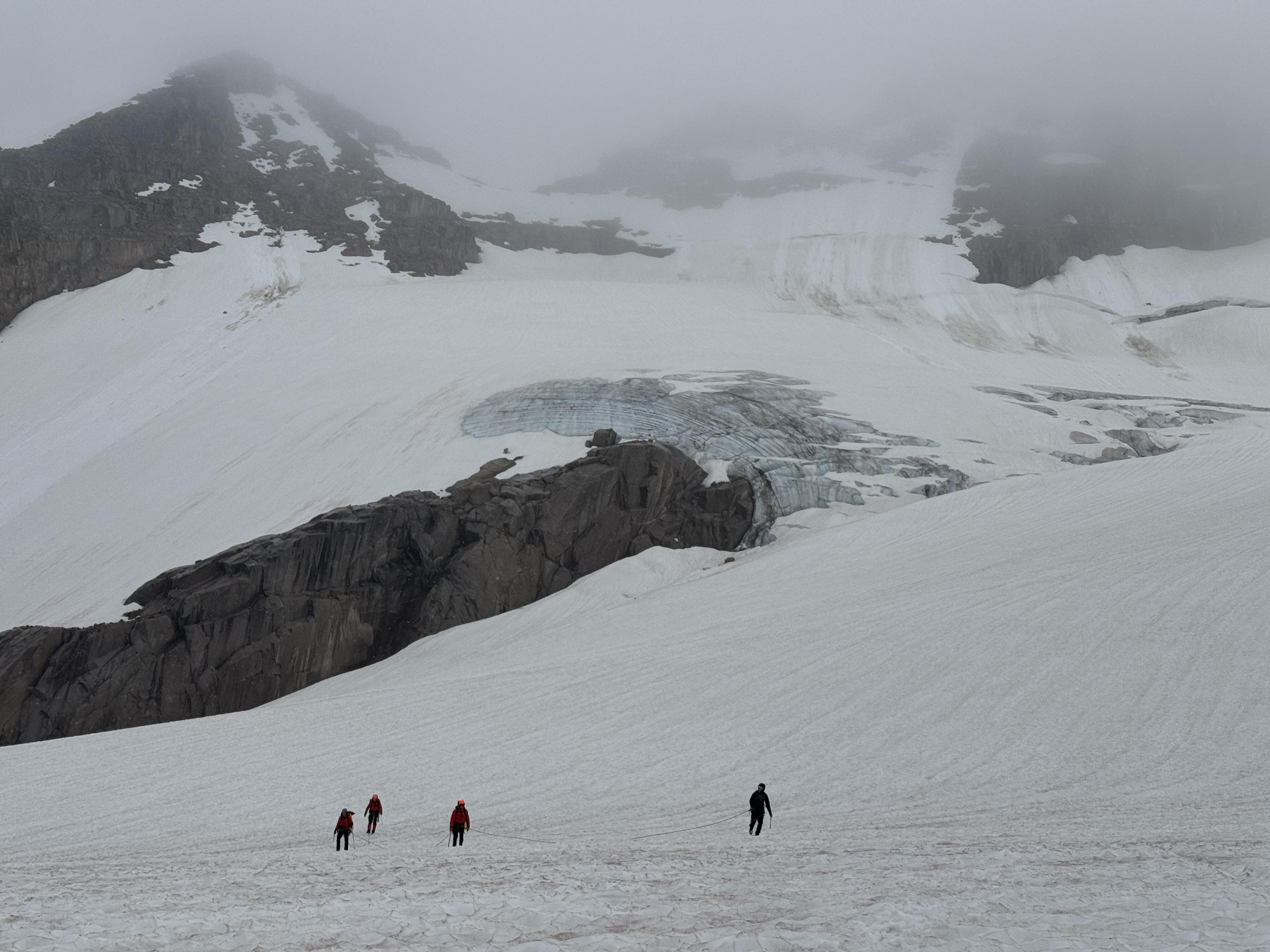 In the past 24 hours we noted rapid snow loss during a rain event, with up to 5cm wet snow overnight above 3000m, and rain soaked snow with weak crevasse bridges. Granite ridges will dry out pretty quickly. Be aware of impending rockfall due to recent moisture loading.