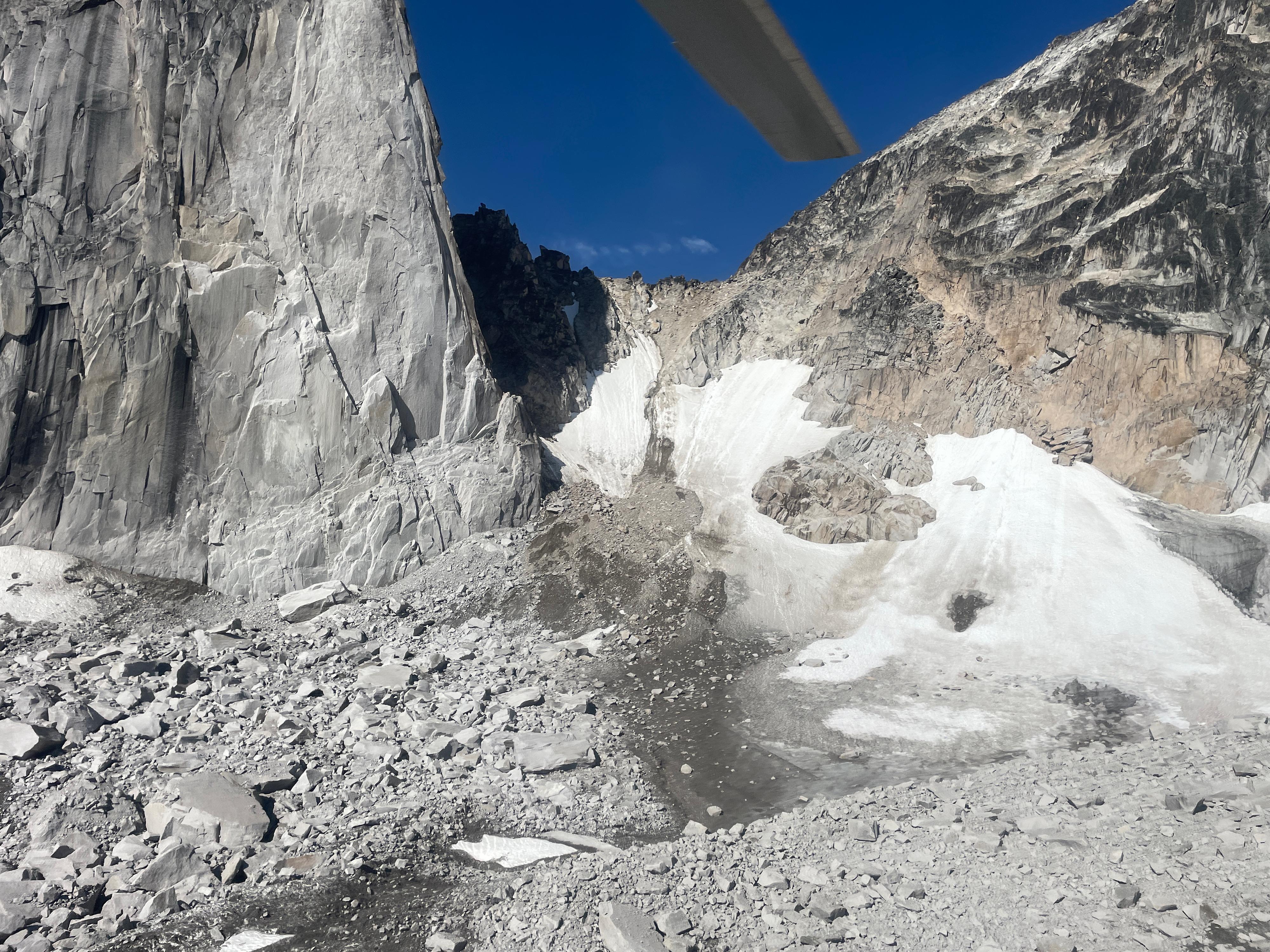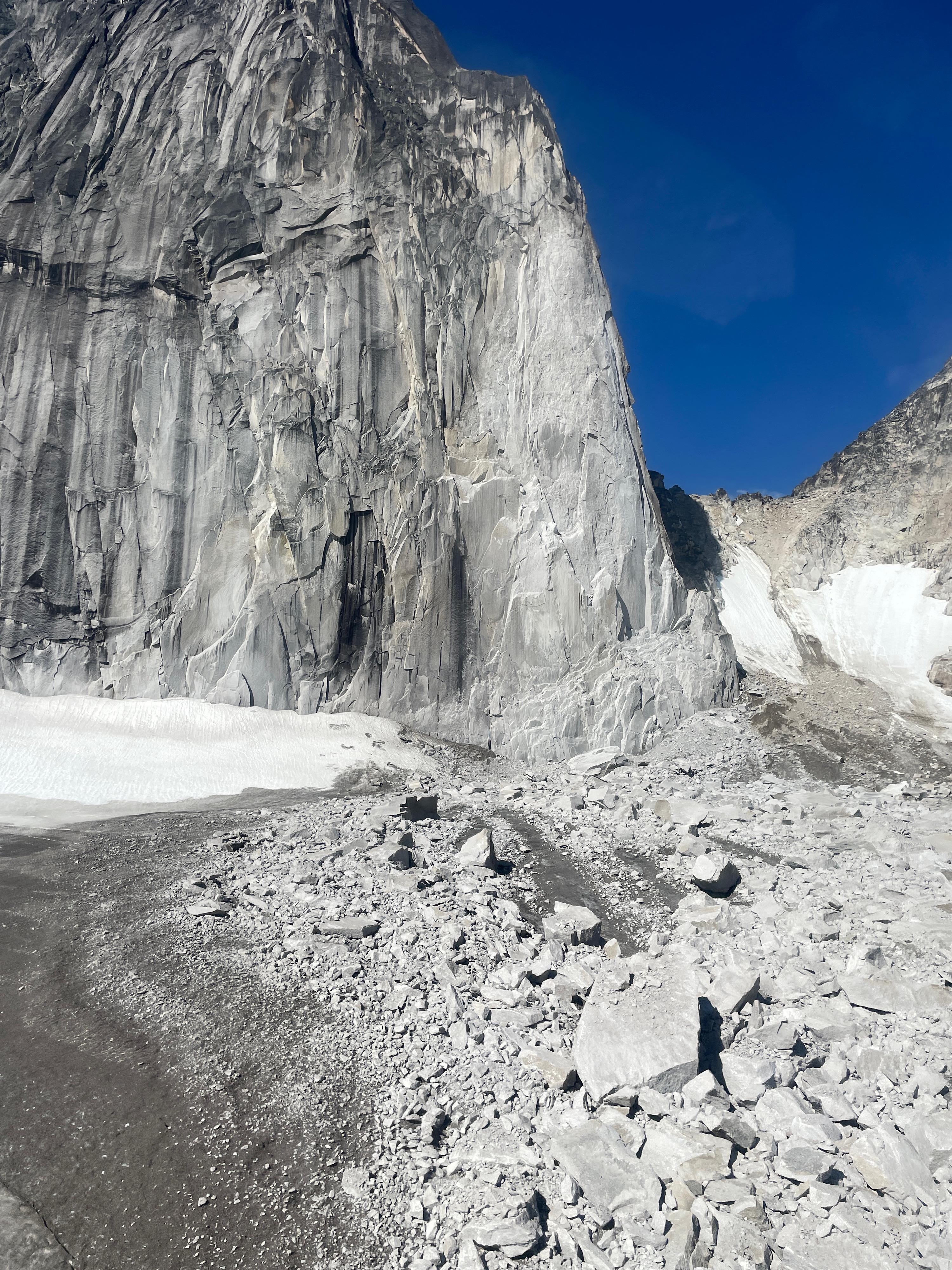 As reported recently, conditions are very dry and rockfall hazard is rising. Boulders are melted out and unstable. See photos.