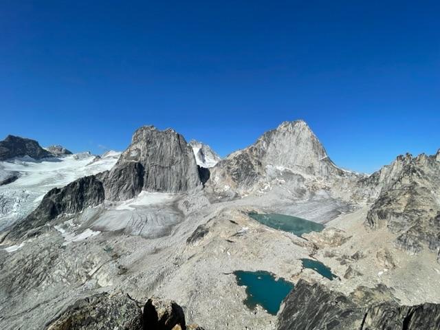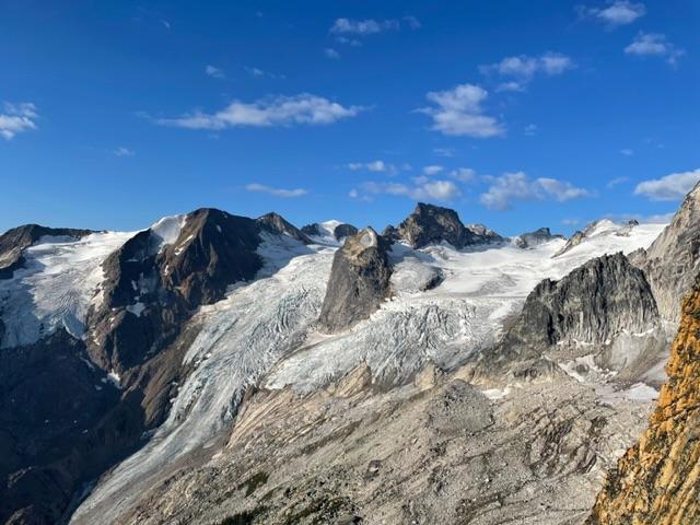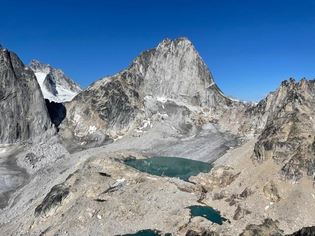 We observed and heard several rock fall events with the daytime warming off of numerous peaks. Of note, while on Eastpost Spire on the 29th we observed a significant rock fall event off of the east face of Bugaboo spire where two of the largest pieces of rock slid 3/4 of the way down the crescent glacier towards the lake.