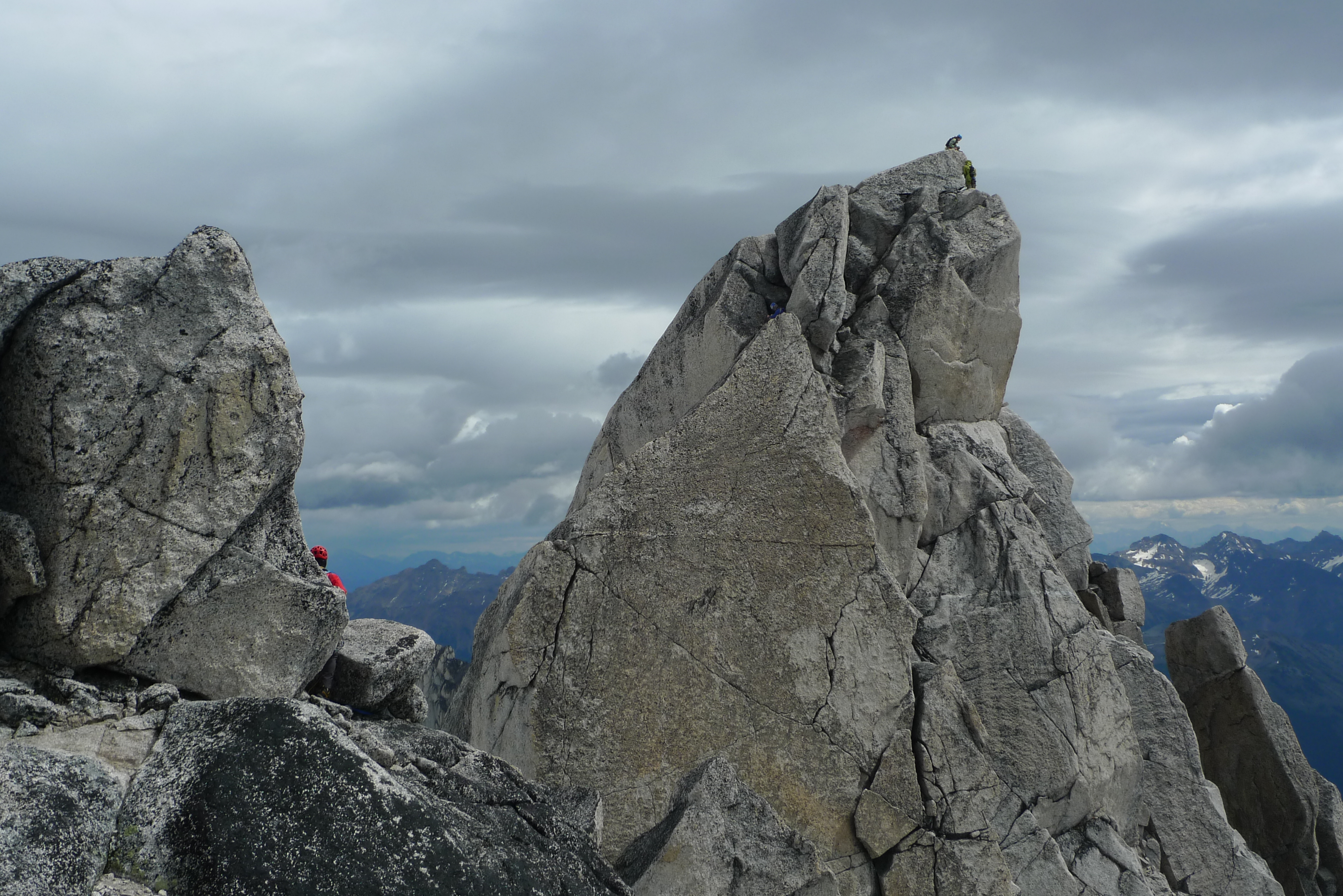 I guided an ascent of the West Ridge of Pigeon Spire on Monday, July 25th. The Bugaboo/Snowpatch Col is still in good shape with no bergshrund open and step kicking possible all the way with the exception of 10 metres of gravel at the very top (take care as there is almost always other parties below). An established track leads across the Vowell Glacier to the start of the ridge and the glacier is carrying well. The route is in good shape with twenty or so steps in snow and ice (we left crampons at the start of the ridge) at the summit block (Note that in the attached picture the gentleman in the blue is taking a harder variation to the summit. The route normal corkscrews around climbers left to gain a fourth class broken ramp that leads to the top).