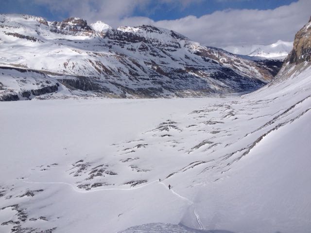 I skied the Saskatchewan Glacier to Castleguard Meadows this past weekend. An attempt on Castleguard Mountain was aborted Saturday because of white out conditions above 2700m. We skied the broad north slope on the sub peak east of Castleguard and enjoyed some great turns! We were able to access Castleguard Meadows via a break in the lateral moraines (11U 487100mE 5775900mN).