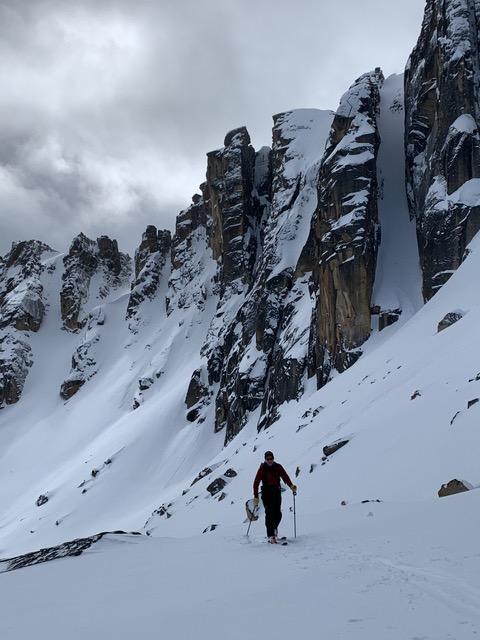 About 120cm in sheltered treeline areas. The higher alpine areas were hammered and mainly stripped of snow. The good skiing was limited to north-facing cirques around treeline elevations. Grimface Mountain is 2650m, and the connecting ridge-lines are composed of steep granitic type rocks, split by couloirs. However, the combination of heavily corniced ridges and shallow faceted snow in this dry interior climate make for difficult stability assessment in steep alpine terrain