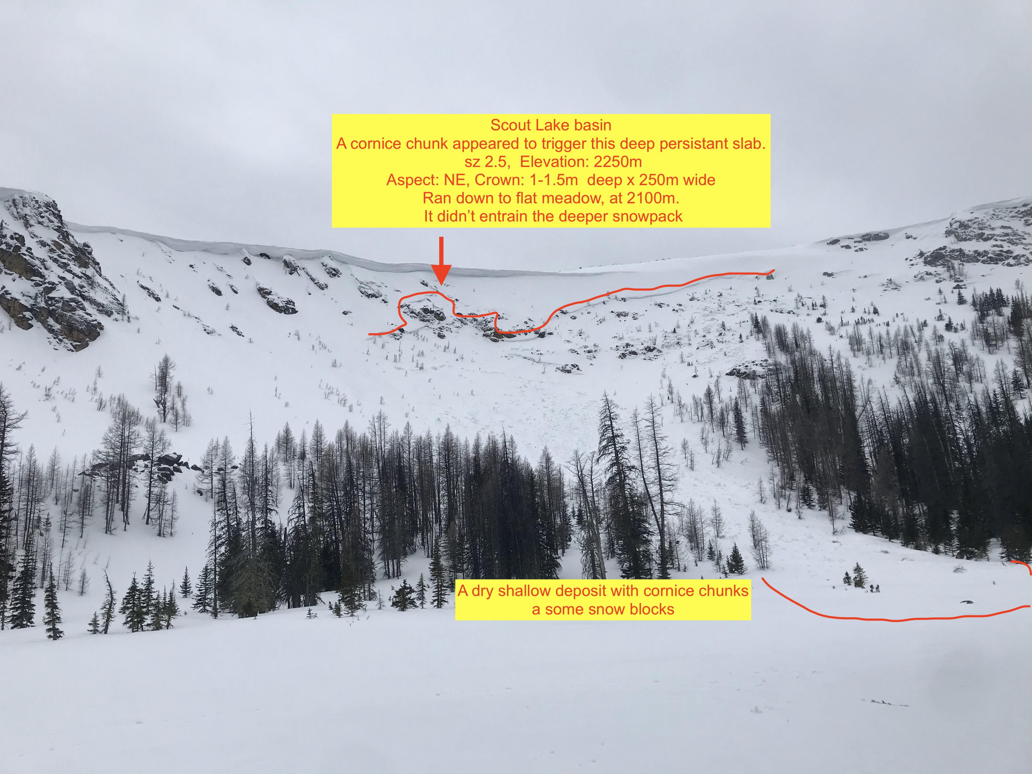 Cornices were ripe, but hanging on during the last week of cold weather. One old size 2.5 ( previous 7-10 days), the deep persistent slab was triggered by a drooping cornice. The slab pulled and stepped to the ground in a shallow convex start zone, but ran down the track without entraining the deeper snowpack. ( see photo) We saw one fresh dry sz 1 deposit in a steep tree line area, probably a windslab, and heard a loud rumble from the ridgeline near "Stone City" probably a falling cornice? I am pretty sure there were also plenty of stiff wind slabs in the alpine, but we avoided this type of terrain.