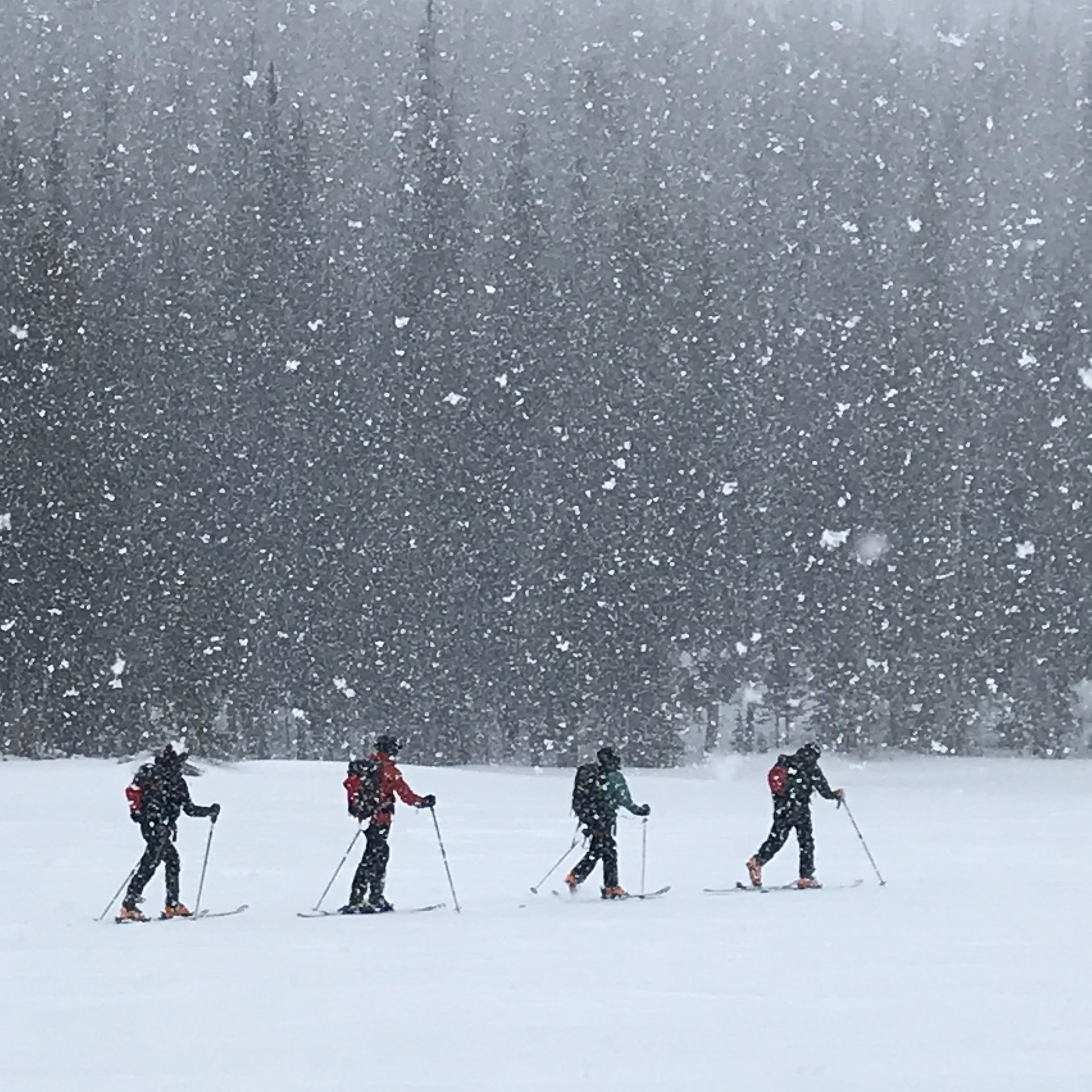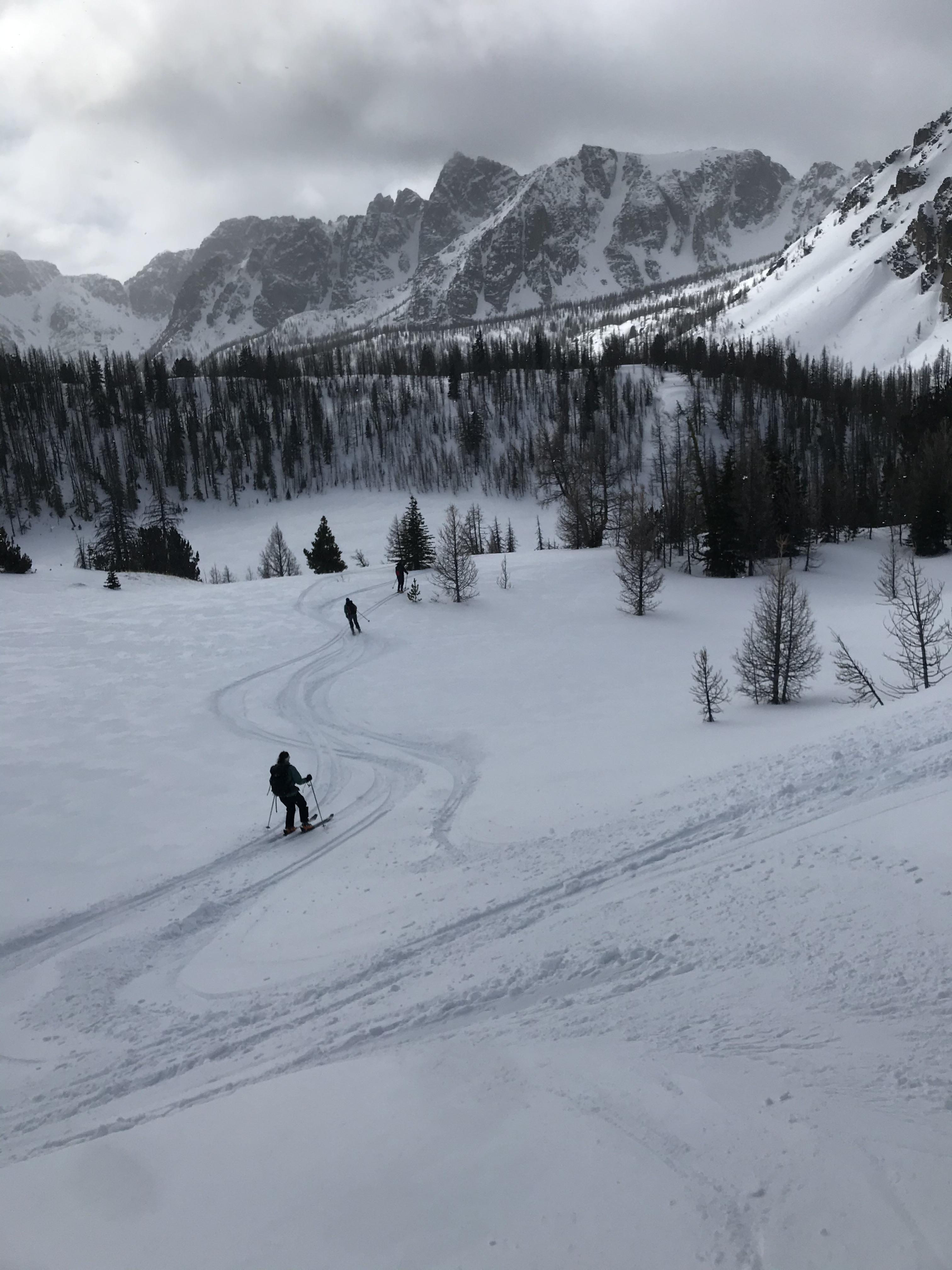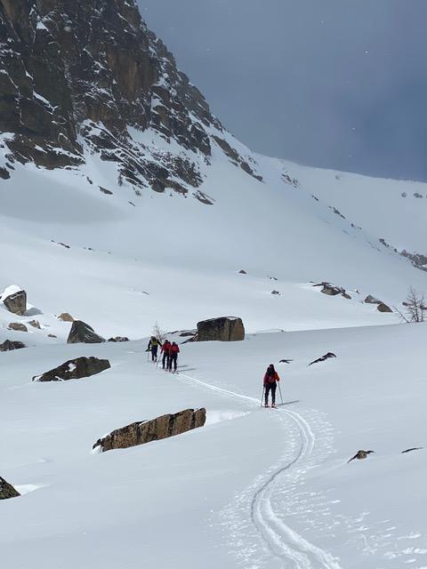 Mar. 18-22, we had mixed sun and cloud, temperatures were -8 to -4. Afternoon convective flurries producing 2 to 5cms of new snow daily. Strong Southerly winds were stripping and transporting snow off the alpine areas. On March 23rd, it clear and calm, we had one run near the lodge in Scout lake basin before an exciting fast ski down the 15km access road!