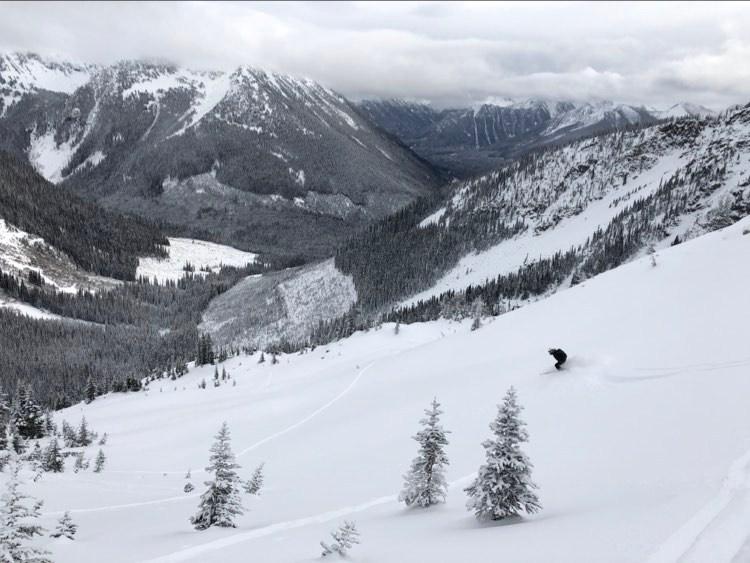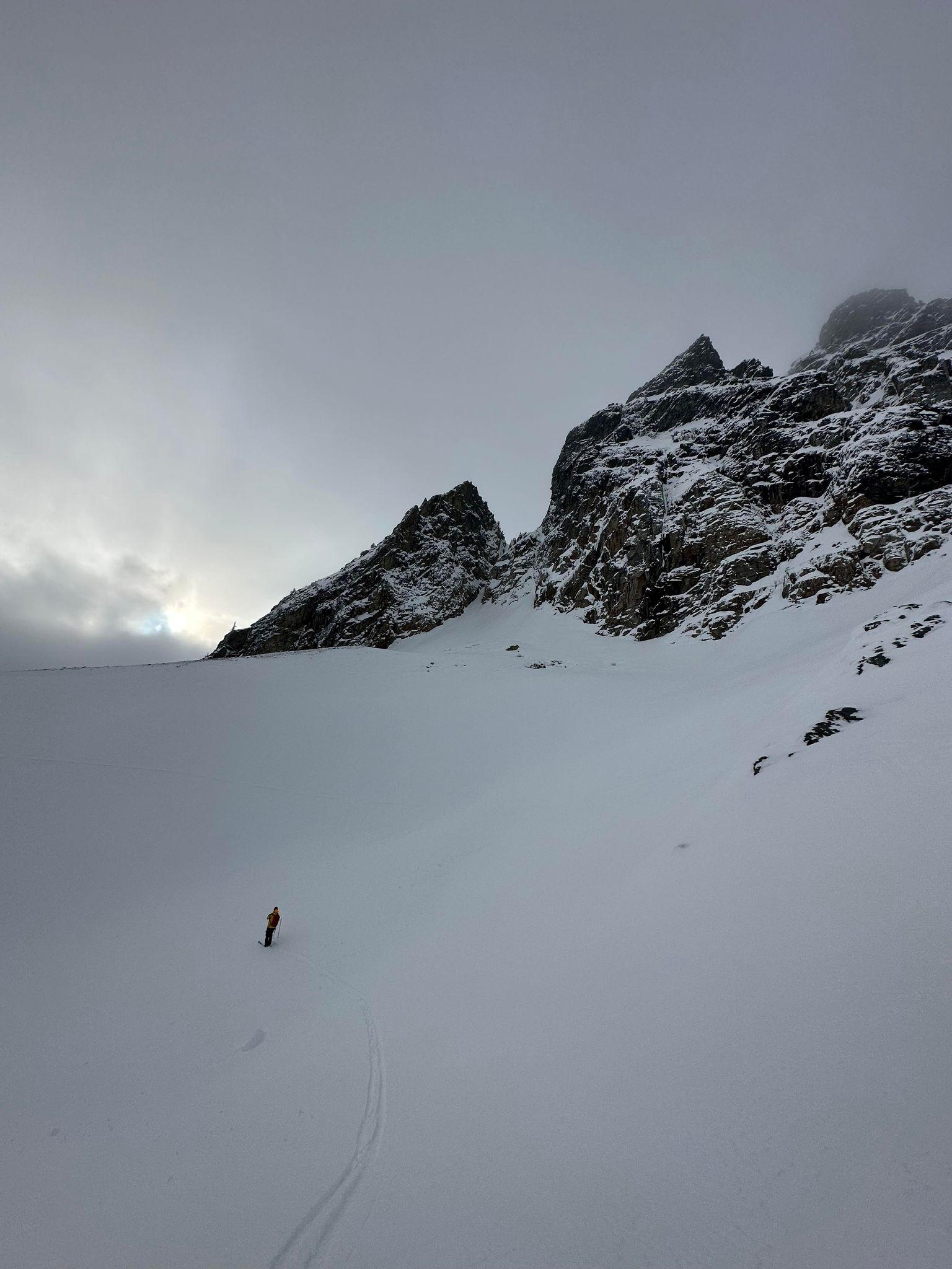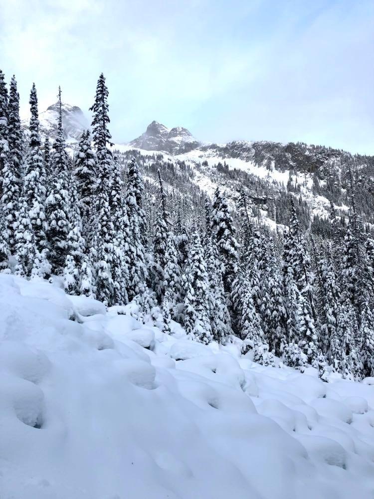 Being a first day on the Duffey expectations were low and we were pleasantly surprised to see that coverage was very manageable. Travel in the forested sections was very reasonable up and down. Conditions at the treeline elevation were boot top powder with supportive snow underneath. More wind affect and shallower ski penetration up higher. Still exposed ice on the glacier and up higher, wind has scoured and exposed rocks more-so than lower down.
