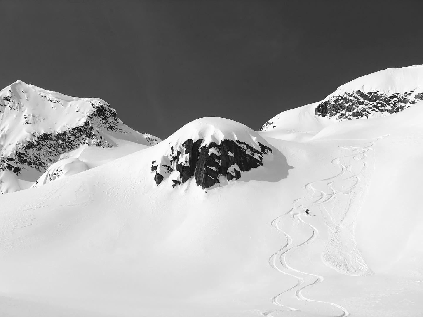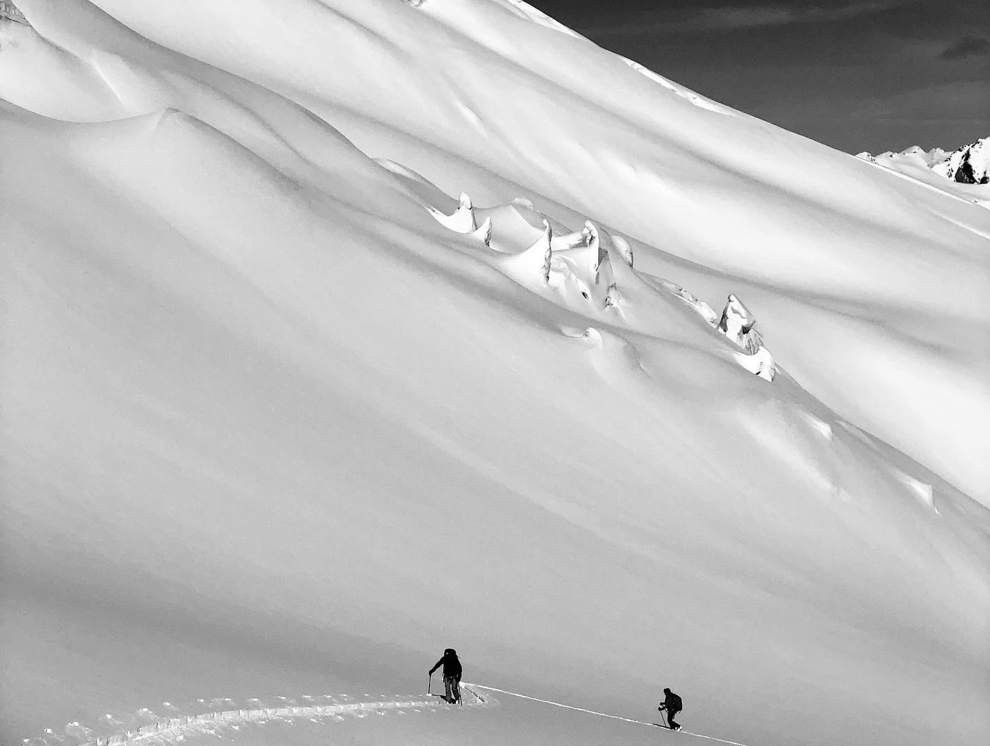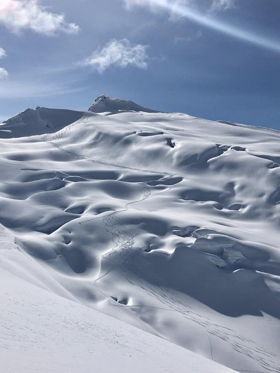 HS on the glaciers was 350cm+ and the crevasses appeared to be well bridged in most places. Solar aspects are still a ways from being corn. Most have a 2-3 cm MFcr over 5cm of facets over the April 8 MFcr.