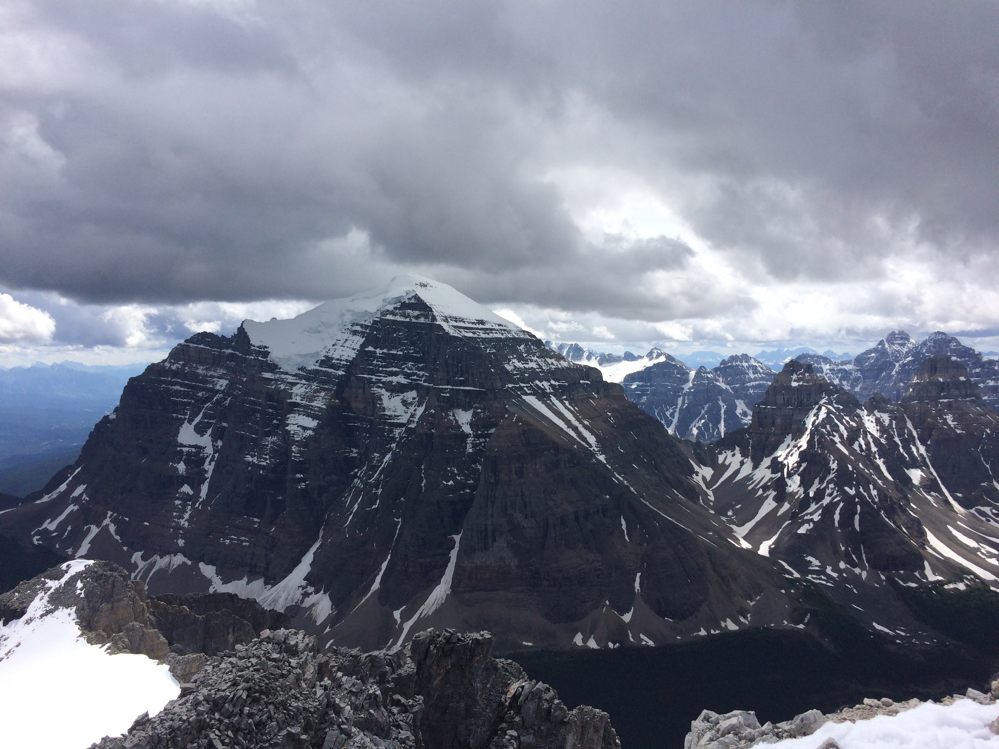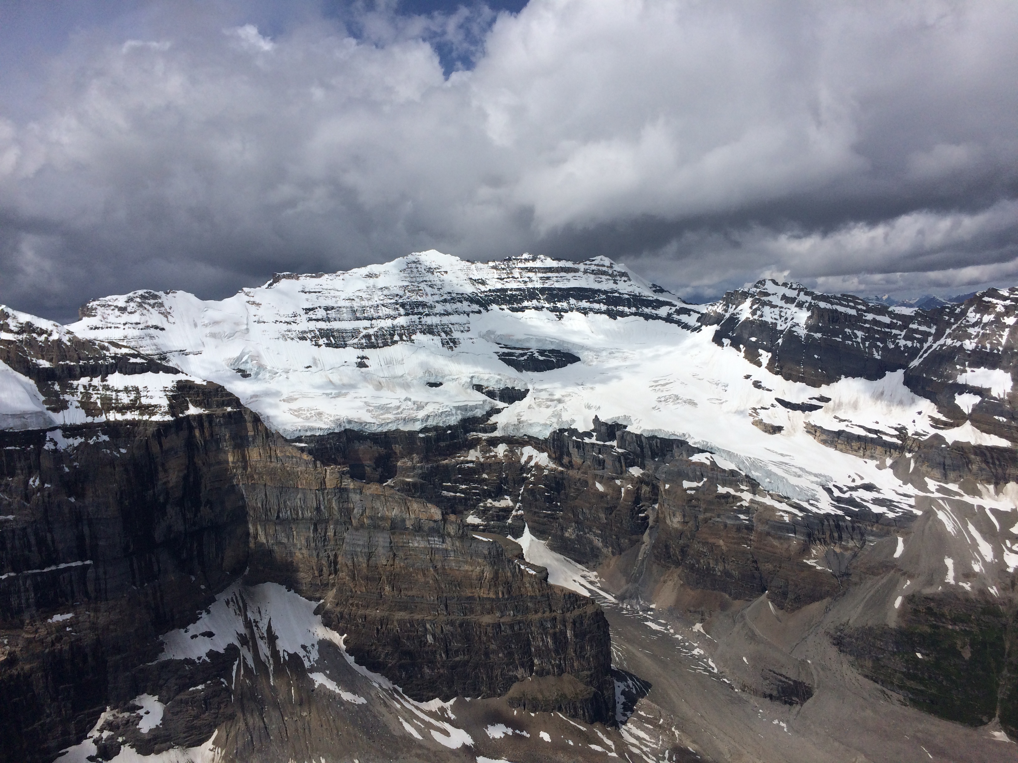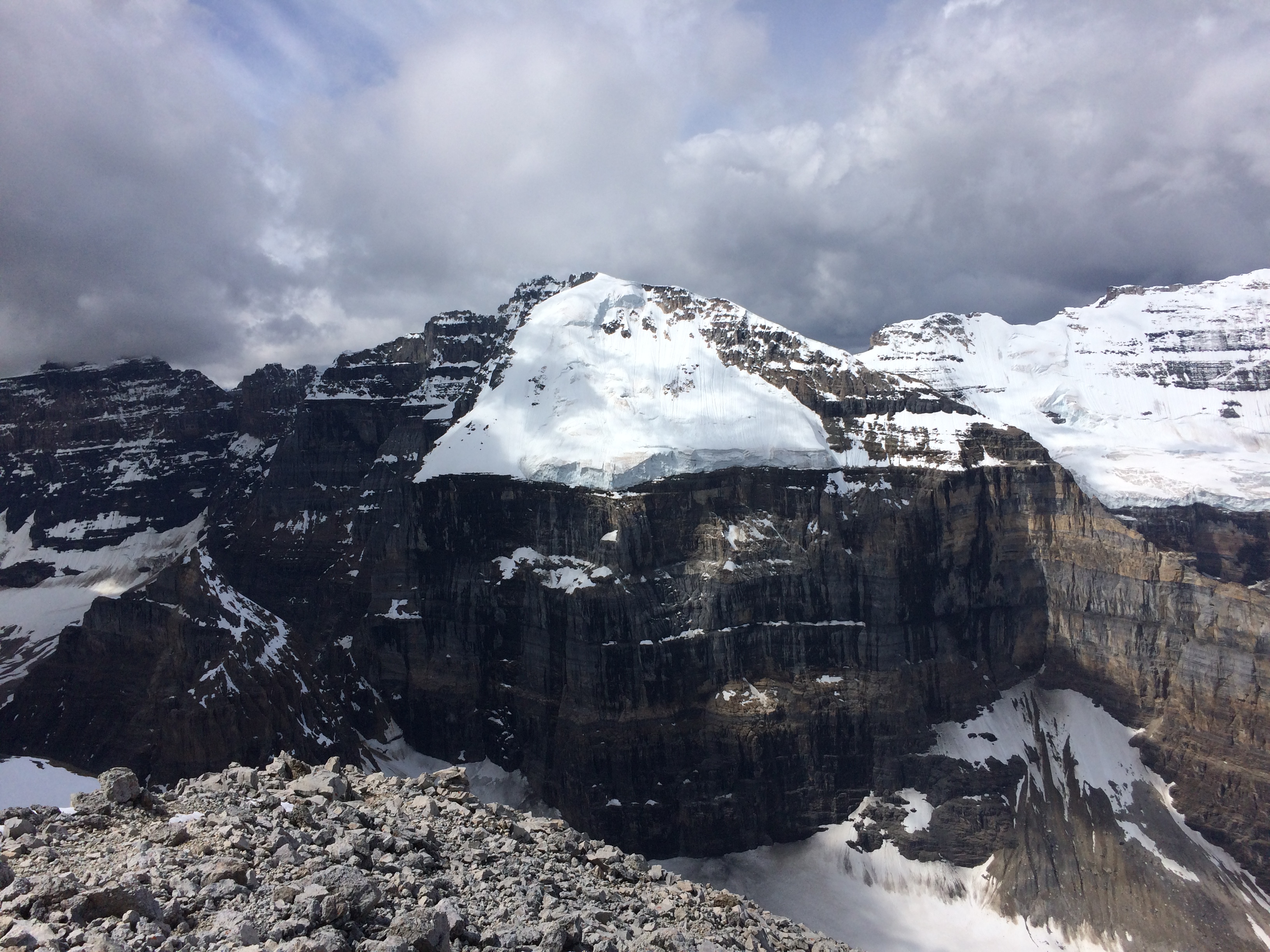 The Bergschrund itself is quite filled but is starting to open despite a lot of snow covering it and most of the snow is starting to sag over crevasses. The climbing above the Bergschrund is full of snow and we were having knee-deep steps all the way up except for the last steep section where there were only 10-15 cm covering ice and rock. Overall the climbing was straightforward and with a light freeze at night, the hazards were quite manageable. We punched boot-deep on the lower part of the glacier and knee-deep higher up. There is still up to 180cm of snow on some section of the glacier and a lot of week old point of release avalanches were observed all around the Lake Louise group. I added a couple of photos of the conditions in the area.