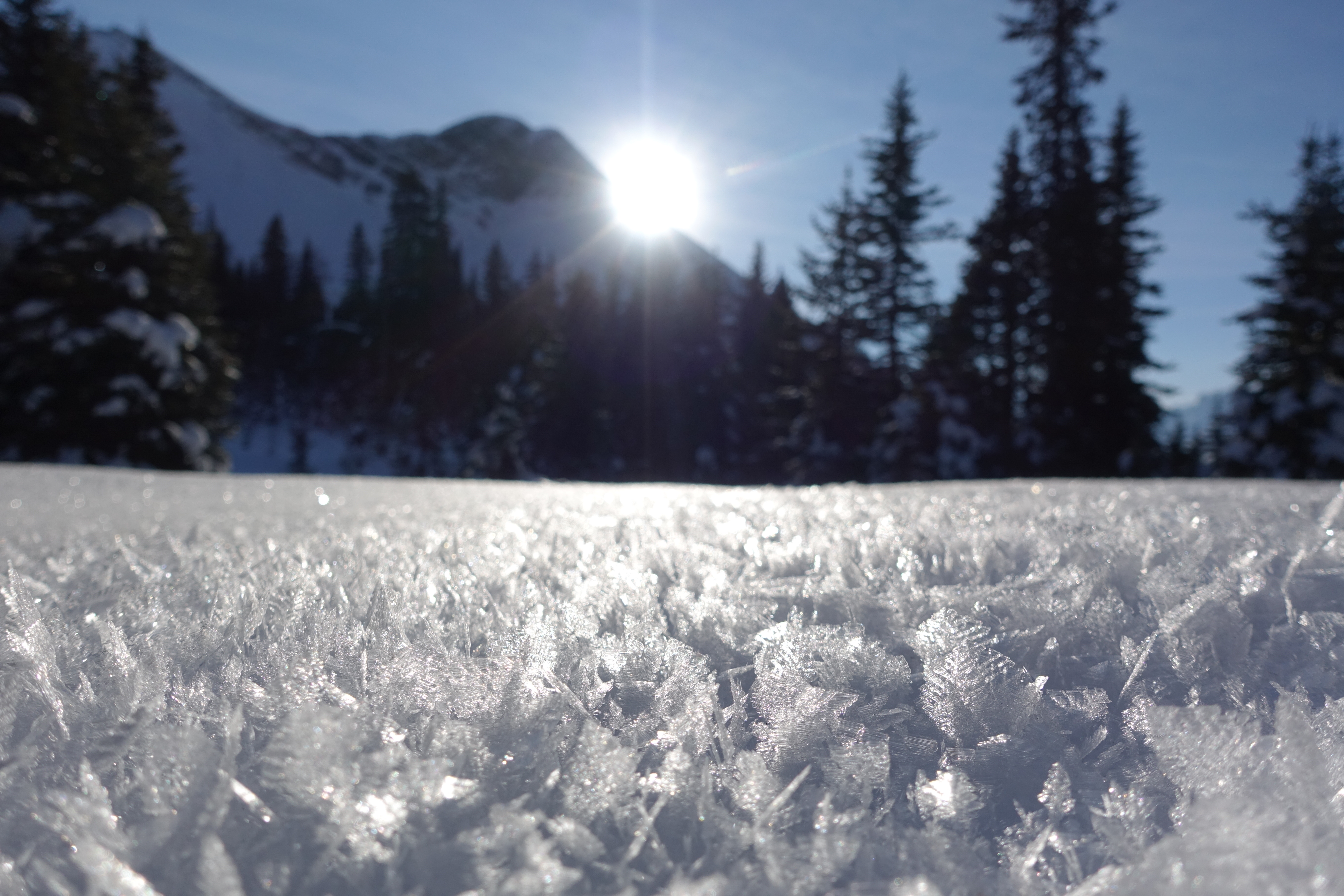Today I spent most of the day ski touring around sun-drenched Chester Lake. The snow pack here is about 120 cm deep above the lake (W aspect) and heavily facetted, as is the case everywhere in the Rockies right now. The Hallowe'en Crust was down about 40 cm. A Compression Test produced one moderate result (sudden planar) in a layer somewhat above the crust down about 35 cm, and a second produced no result. The whole area has seen a fair bit of wind and low angled south aspects were moist and/or lightly sun crusted. High was +5 today but it still felt cool, with a light breeze off and on. We skied wind affected planar slopes to 30 degrees.