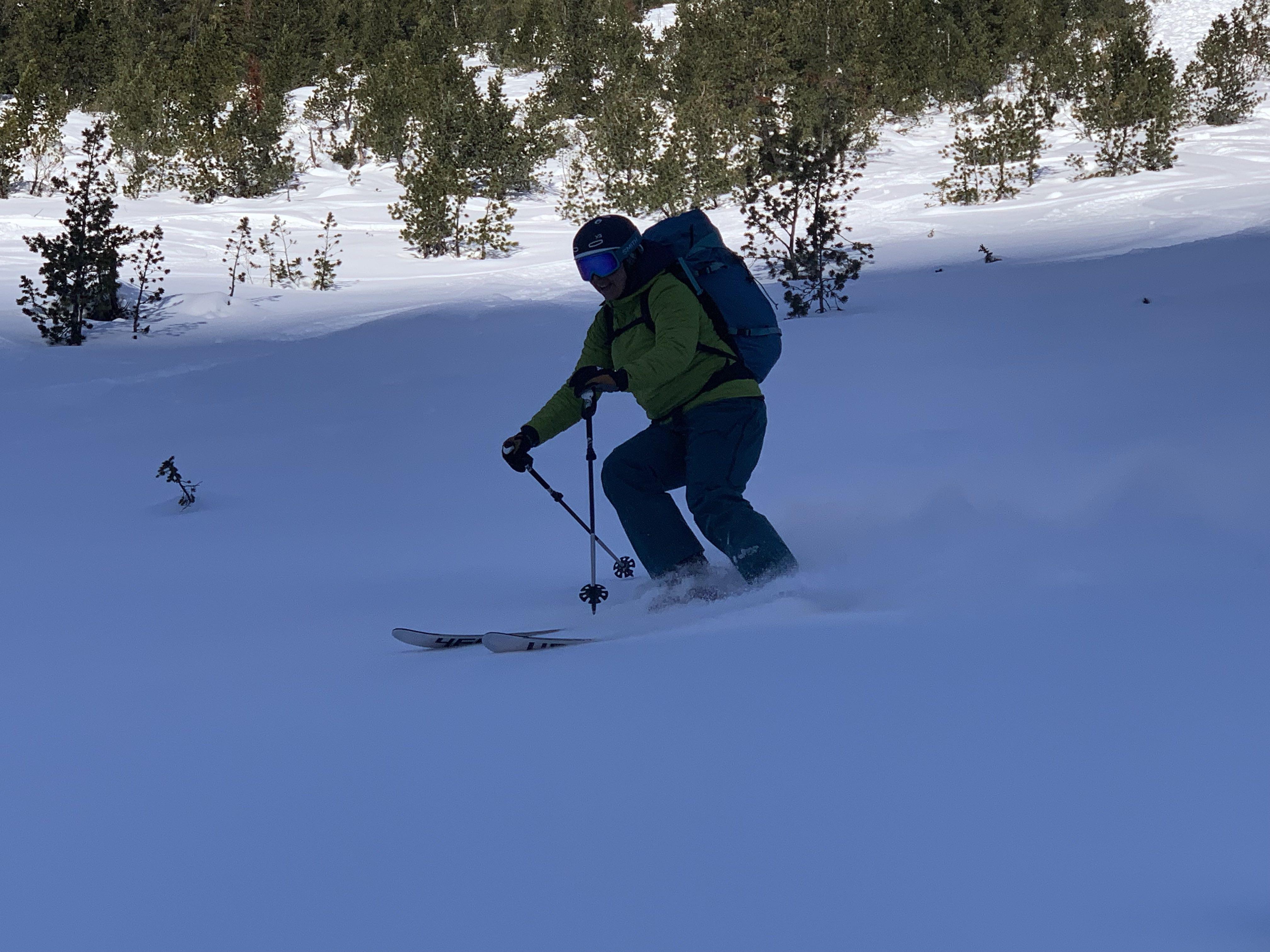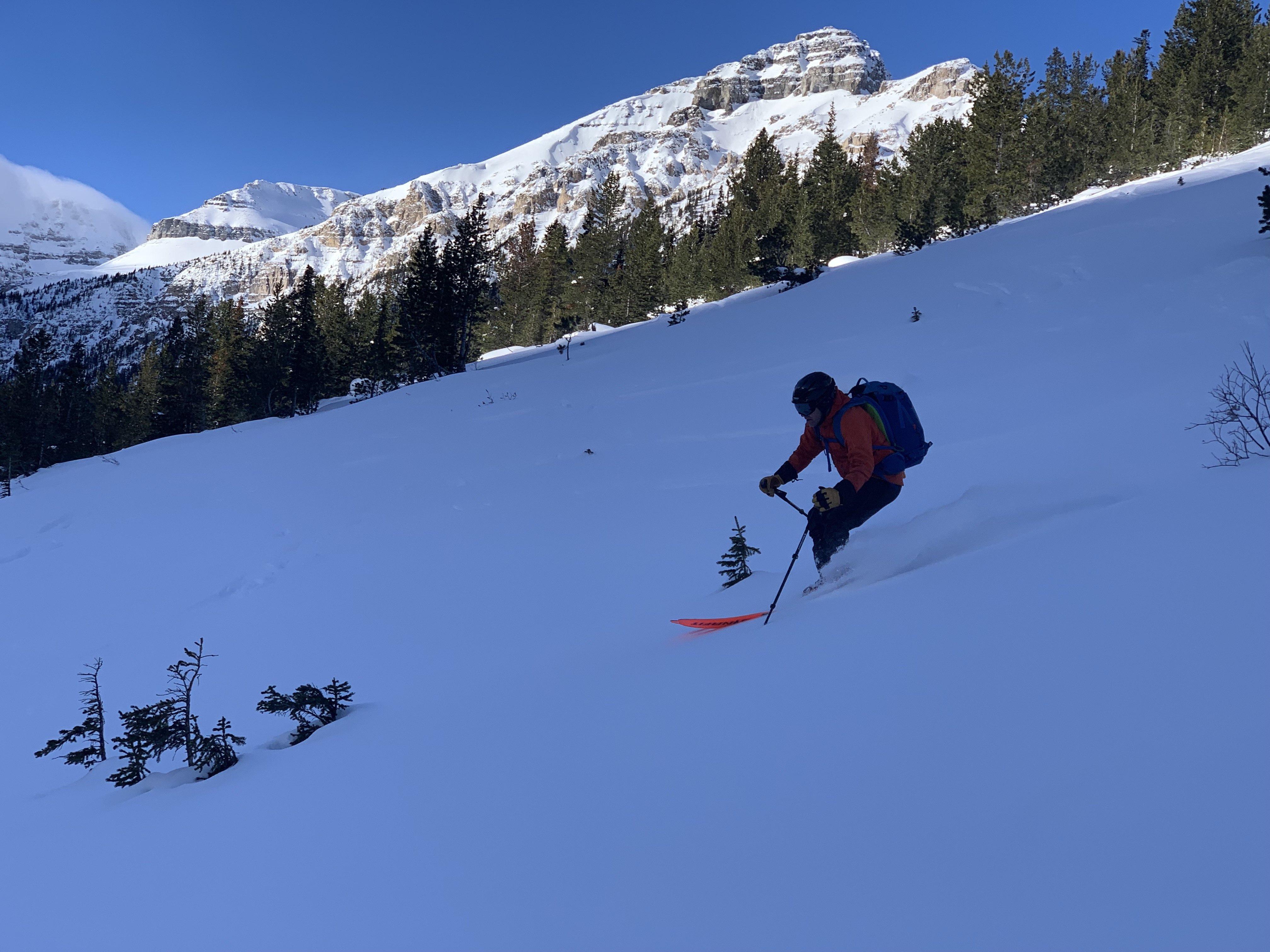 We skied up to just below the toe of the debris and had some good turns on 25 degree terrain. The sun crusts were not present here likely because Mt Whymper protected the lower part of these slopes from getting cooked.