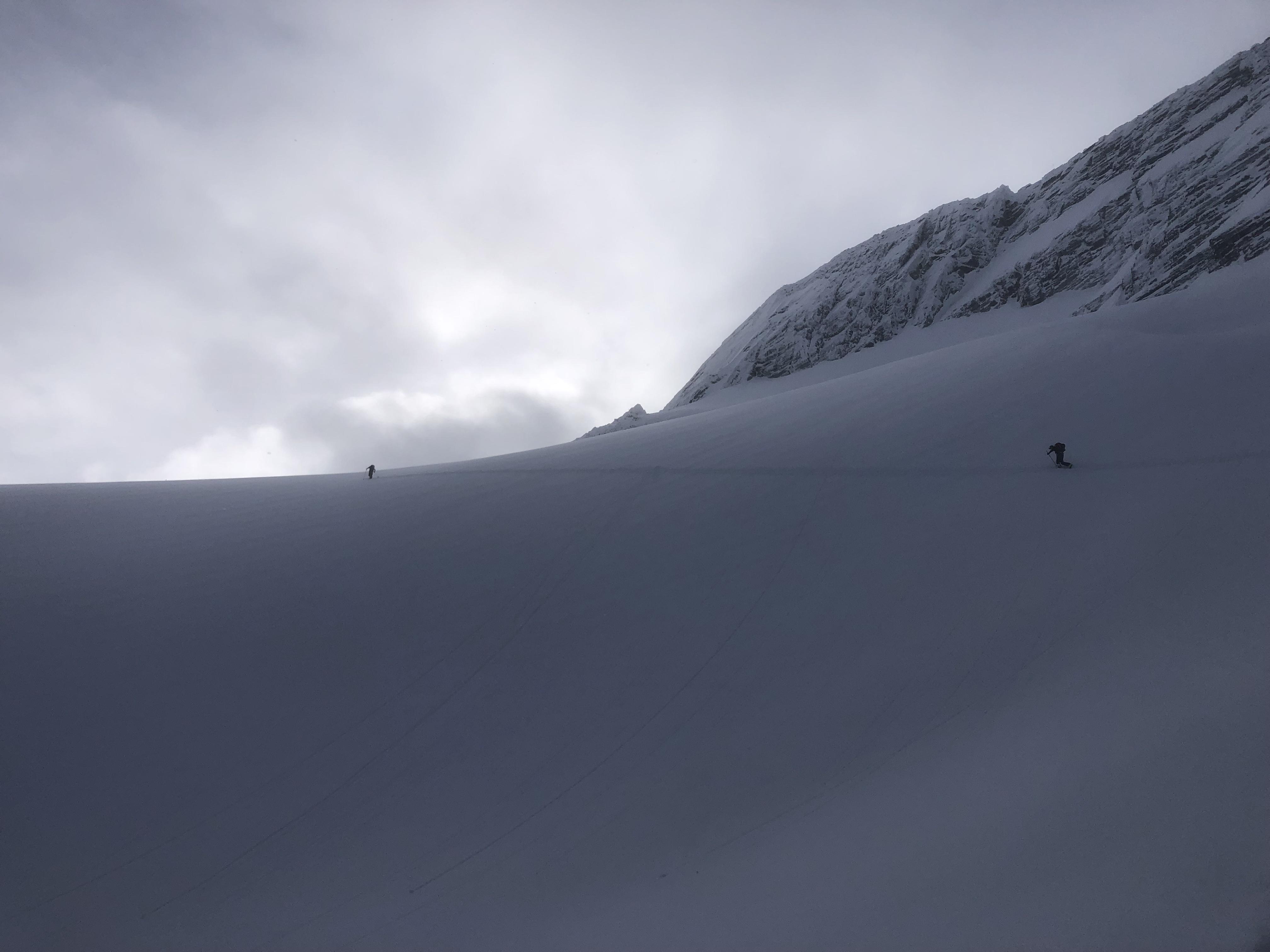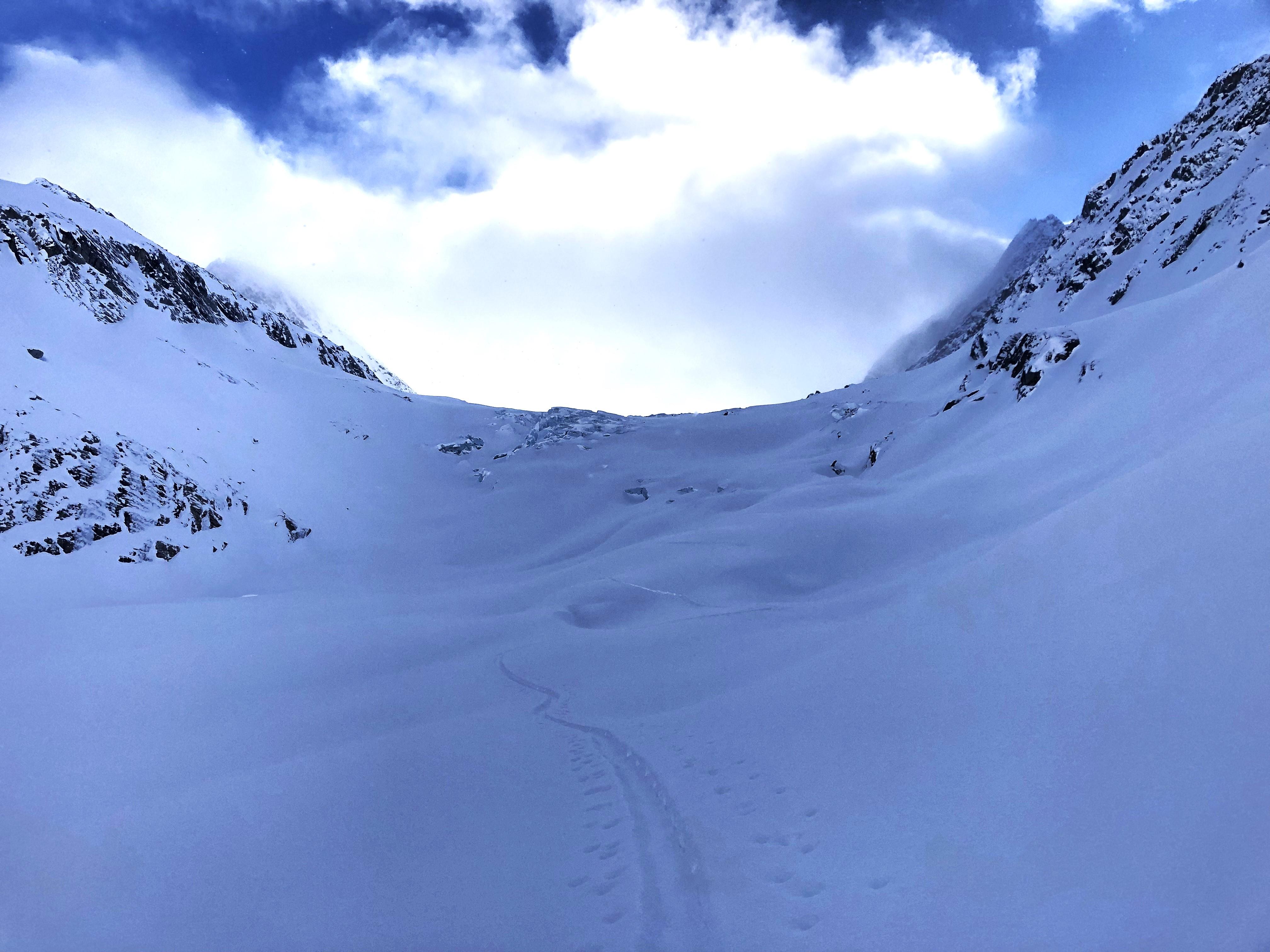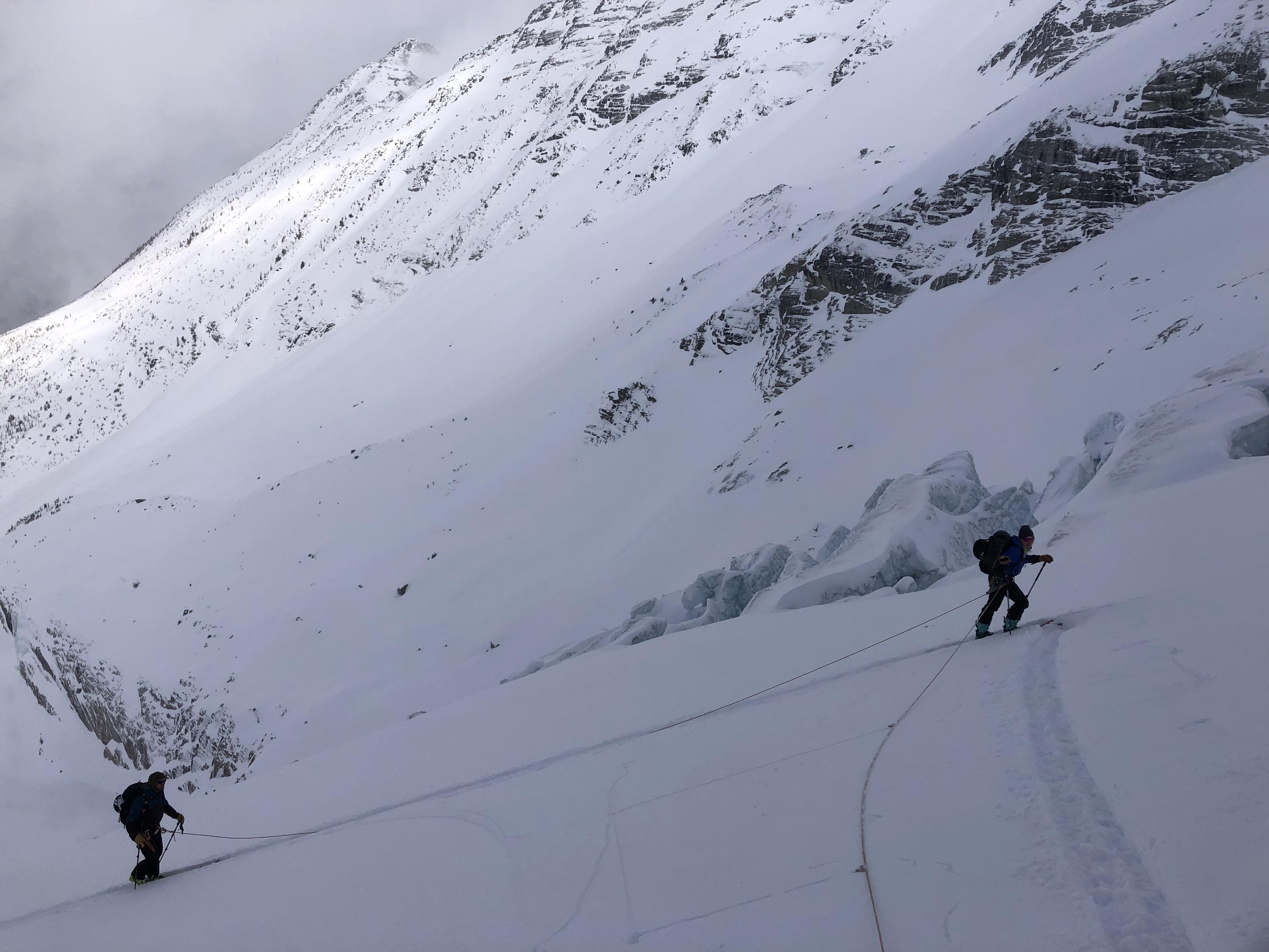 Day 3: Lily-Dome traverse. Another few cms of new snow. The Lily is in rough shape with lots of open crevasses and highly variable snow depth around the toe and crux roll. Similar snowpack observations as the previous days (no significant combination of shears/ slab, no wind effect) as we ascended the glacier. Rope was on, with average snow depths over 200 cm but as little as 130 cm in isolated areas. There was buried wind slab under the most recent storm snow on the immediate lee (Asulkan) side of the Dome col. Three days previous a party had ski cut a Sz 1 windslab right below the Dome col descending onto the cleaver. We opted to avoid the Dome Roll and instead skied the more conservative uptrack line. From the cleaver down the ski quality was amazing. We skied features as steep as 35 degrees but made sure we were skiing one at a time and tried to pick the least consequential lines.