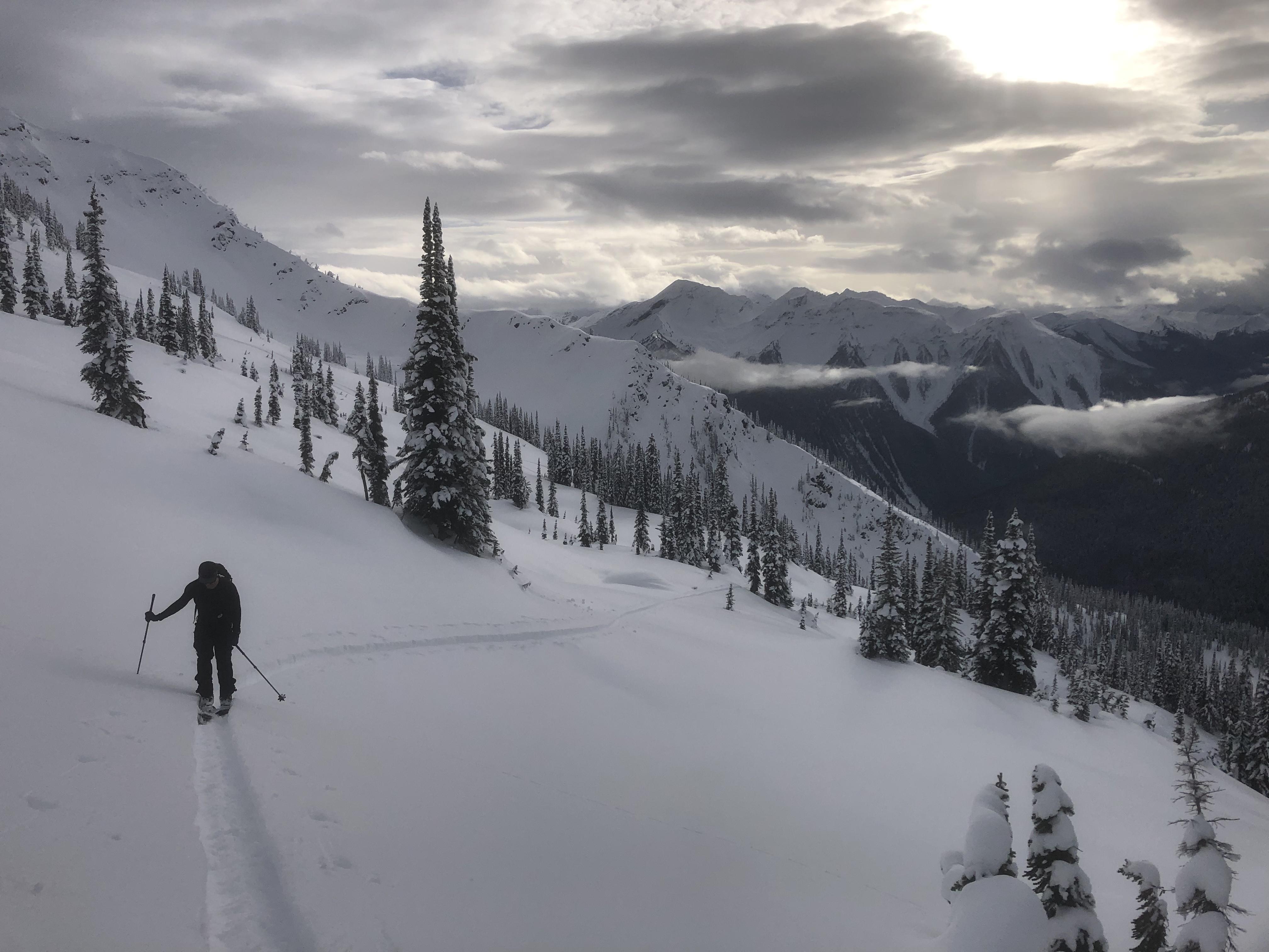 Day 2: McGill/ Bostock. A sunny start to the day, with a bullet-proof uptrack to ~1500 m. Ski crampons would have been nice, hopefully it’s on the mend with the new snow. Found the early/mid Jan SH down 35 cm near the top of the Gunbarrels, without much for slab properties above (that will change). We tried to pick a conservative line down from ridgetop skiing one-at-a-time before entering the Gunbarrels properly. Same ski quality as the day before, but a few more tracks to avoid. We spent the rest of the day skiing low angle glades, enjoying the simplicity of avoiding avalanche terrain (mostly). As the cold front moved in and the south aspects lost the sun, a sun crust formed. Exit was fast and firm!