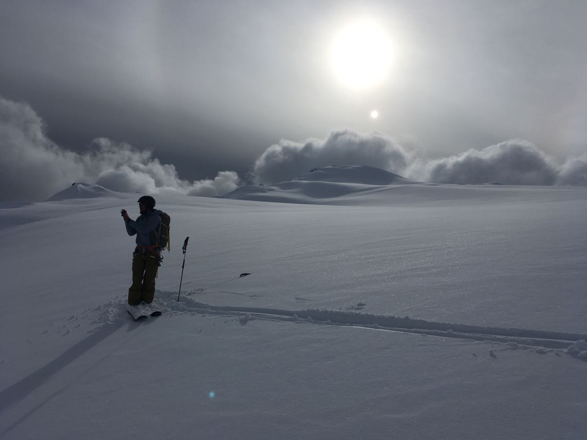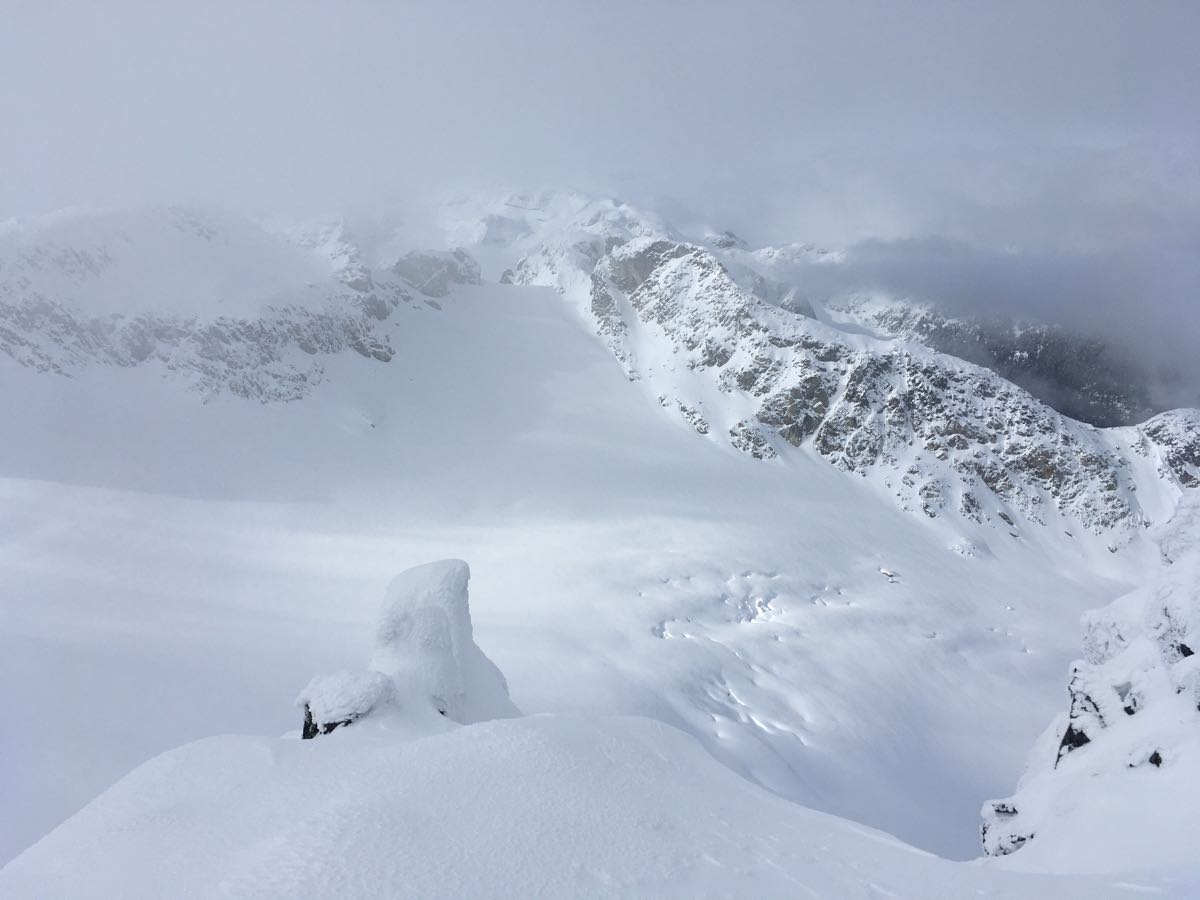 Summited Brandywine peak. Visibility was in and out and winds were calm. Skins on at 1400m with 30cm HS and 7-10cm on a semi supportive thin crust. The crust petered out above 1850m and ski pen averaged 10-15cm. On the glacier the HS was 160-190cm at 2030m. No new avalanches observed, some cracking in isolated wind affected areas with no propagation. I suspect there could be isolated winds slabs to be found in the right locations but mild temps are settling things fast. The sun still has some punch when it comes out, so some old snowballing observed and suspect variable conditions on solar aspects. No ski cut results and overall the snowpack felt well settled. Ski quality deteriorated below 1800m.