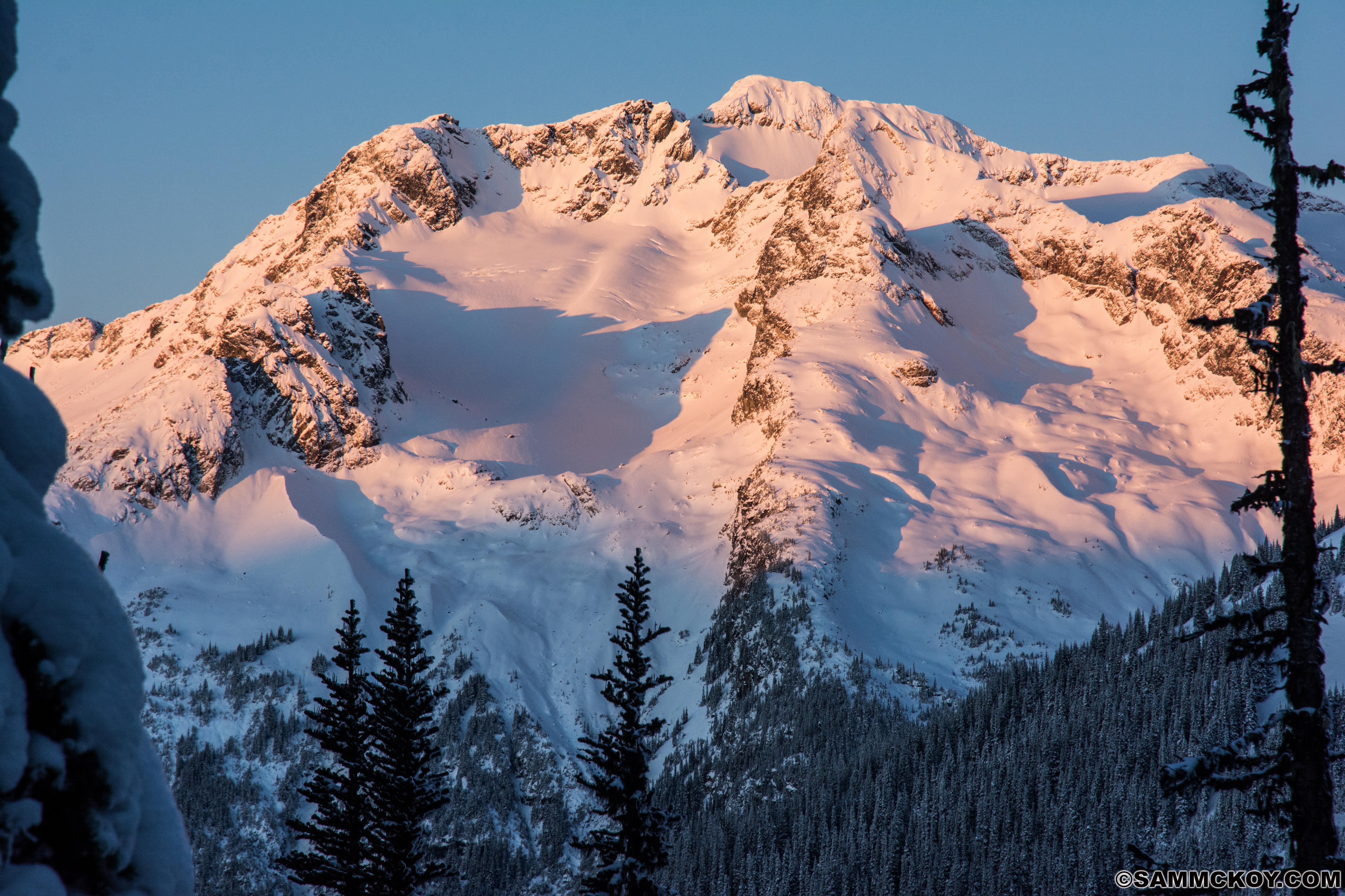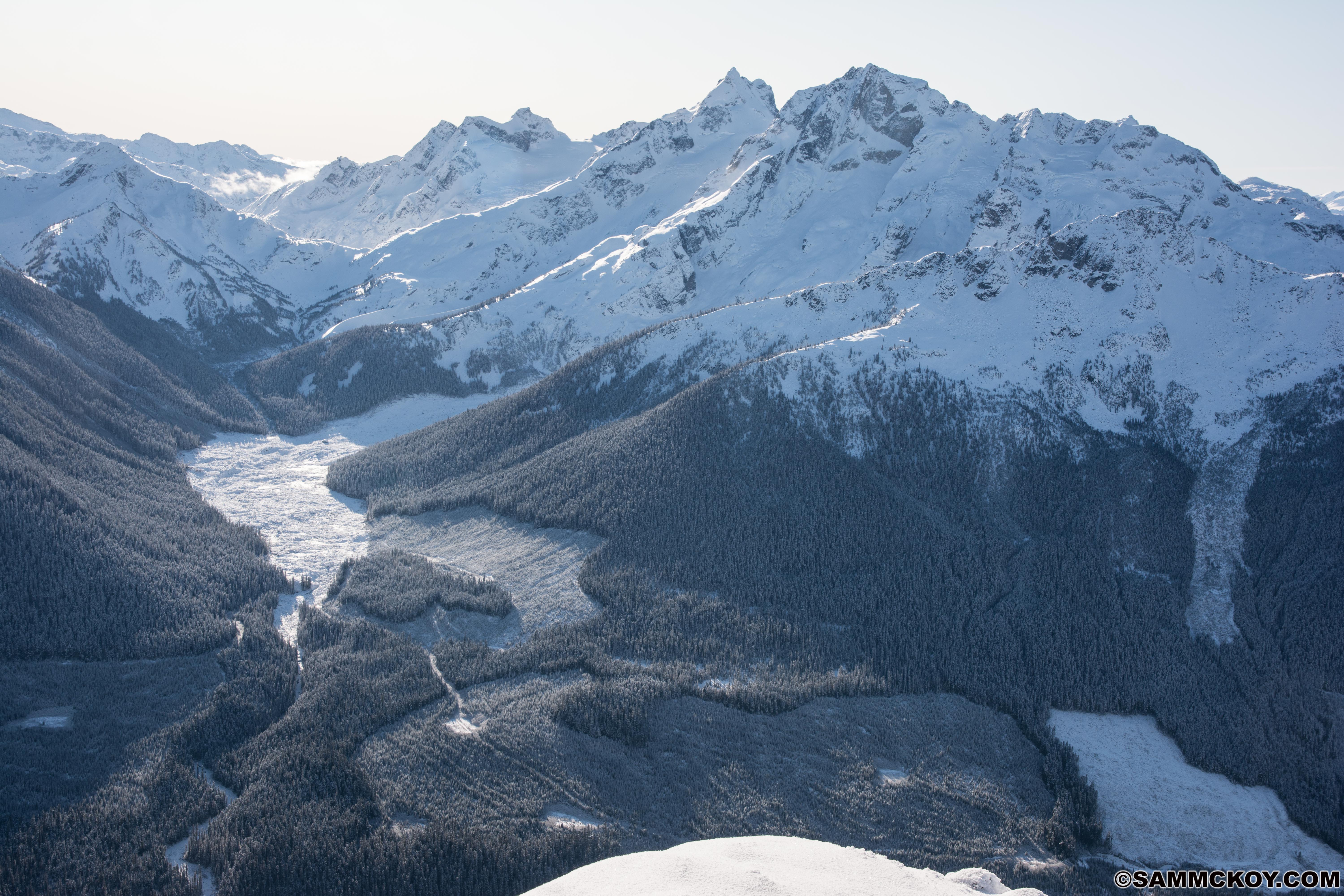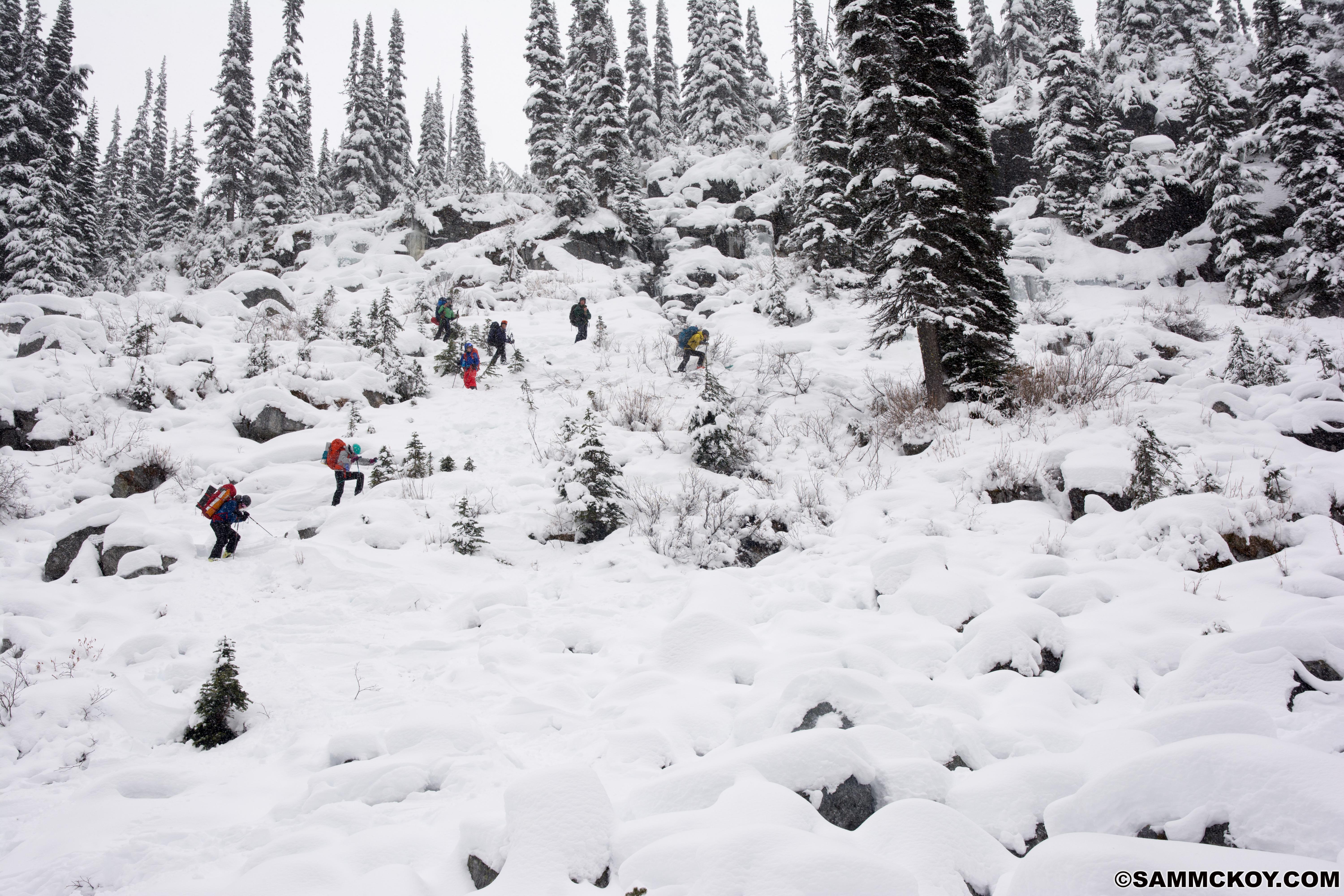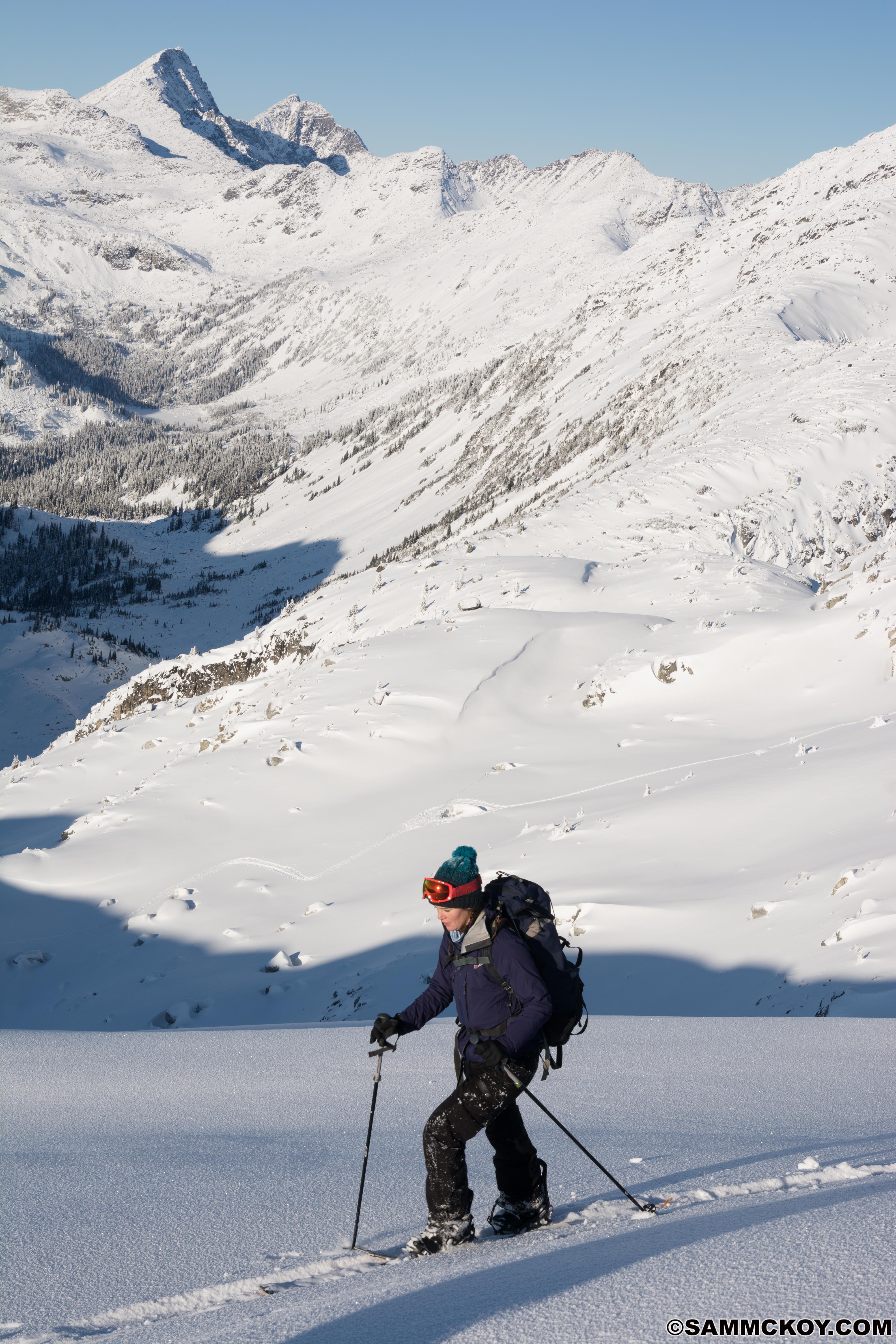 Early season conditions very much exist still and many features are unskiable. Low logging roads are easy travel but below 1700m bootpacking in the forests is still required. 1700-1900m involves travel with skis but can be challenging with surface roughness. There is 60-80cm of snow at these elevations.
