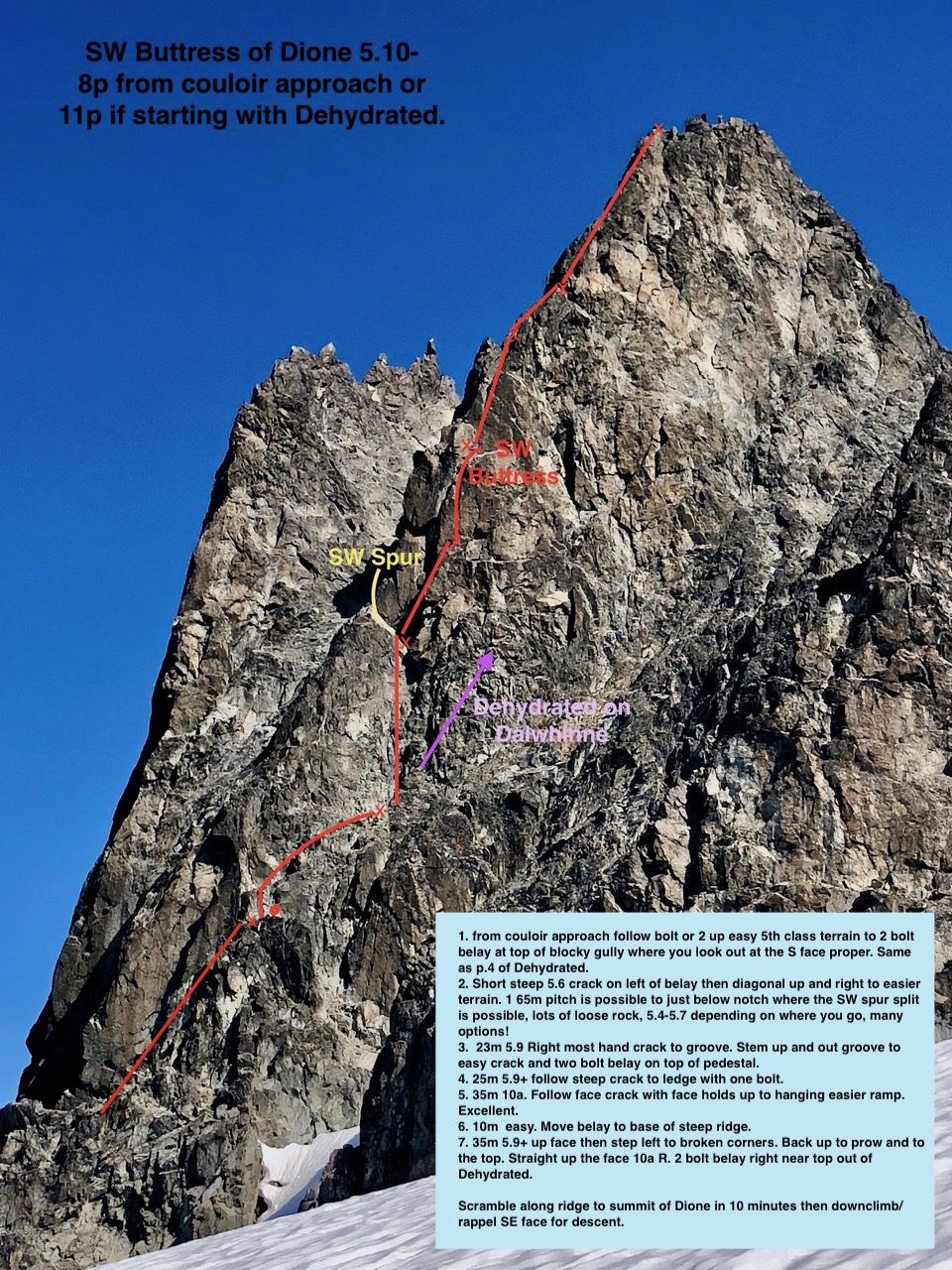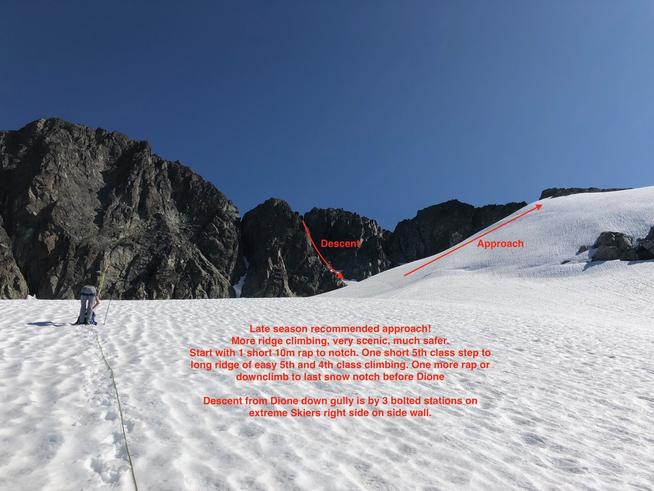 I have also attached a recommended approach/descent beta for Dione. All of the gully on the approach are prone to rock fall and can all be easily avoided with a more scenic, but also more time consuming ridge climb as shown by the photo and indicated in Alpine Select.