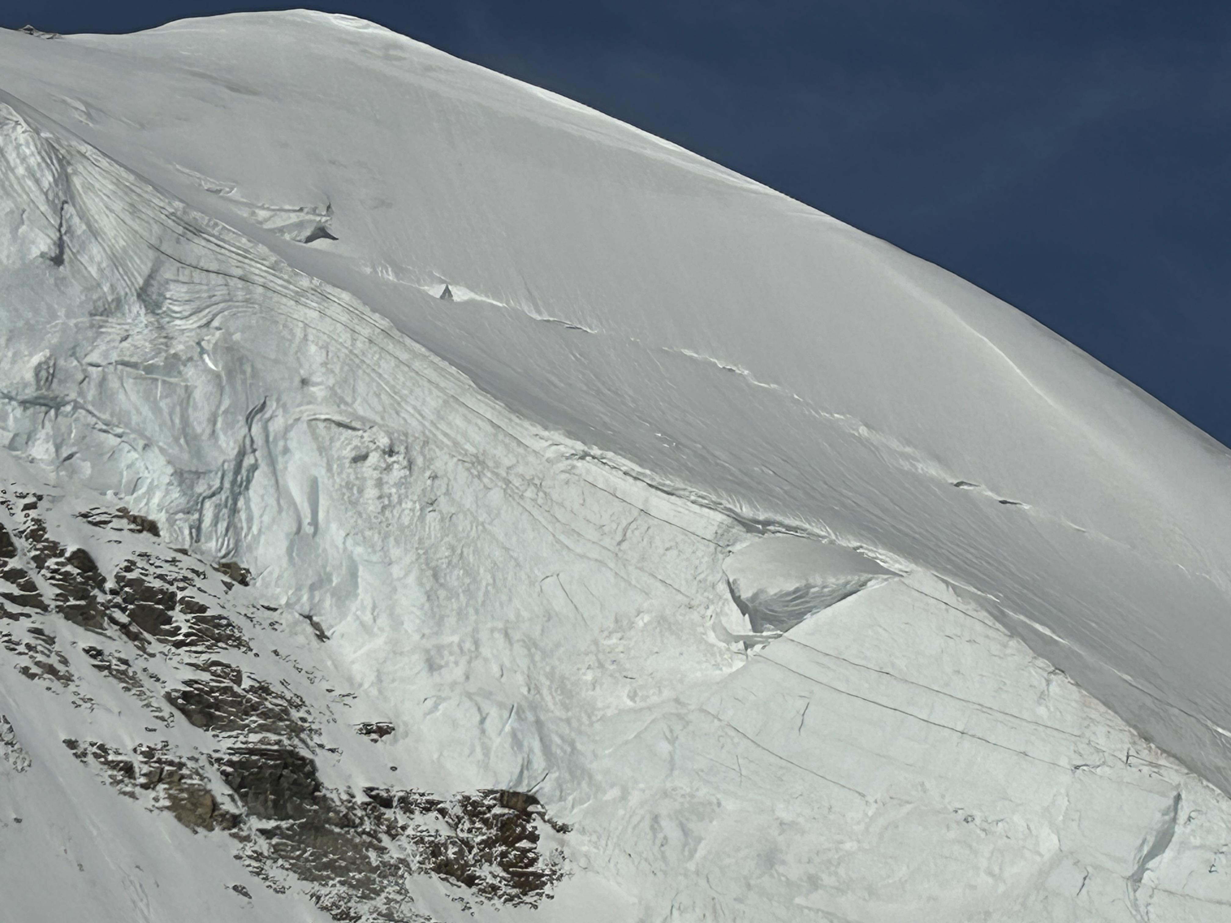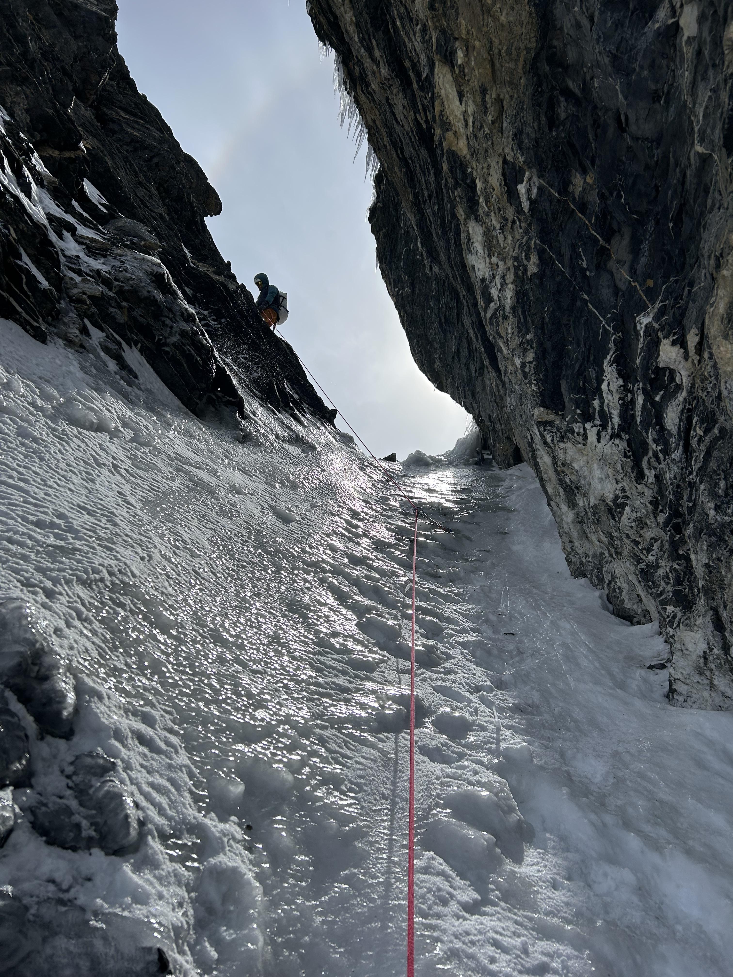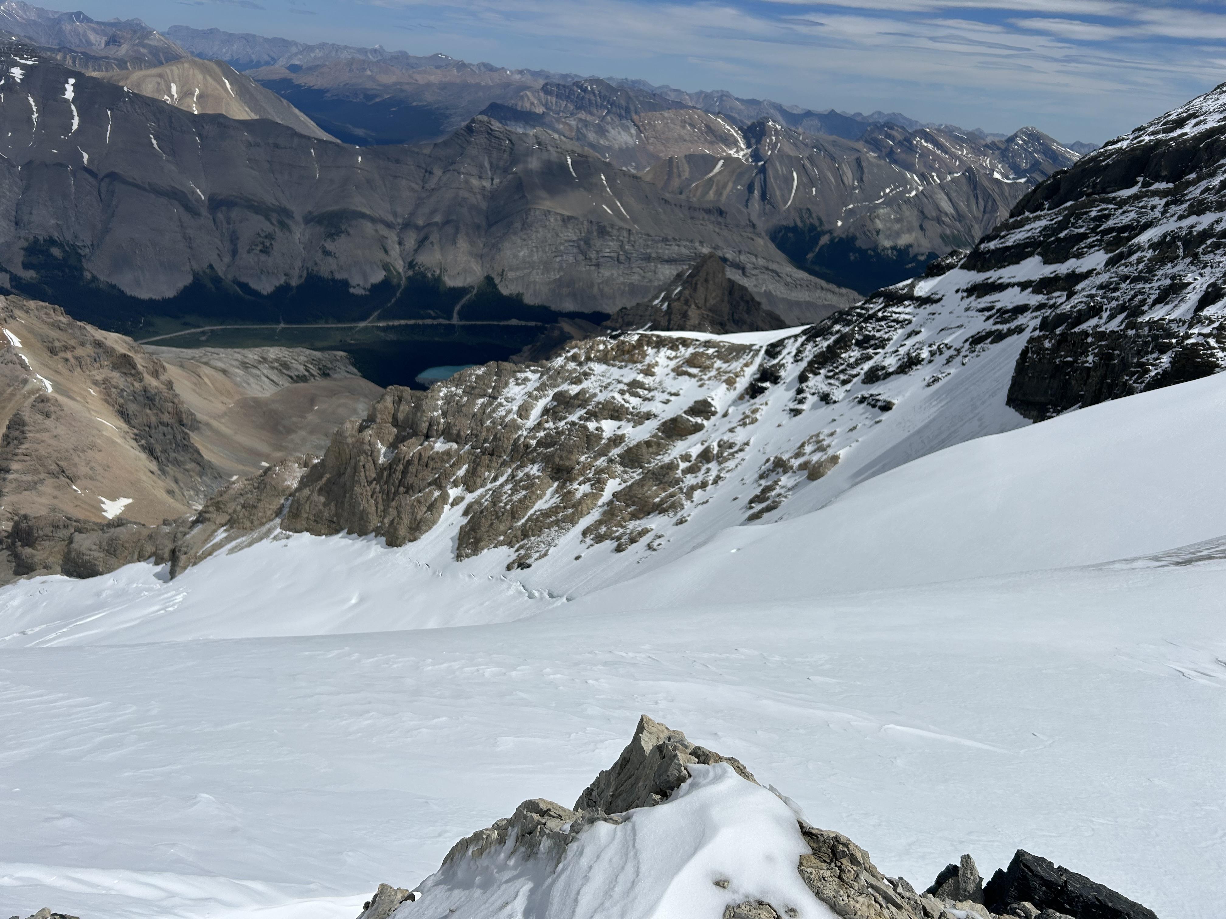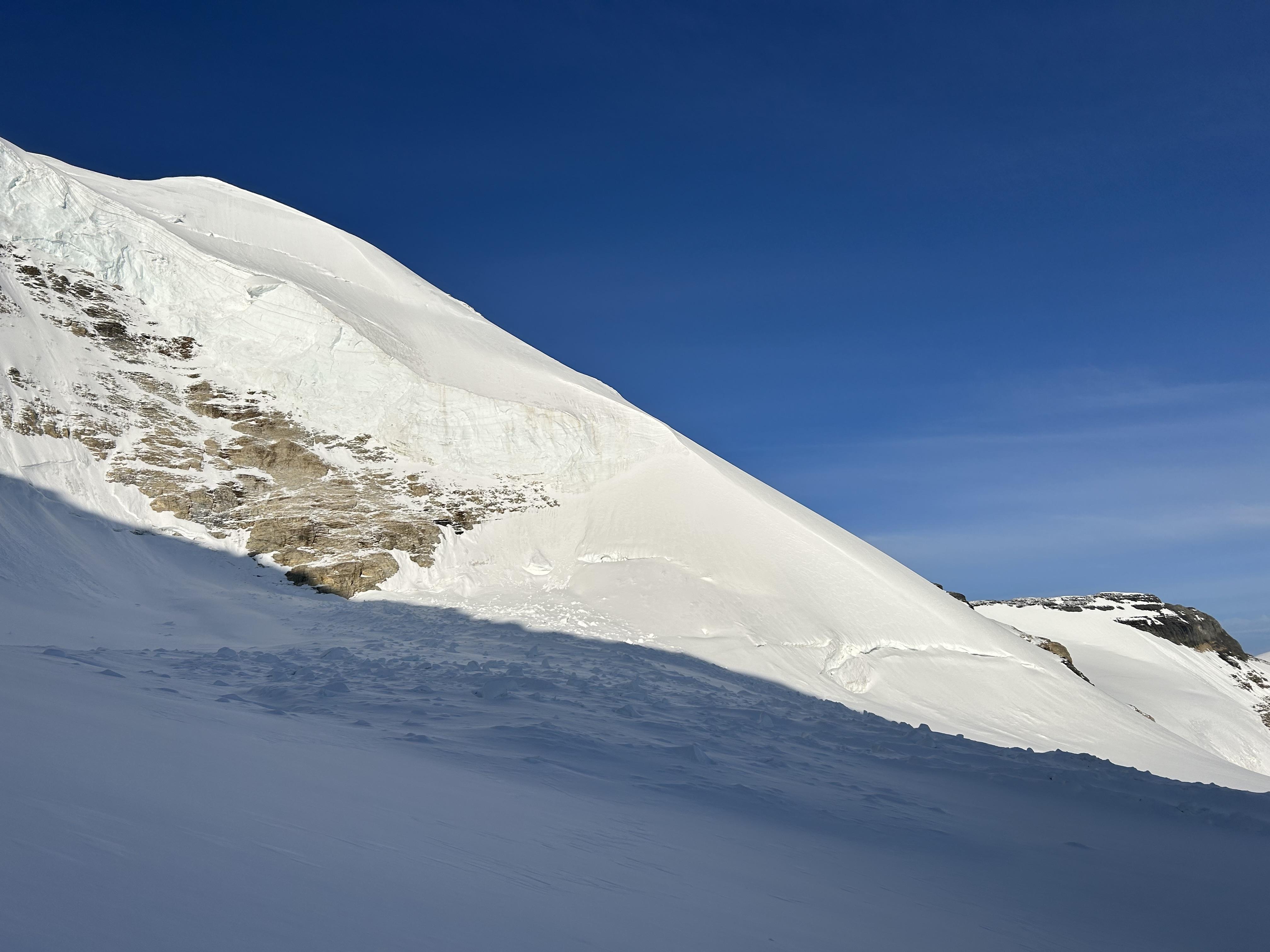 Great day on the N. Face bypass yesterday with Hamish and Kathy. We approached via the N. Glacier using the ledges and found straight forward travel up to the N. Face basin. Clear skies overnight and cool temps made for fast travel on a supportive crust and some hard work kicking steps up the bypass. The snow slope at the base of the black band has receded significantly adding an additional 10m of unprotected downslopy climbing to gain the ledge that leads to the Scottish gulley. There is an option to gain the ledge via a corner feature on the right and it is likely a better alternative. The Scottish gulley had ice/snice the entire length and the remaining ridge travel to the summit was relatively straight forward. We descend via the ramp route (getting steeper every year) with and easy crossing of the bergschrund and good steps. A great refreeze and a cool NE wind kept things locked in and we observed no natural avalanche activity or rockfall. A rare occurrence for July in comparison to the past few summer seasons. Photos of the N. Face basin, Scottish gulley, Silverhorn, Lingering Serac on Hourglass icefall and N. Face bypass slopes.